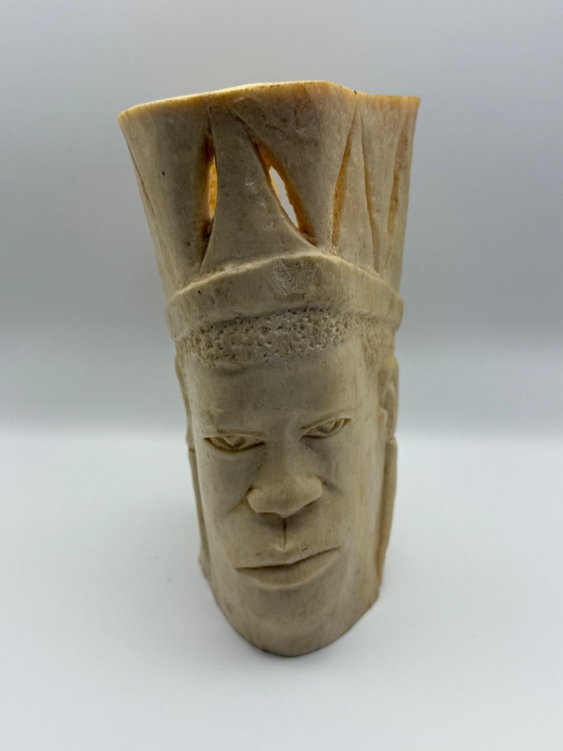 Hand-carved bust of a crowned figure rendered in natural bone, showcasing stylized facial features and a pierced triangular headdress. This piece reflects traditional African artisan techniques and cultural symbolism, likely crafted as a decorative or ceremonial object. Material: Carved bone Age: Vintage (mid to late 20th century) Style: African tribal with geometric crown motif Important Details: Approx. 6.5" H; finely detailed facial carving; pierced crown design; excellent condition