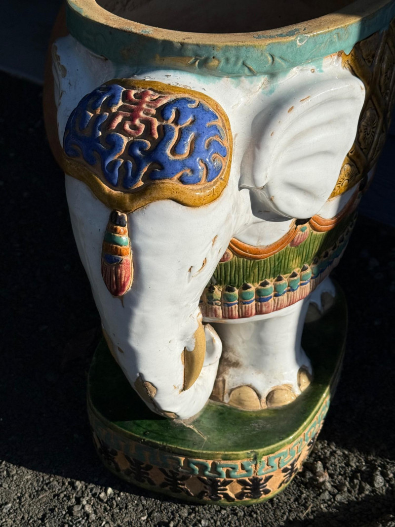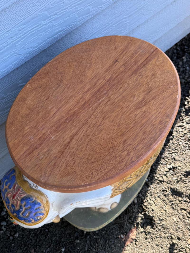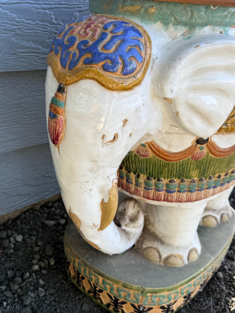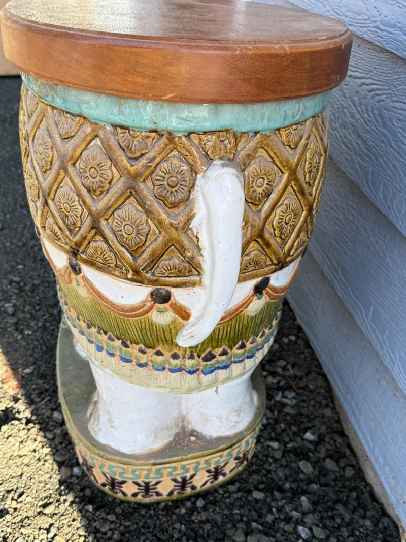 Ornate Elephant Ceramic StoolThis image shows a decorative elephant-shaped ceramic stool or side table placed outdoors on a gravel surface. The piece is artistically crafted with intricate detailing and vibrant colors, including gold, green, blue, and white.The elephant is designed with realistic features and is adorned with a patterned blanket-like motif across its back. The top surface is a smooth, round wooden platform, making it functional as a stool or small table. The base features geometric and floral designs in green and beige tones, adding to its ornate appearance.Overall, the object blends utility with cultural artistry, reflecting traditional Asian or Indian decorative styles. It stands out as a unique accent piece suitable for both indoor and outdoor settings.