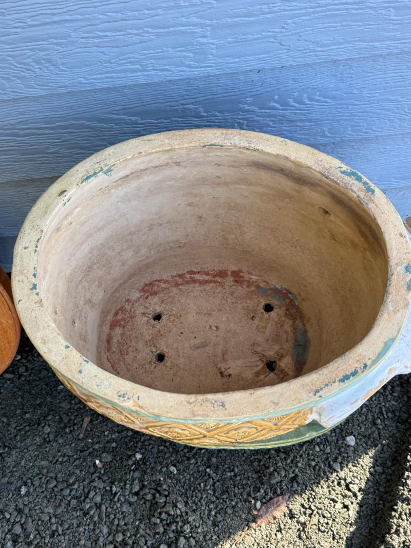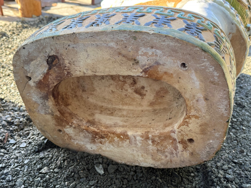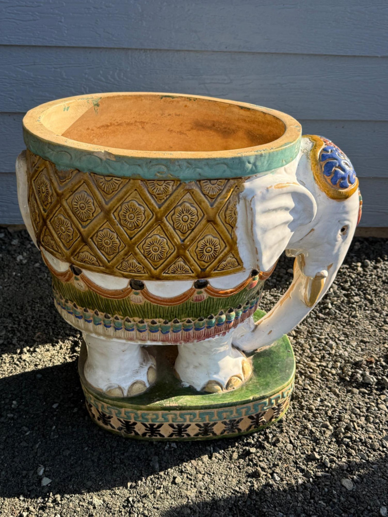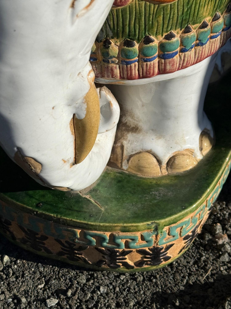 Ornate Elephant Ceramic StoolThis image shows a decorative elephant-shaped ceramic stool or side table placed outdoors on a gravel surface. The piece is artistically crafted with intricate detailing and vibrant colors, including gold, green, blue, and white.The elephant is designed with realistic features and is adorned with a patterned blanket-like motif across its back. The top surface is a smooth, round wooden platform, making it functional as a stool or small table. The base features geometric and floral designs in green and beige tones, adding to its ornate appearance.Overall, the object blends utility with cultural artistry, reflecting traditional Asian or Indian decorative styles. It stands out as a unique accent piece suitable for both indoor and outdoor settings.