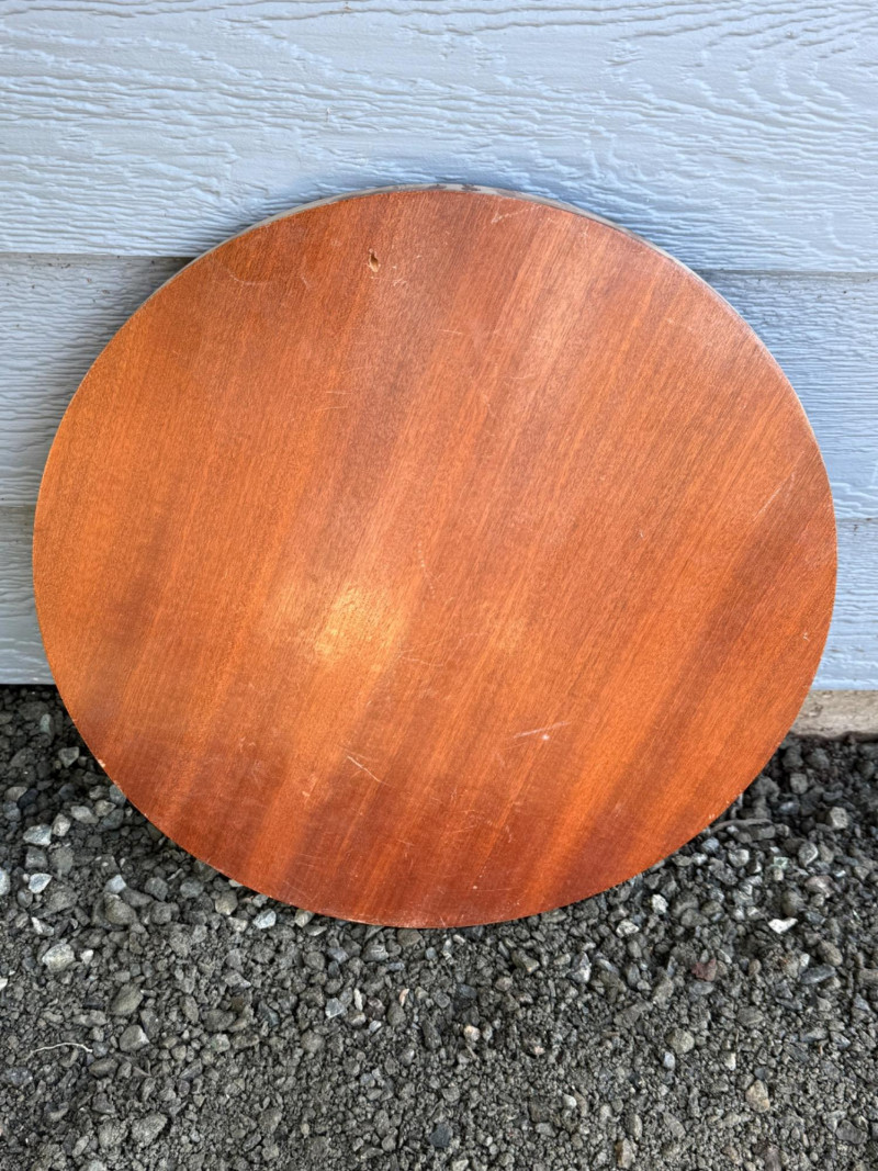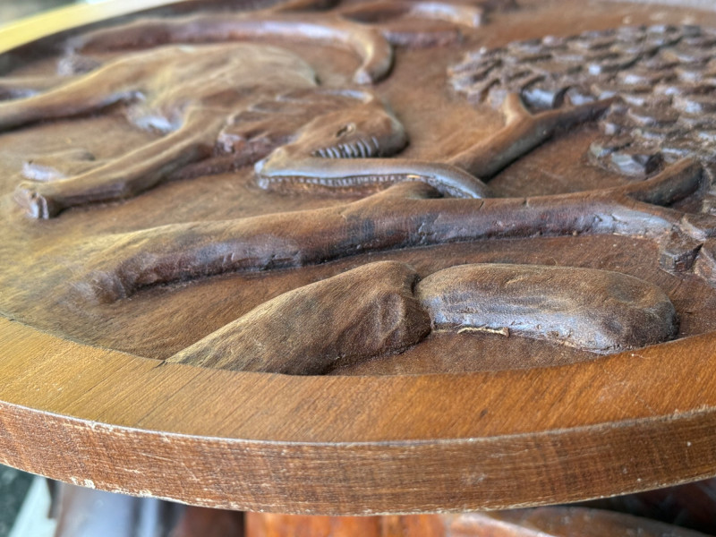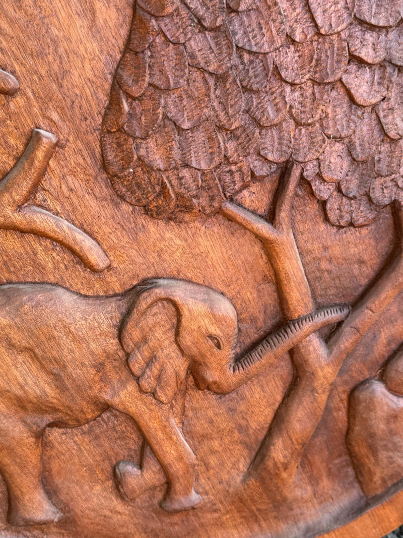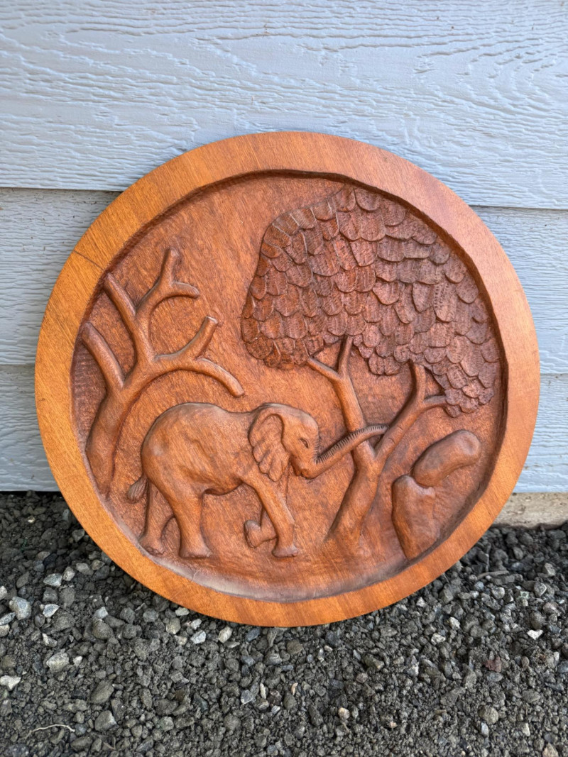 Intricately carved round wooden wall plaque featuring a nature scene with an elephant among trees. The elephant’s trunk reaches toward a textured tree canopy, framed by bare branches and rocky terrain. The carving showcases detailed textures in the elephant’s skin, tree bark, and foliage, all rendered in high relief. A striking piece of African-inspired craftsmanship, ideal for wall display or thematic decor. Important Details: Material: Solid carved wood Dimensions: Approx. 18" diameter Design Features: Elephant in forest scene High-relief carving with layered depth Textured foliage, bark, and terrain