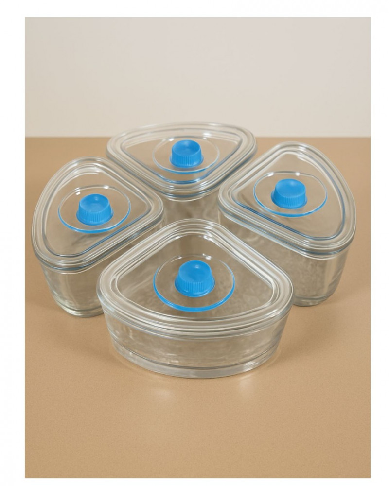 Set of four vintage Scurlock Kontanerette refrigerator dishes, each crafted in a unique triangular shape with matching clear lids. Each lid features a central blue knob for easy handling and secure closure. These mid-century glass containers are both functional and visually striking, ideal for retro kitchen display or practical cold storage. Their space-saving geometry and distinctive design make them a standout in collectible glassware. Important Details: Maker: Scurlock Material: Molded glass with plastic knob lids Dimensions: Approx. 5.5" L × 3.5" W × 2.5" H each Design Features: Triangular shape for compact stacking Clear lids with blue central knobs Vintage mid-century styling