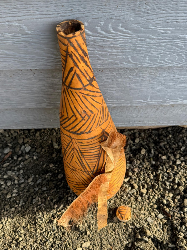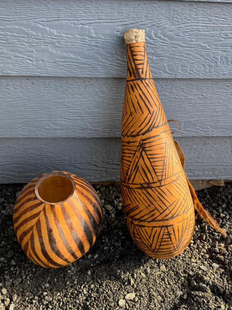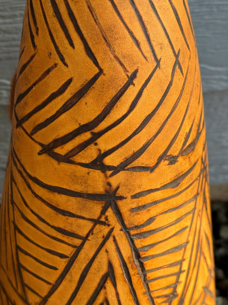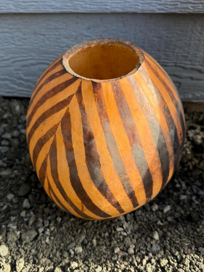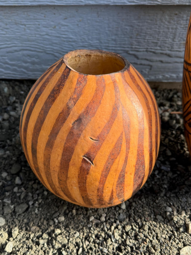 The objects in the image are hand-painted or hand-carved decorative gourds, also known as calabashes, featuring a distinct black and orange geometric or tribal pattern. These types of items are a form of folk art found in various cultures around the world, particularly in Africa and among indigenous peoples of the Americas. Gourd Art DetailsMaterial: The vessels are made from dried, hard-shell gourds (calabashes).Design: They showcase intricate geometric patterns in black over a natural or dyed orange/brown background. This style, often involving pyrography (woodburning) and carving, is characteristic of traditional African craftsmanship, particularly among certain Fulani peoples in Nigeria.