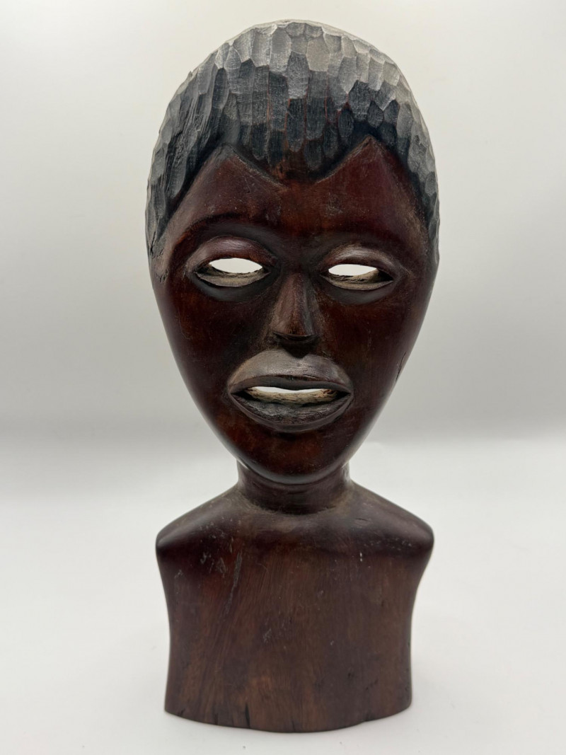 Expressive carved bust of a stylized African figure, rendered in dark wood with exaggerated facial features and textured hair. The sculpture features prominent lips, a broad nose, and hollowed eyes, with the hair represented through chiseled vertical grooves. The shoulders are subtly defined, and the overall form emphasizes bold contours and cultural symbolism. A striking example of traditional tribal carving, ideal for display in ethnographic or art-focused collections. Important Details: Material: Carved hardwood with dark finish Dimensions: Approx. 10" H × 6" W Design Features: Stylized facial features: broad nose, full lips, hollow eyes Textured hair carved in vertical grooves Smooth finish with subtle shoulder shaping