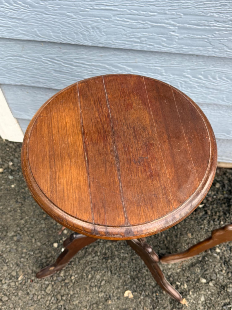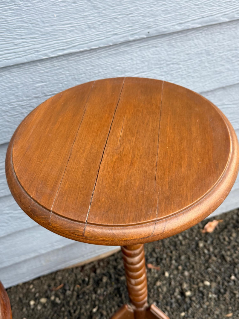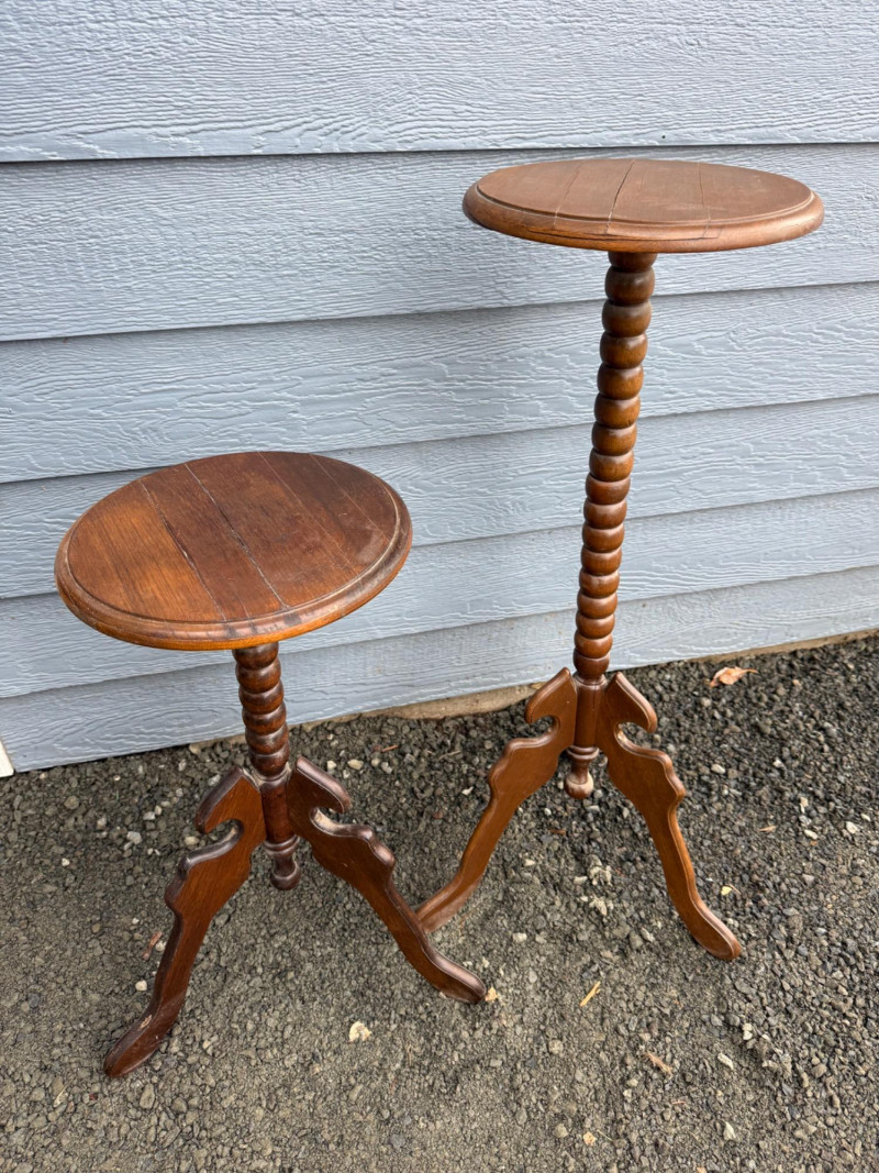 Elegant pair of vintage wooden pedestal side tables featuring round tops, turned central columns, and tripod bases with curved legs. The taller table offers a stately silhouette, while the shorter companion adds layered dimension for display or accent use. Their classic design and warm wood tones make them ideal as plant stands, lamp tables, or decorative furniture in traditional or eclectic interiors. Important Details: Material: Solid wood with natural finish