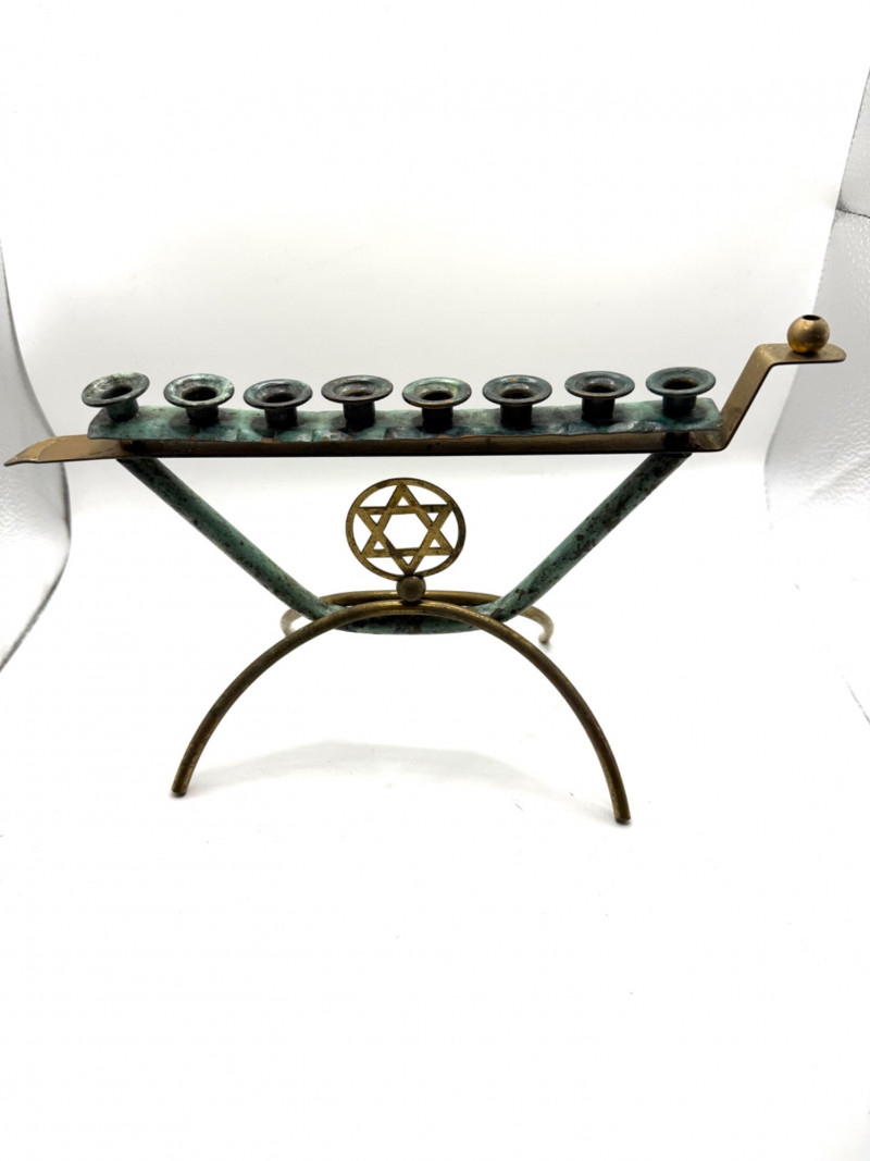 Traditional nine-branched Hanukkah menorah crafted in brass with a sculptural, patina-rich finish. The candle holders are arranged in a straight line with the shamash (helper candle) elevated and offset to the right. A decorative Star of David anchors the base, supported by curved metal legs that add elegance and stability. The brass has developed a natural green patina over time, enhancing its vintage character. A meaningful piece of Judaica, ideal for ceremonial use or cultural display. Important Details: Material: Brass with aged patina Dimensions: Approx. 11.5" L × 7" W × 3" H Design Features: Nine candle holders: eight for Hanukkah nights, one elevated shamash Star of David embellishment at center base Curved metal legs for decorative support Straight-line arrangement with offset shamash