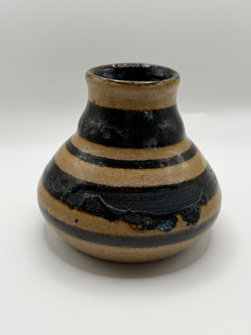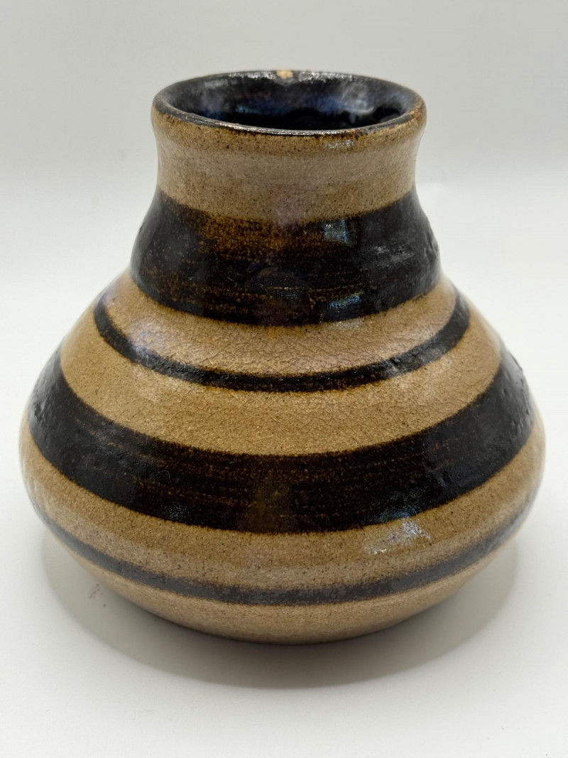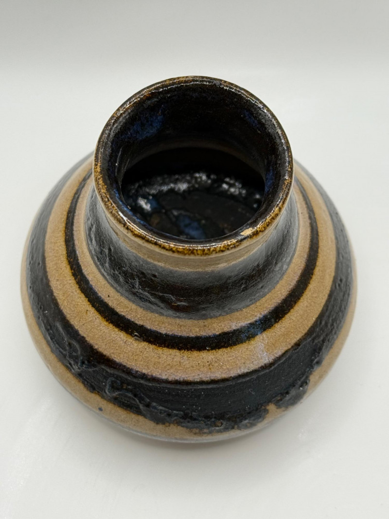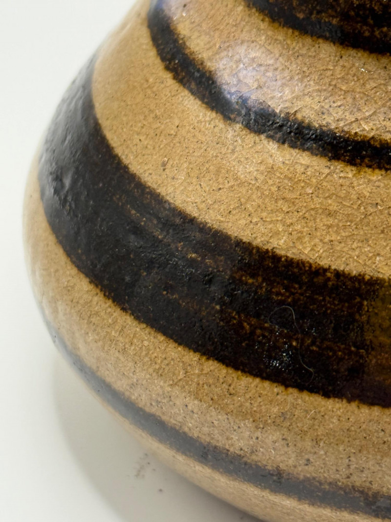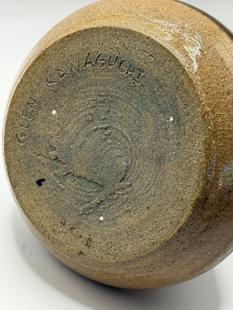 Elegant studio pottery vase by Glen Kawaguchi, featuring alternating horizontal bands of matte beige and glossy black. The rounded body and narrow neck create a balanced silhouette, while the hand-applied stripes add visual rhythm and tactile contrast. Kawaguchi’s signature style blends modern minimalism with earthy texture, making this piece ideal for collectors of Pacific Northwest ceramics or contemporary studio pottery. Important Details: Artist: Glen Kawaguchi Material: Handcrafted ceramic