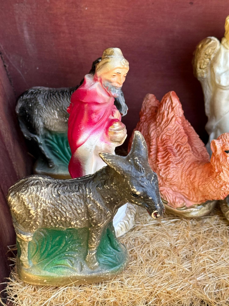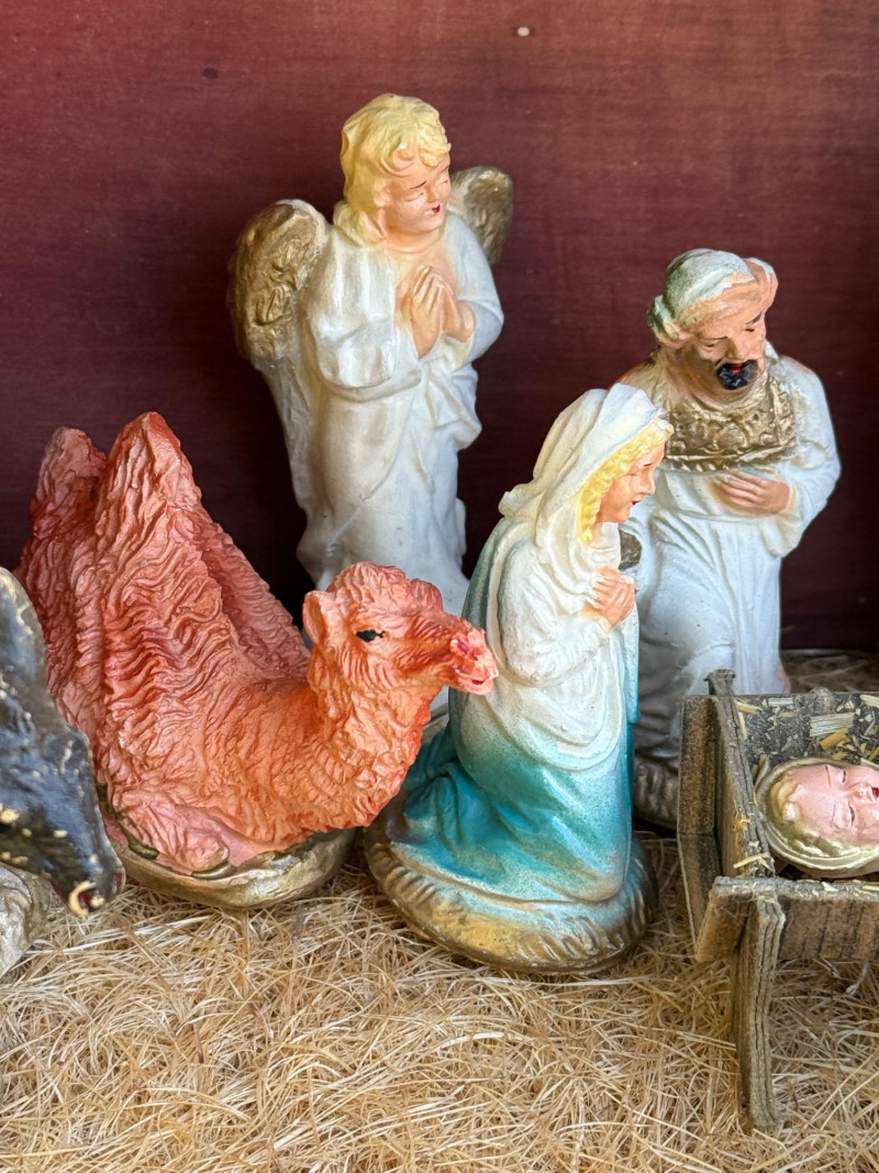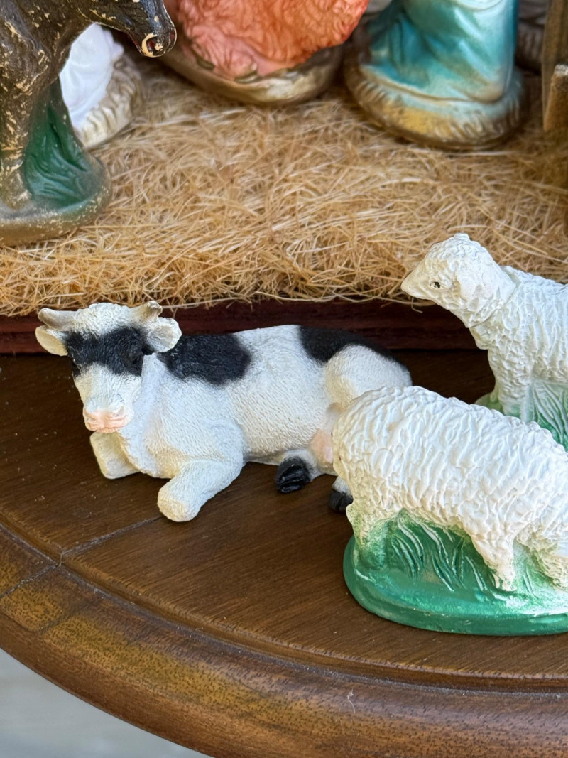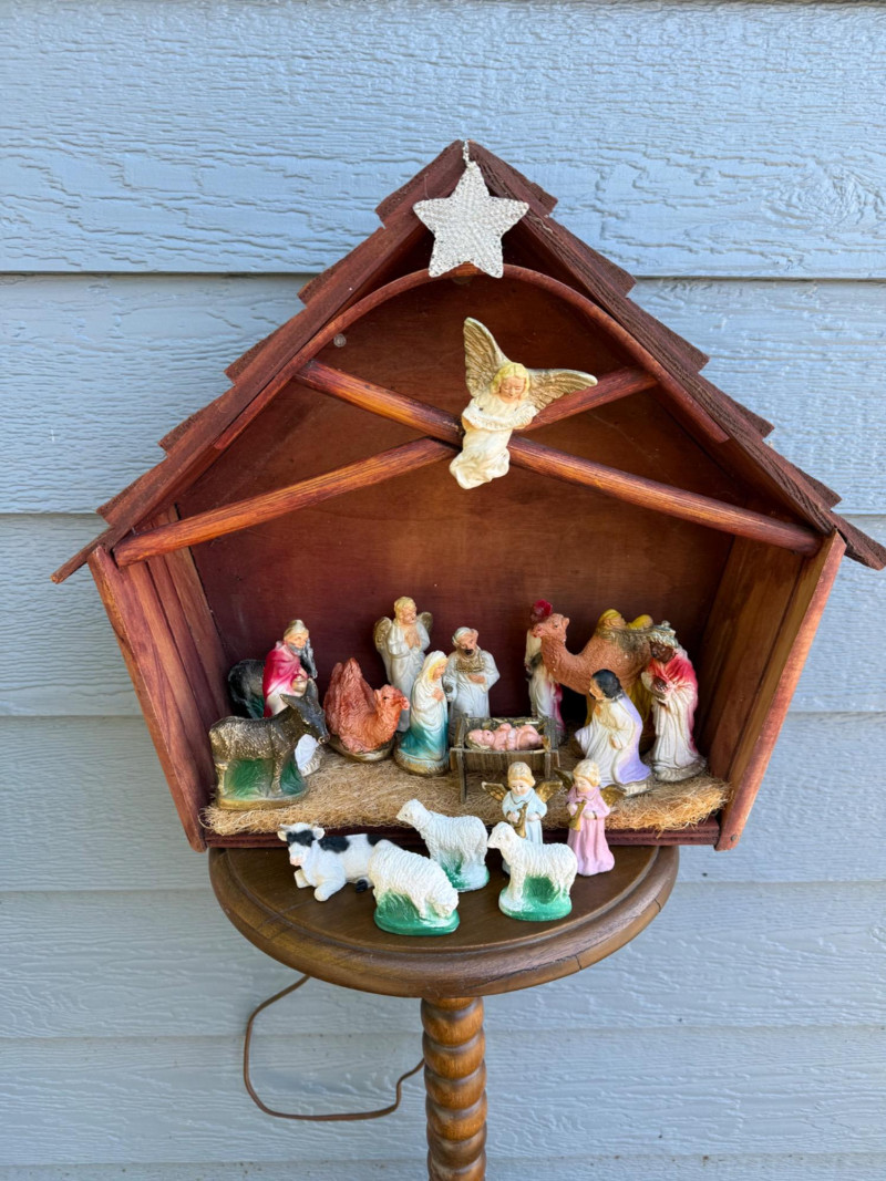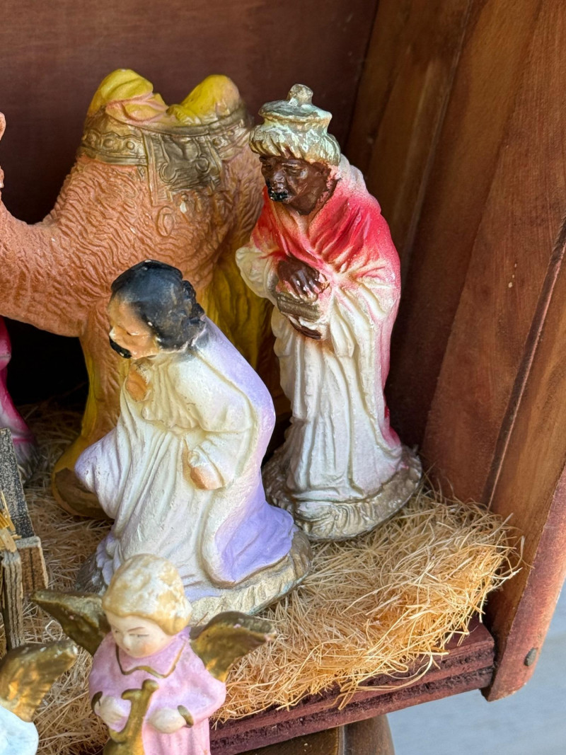 Vintage Nativity Set: A Handcrafted Celebration of the Christmas Story This vintage nativity set is a charming, handcrafted display that captures the essence of the biblical nativity scene with warmth and detail. Arranged on a small round wooden table, the set features a wooden stable structure topped with a white star and a suspended angel figure, symbolizing divine presence and guidance. Stable Structure: Made of wood with a rustic finish, the stable serves as the central frame for the scene. The white star at the top represents the Star of Bethlehem, guiding the Wise Men to the birthplace of Jesus. Angel: Hanging inside the stable, the angel adds a celestial touch, often symbolizing the announcement of Christ’s birth to the shepherds. Holy Family: At the heart of the scene are figurines of Mary, Joseph, and baby Jesus in a manger. Their placement reflects traditional Christian iconography, with Mary and Joseph flanking the infant. Three Wise Men: Positioned nearby, the Magi are depicted bearing gifts, honoring the newborn king. Shepherd and Animals: A shepherd figure stands among various animals, including a camel, donkey, and sheep inside the stable, with additional sheep and a cow placed outside. These figures evoke the humble setting of the nativity and the pastoral life surrounding it.Key Elements and Composition
