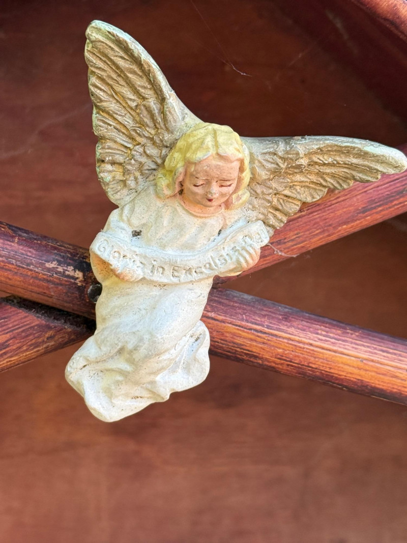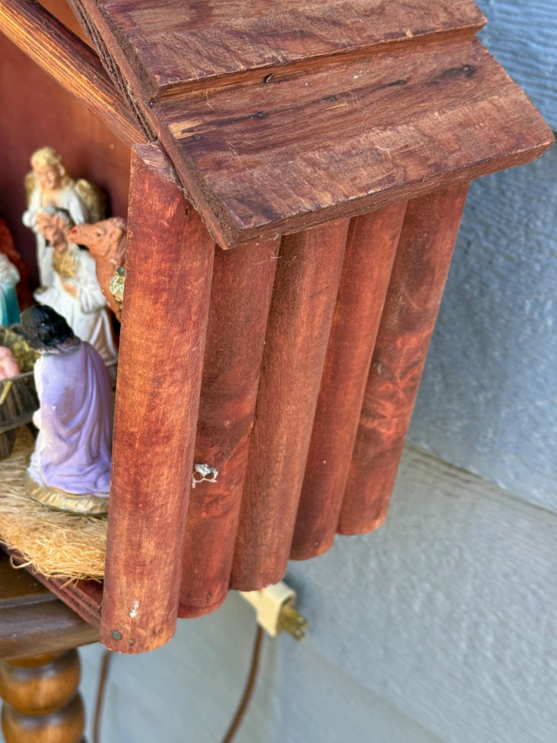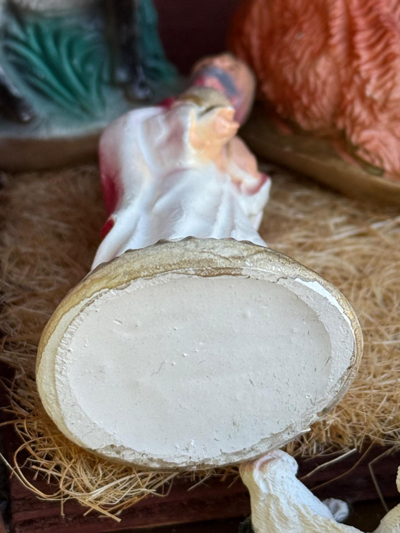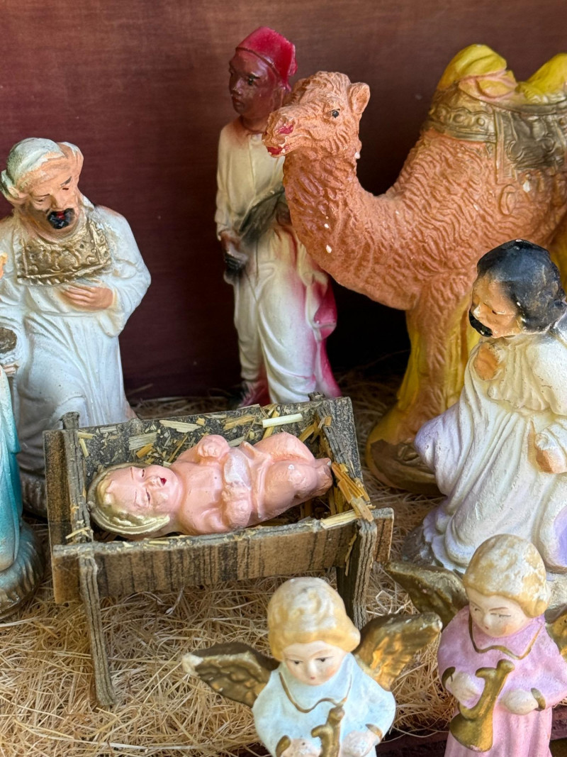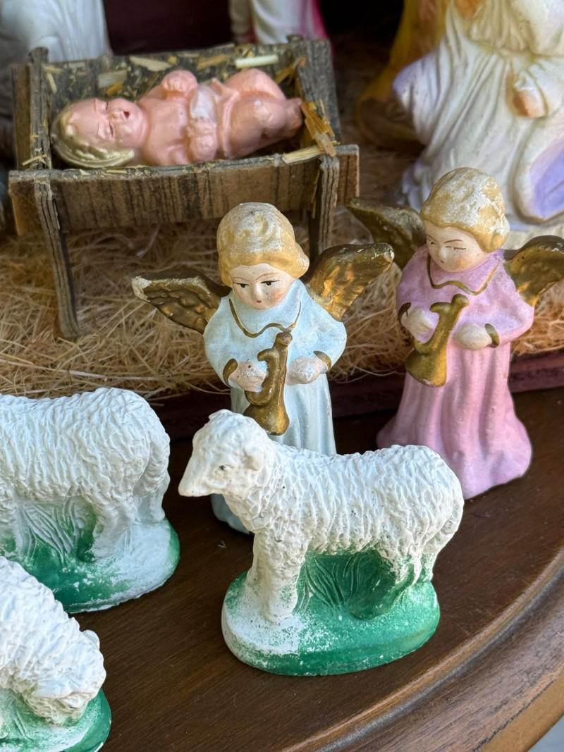 Vintage Nativity Set: A Handcrafted Celebration of the Christmas Story This vintage nativity set is a charming, handcrafted display that captures the essence of the biblical nativity scene with warmth and detail. Arranged on a small round wooden table, the set features a wooden stable structure topped with a white star and a suspended angel figure, symbolizing divine presence and guidance. Stable Structure: Made of wood with a rustic finish, the stable serves as the central frame for the scene. The white star at the top represents the Star of Bethlehem, guiding the Wise Men to the birthplace of Jesus. Angel: Hanging inside the stable, the angel adds a celestial touch, often symbolizing the announcement of Christ’s birth to the shepherds. Holy Family: At the heart of the scene are figurines of Mary, Joseph, and baby Jesus in a manger. Their placement reflects traditional Christian iconography, with Mary and Joseph flanking the infant. Three Wise Men: Positioned nearby, the Magi are depicted bearing gifts, honoring the newborn king. Shepherd and Animals: A shepherd figure stands among various animals, including a camel, donkey, and sheep inside the stable, with additional sheep and a cow placed outside. These figures evoke the humble setting of the nativity and the pastoral life surrounding it.Key Elements and Composition