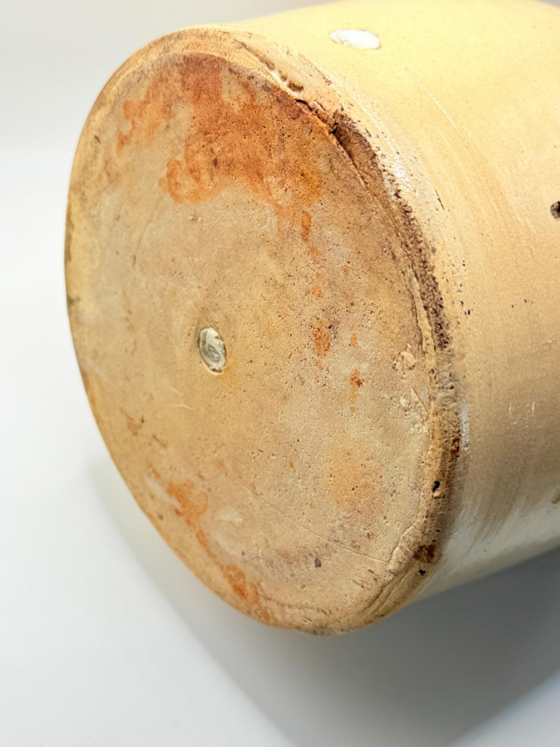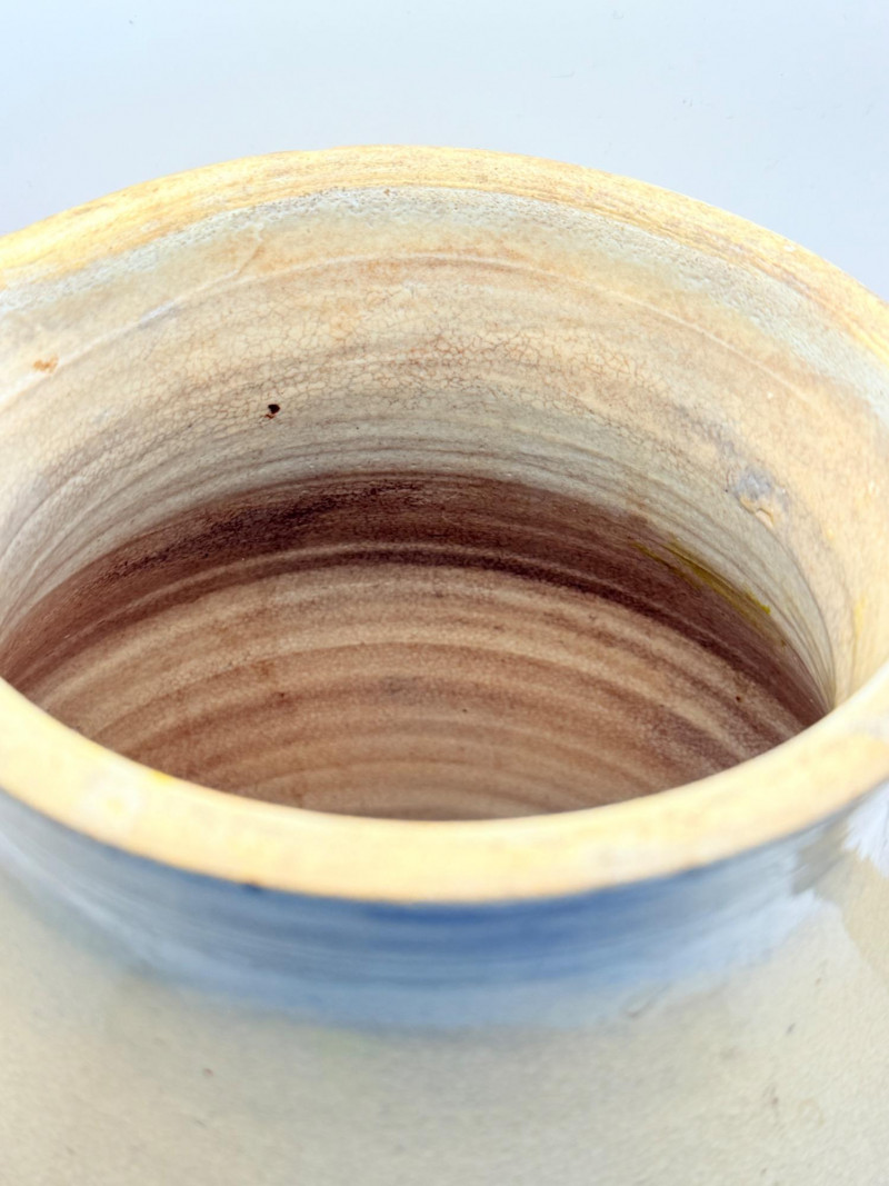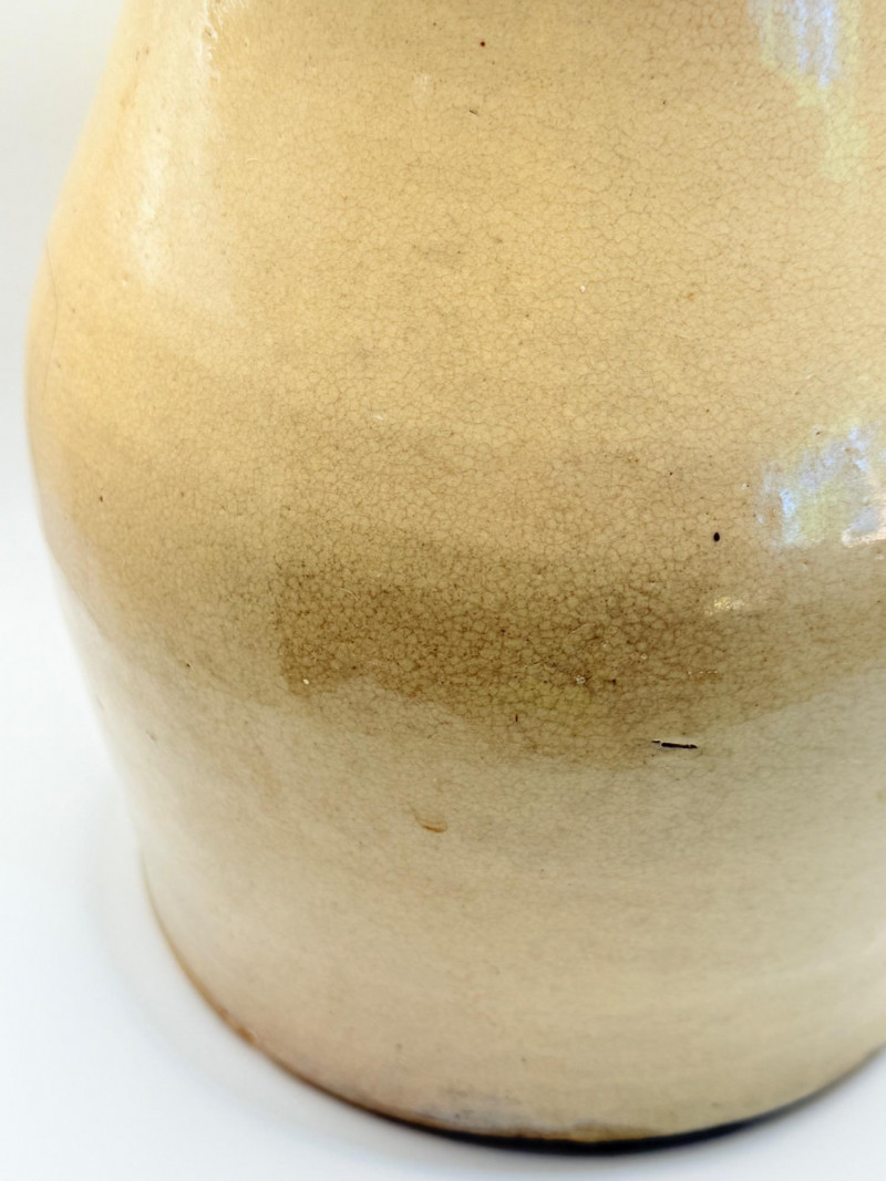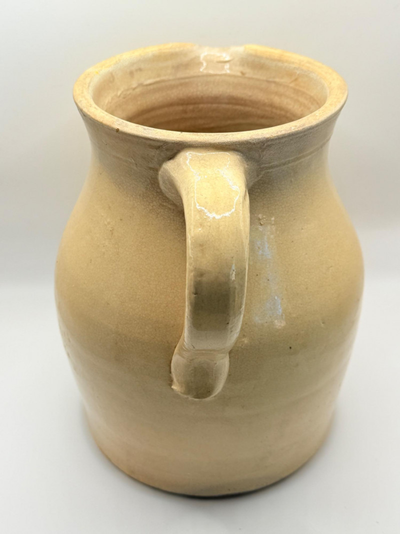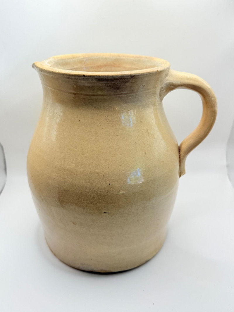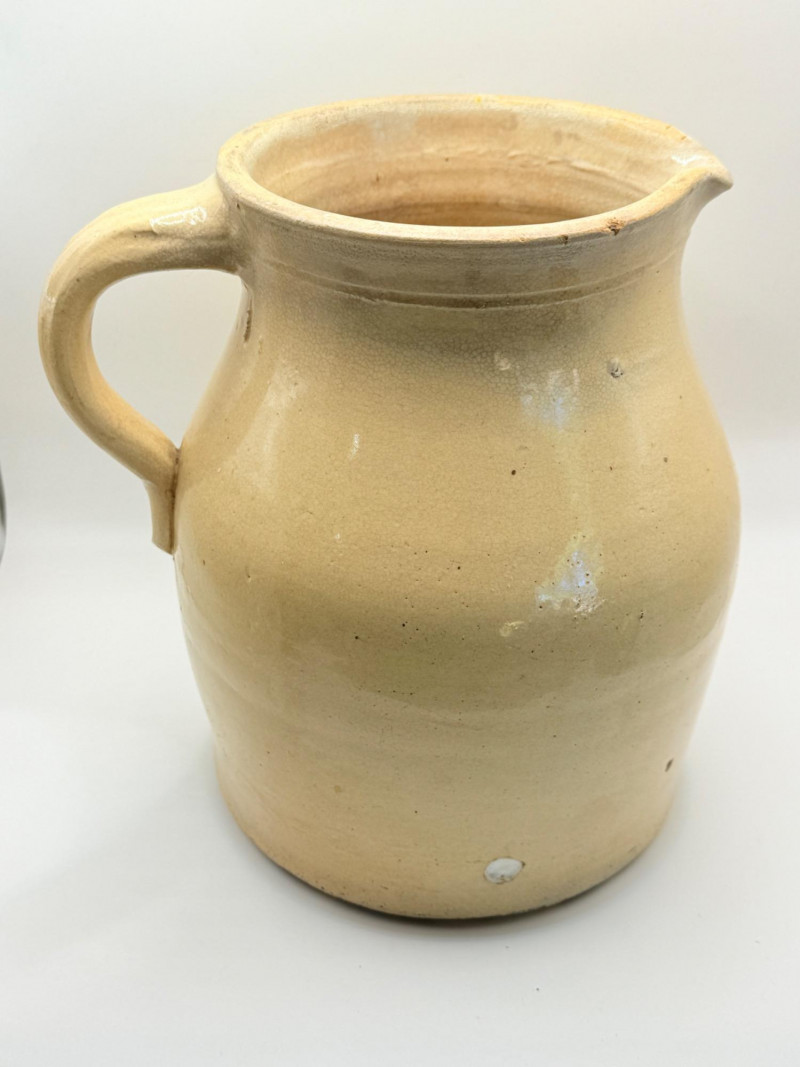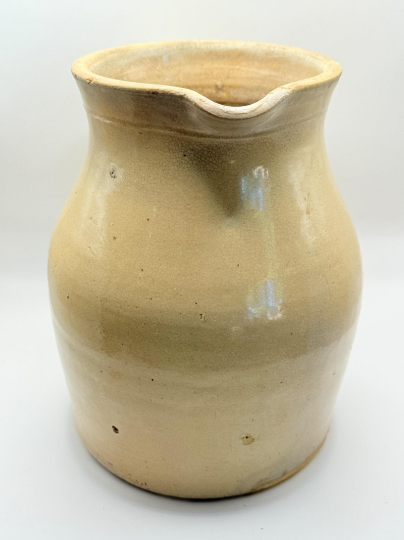 Classic antique stoneware pitcher with a rounded belly, single handle, and tapered spout. The surface features a soft beige glaze with subtle imperfections and age-related discoloration, adding to its handmade character. A utilitarian yet decorative piece, ideal for farmhouse display, primitive kitchen collections, or early American pottery enthusiasts. Important Details: Material: Glazed stoneware Dimensions: Approx. 6.5" H × 9" W Design Features: Rounded body with single handle Tapered spout for pouring Soft beige glaze with natural wear and patina