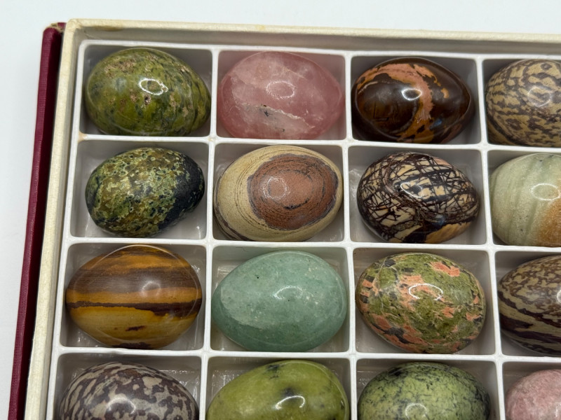 Striking collection of 25 polished gemstone eggs, each carved from a different mineral and arranged in a 5×5 grid within a fitted display box. The eggs showcase a wide range of natural colors, patterns, and textures—from banded agates and speckled jaspers to marbled stones and translucent quartz. A vibrant and tactile study in geological diversity, ideal for collectors, educators, or decorative display. Important Details: Material: Mixed polished minerals and semi-precious stones