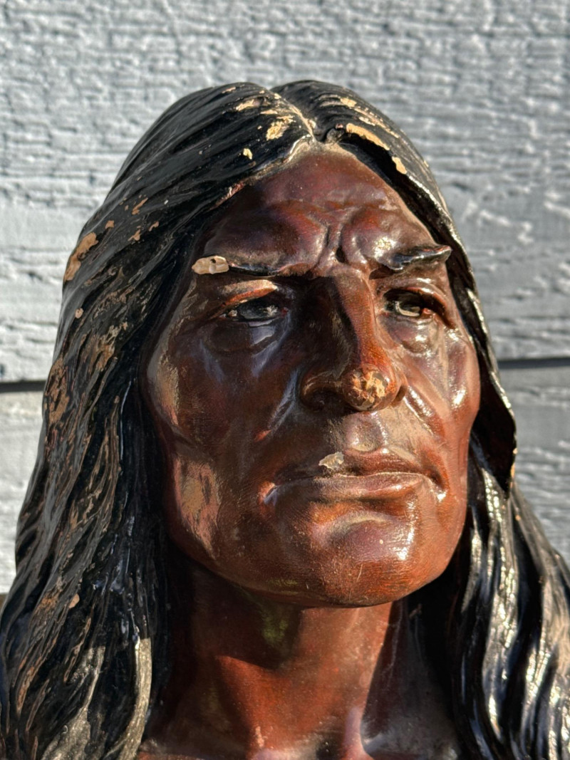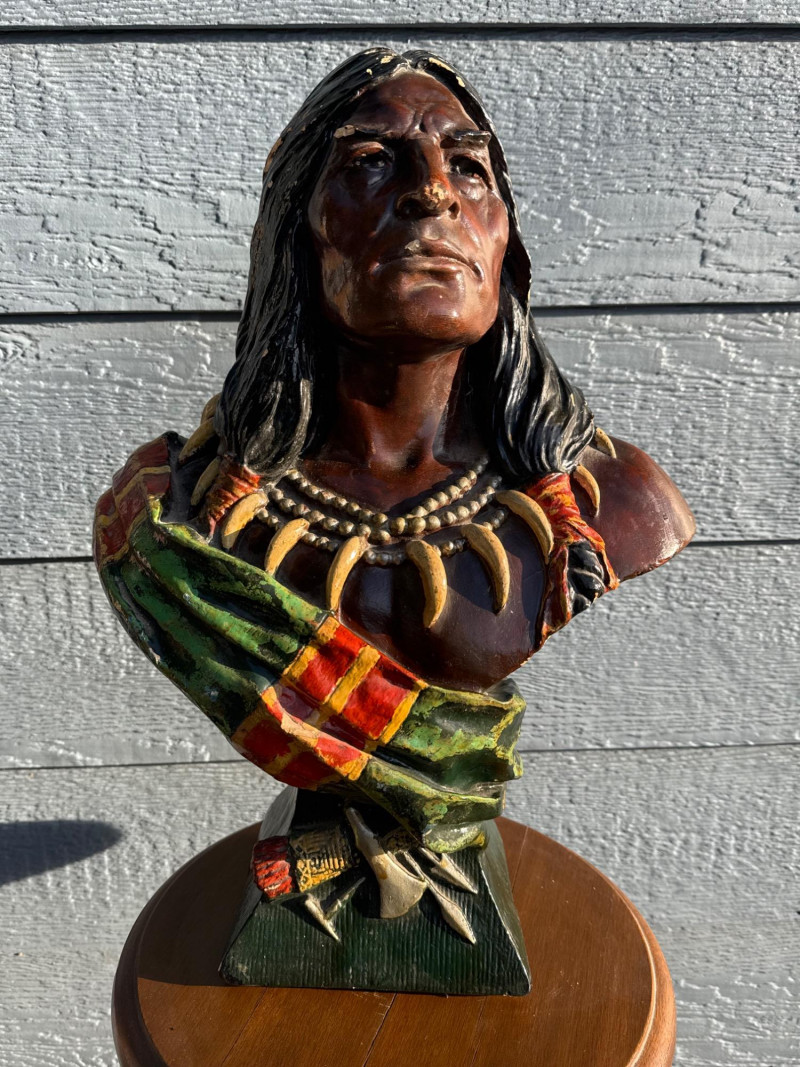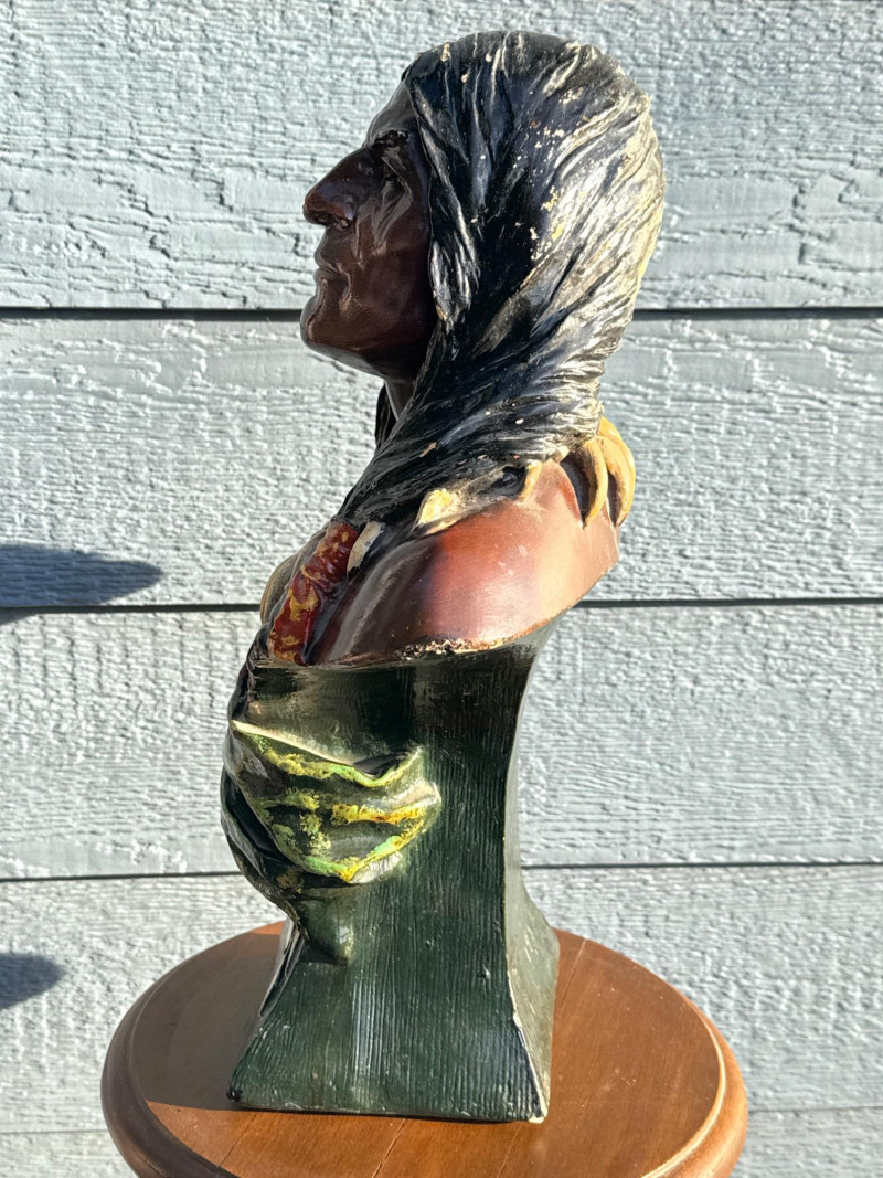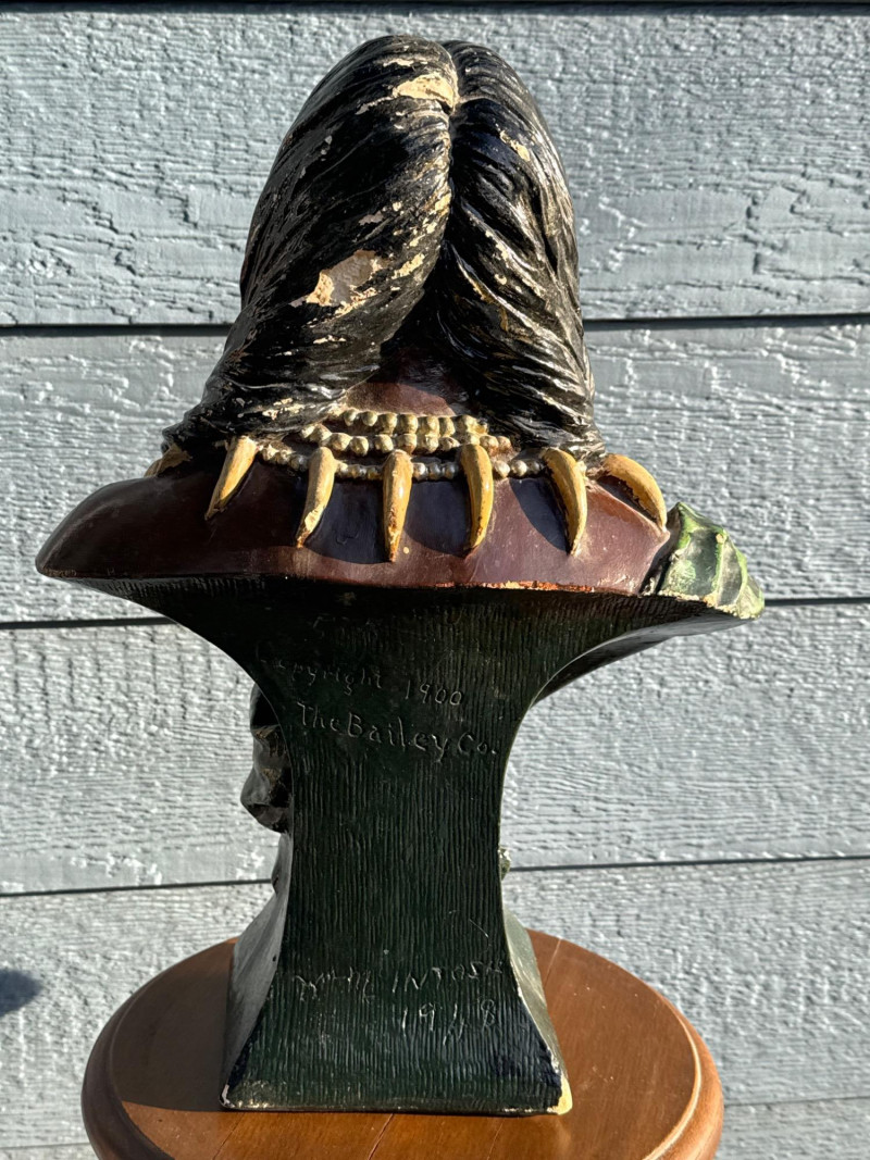 The bust in the image is identified as a Bailey & Co. chalkware bust of a Native American Chief, often referred to as "Hiawatha". Manufacturer: The piece is associated with Bailey & Co. Material: It is made of chalkware or plaster. Purpose: These busts were historically used as counter-top advertising displays in tobacco or cigar stores. Origin/Era: They are considered American folk art and generally date to the early 20th century, around the 1900s to 1930s