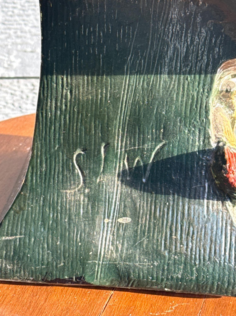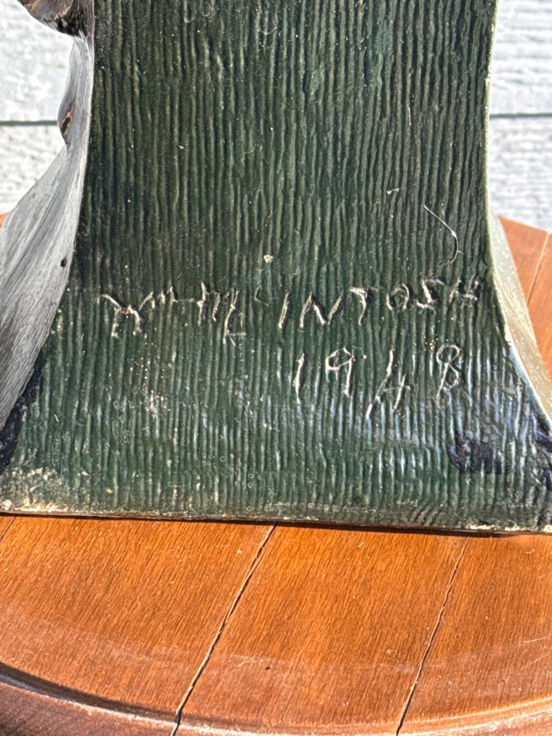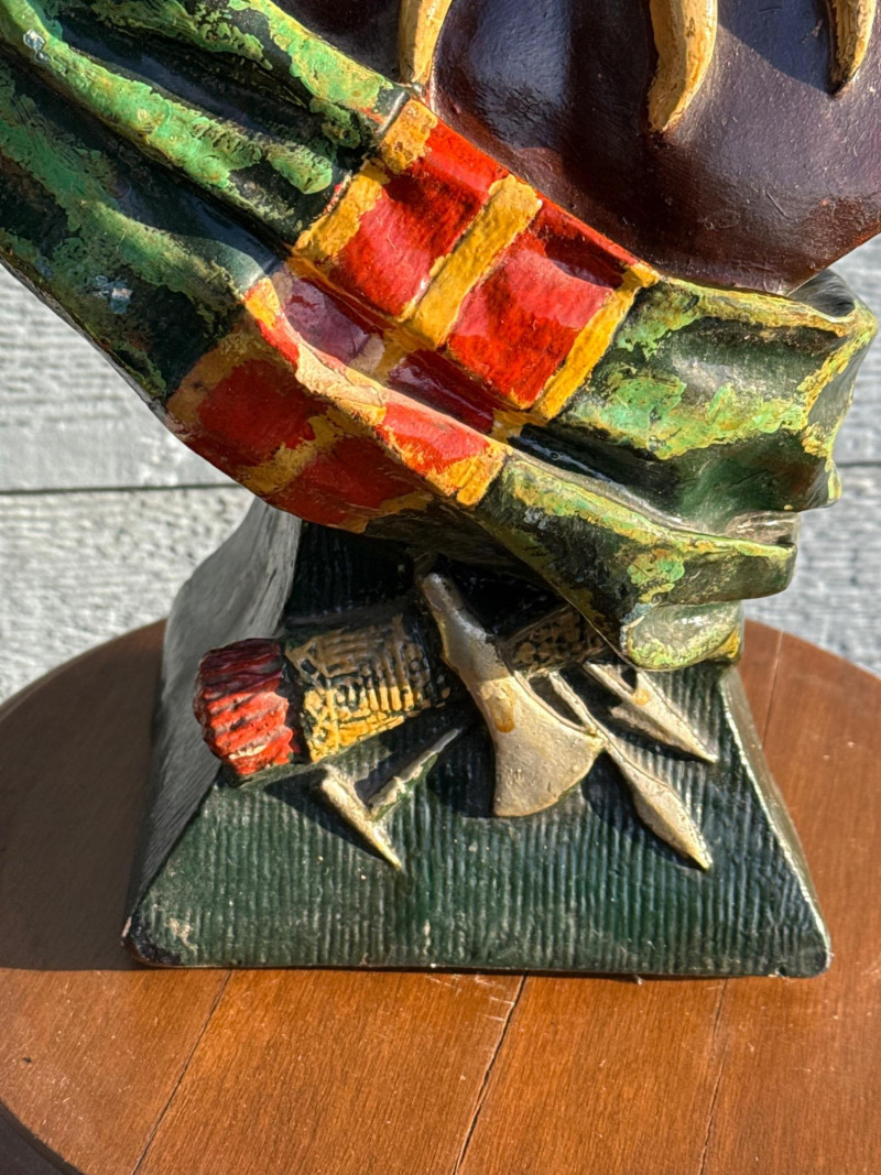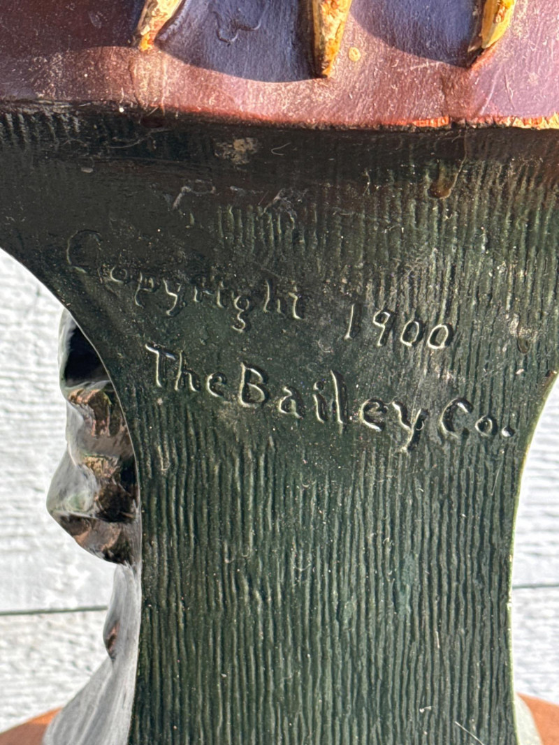 The bust in the image is identified as a Bailey & Co. chalkware bust of a Native American Chief, often referred to as "Hiawatha". Manufacturer: The piece is associated with Bailey & Co. Material: It is made of chalkware or plaster. Purpose: These busts were historically used as counter-top advertising displays in tobacco or cigar stores. Origin/Era: They are considered American folk art and generally date to the early 20th century, around the 1900s to 1930s