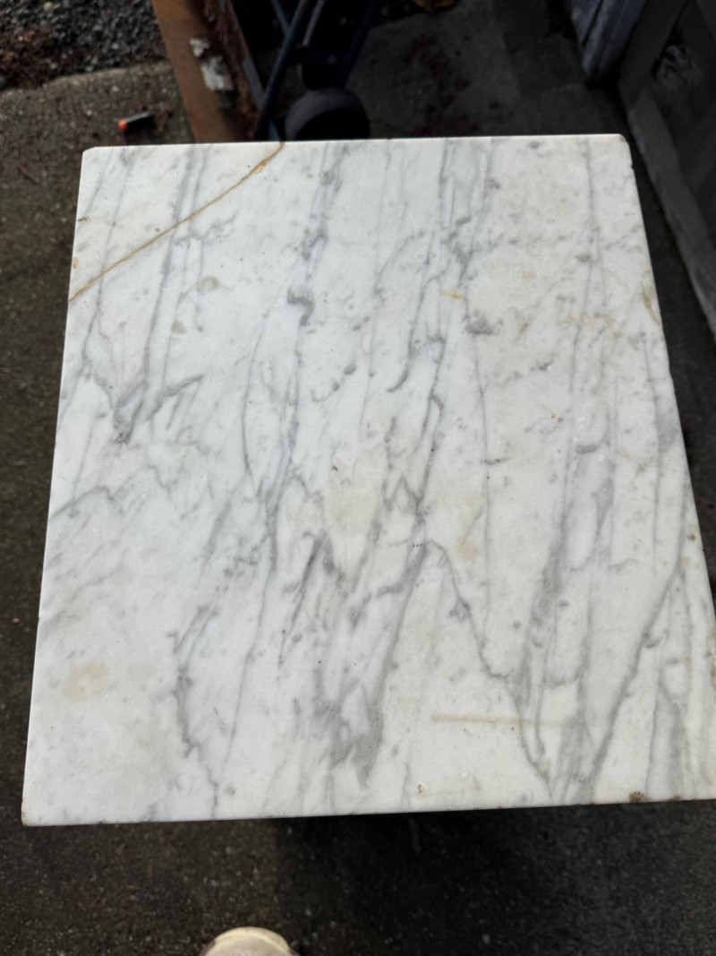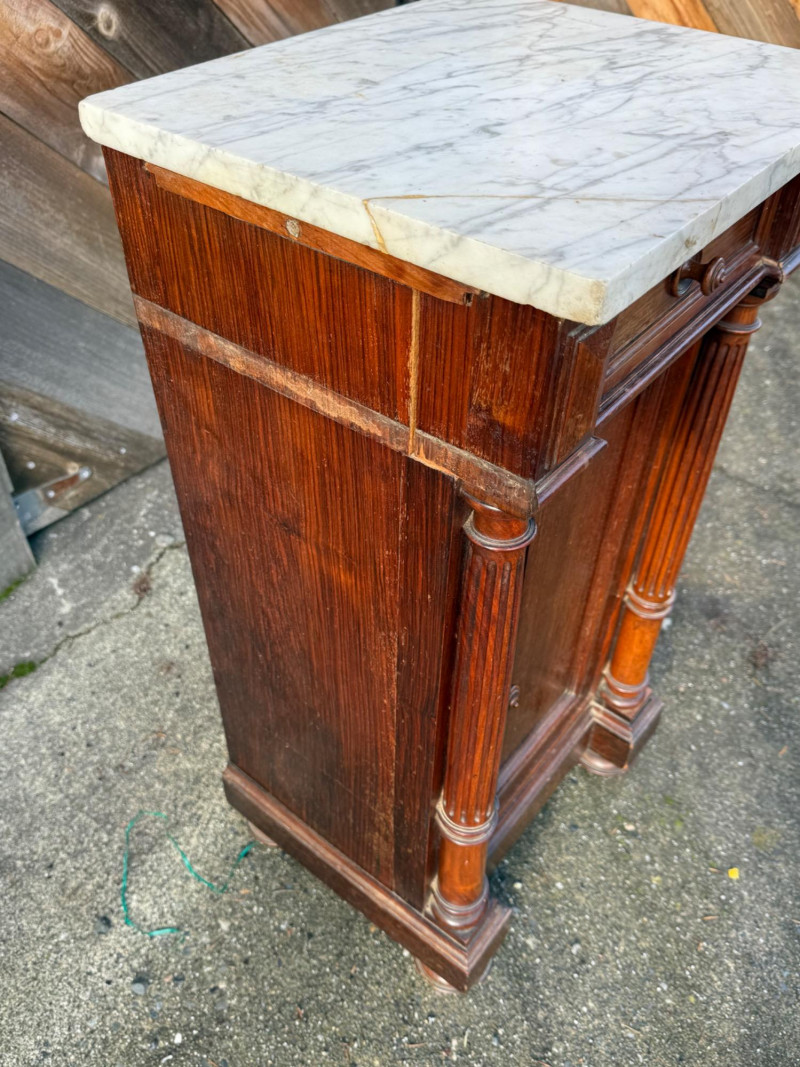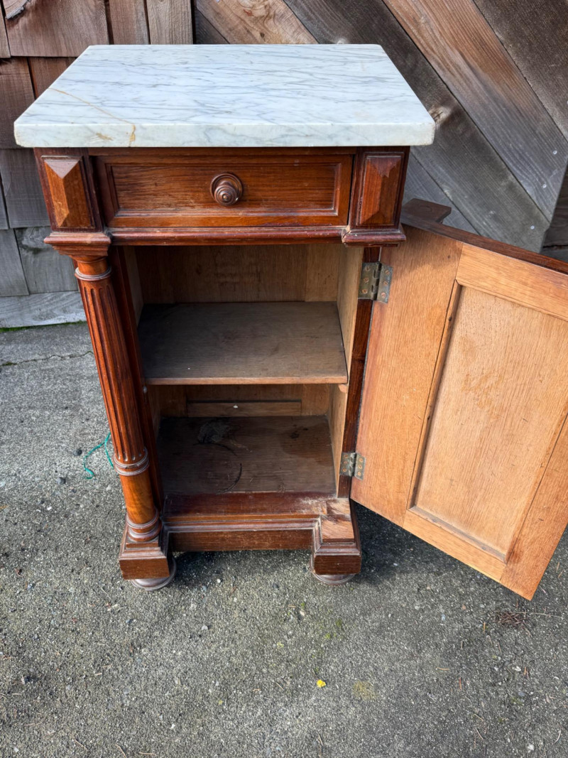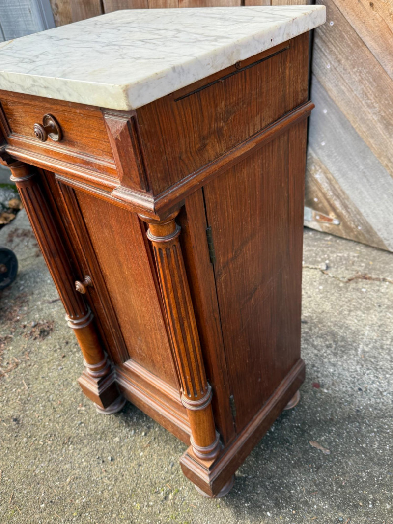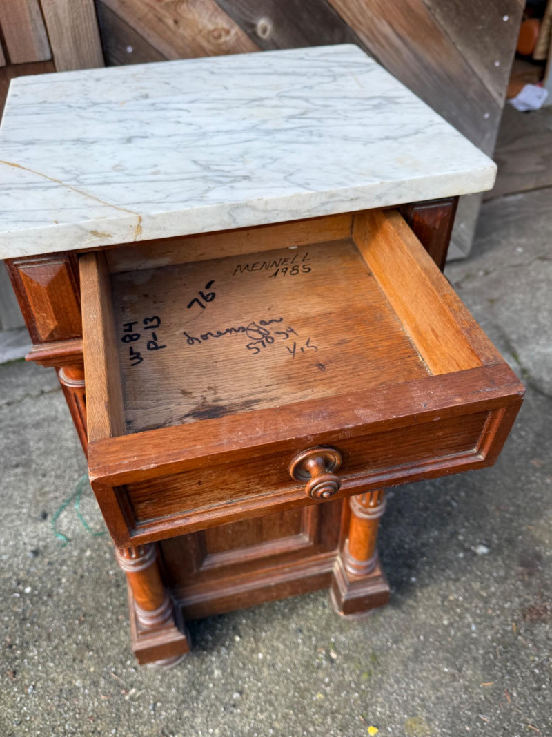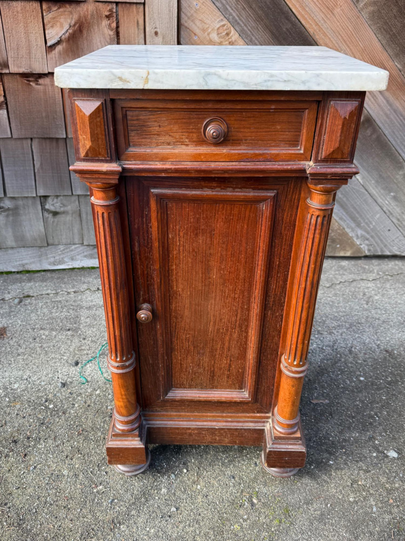 Handsome vintage walnut cabinet featuring a light marble top and classic carved detailing. The piece includes a single drawer with round knob, fluted side columns, and a lower cabinet door with matching knob and decorative molding. The warm reddish-brown finish and compact footprint make it ideal as a nightstand, accent table, or entryway piece. A timeless blend of function and form, perfect for traditional interiors or vintage furniture collections. Important Details: Material: Walnut wood with light marble top
