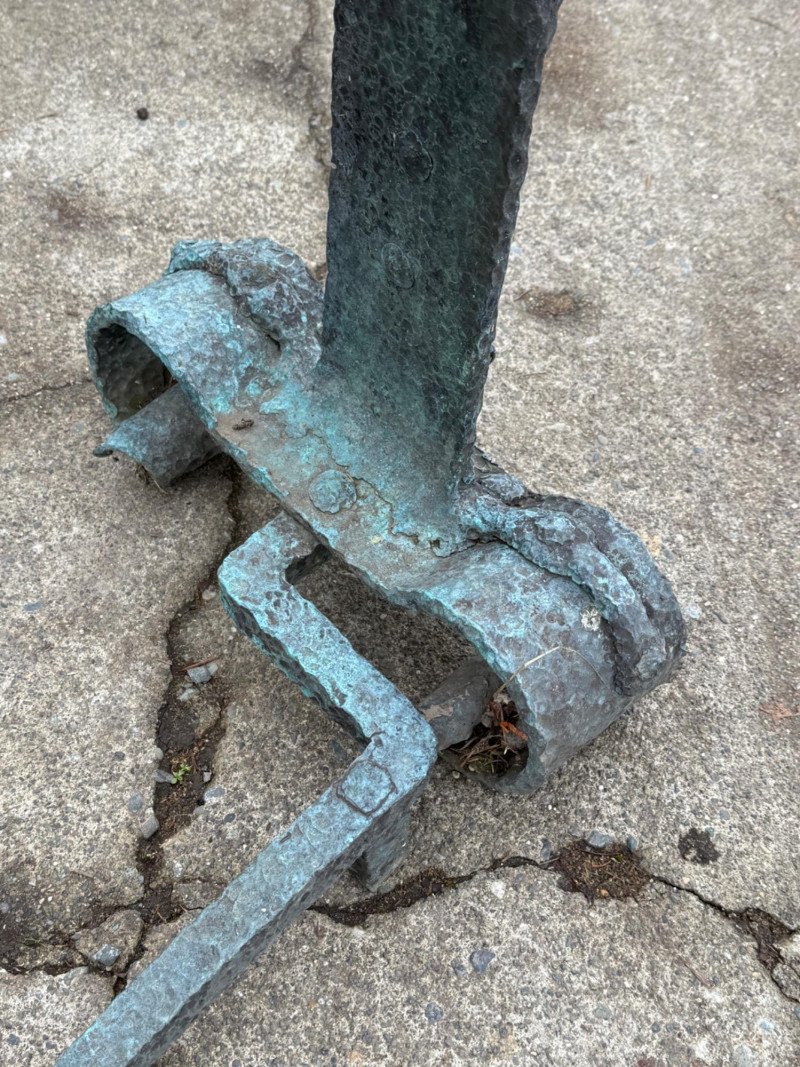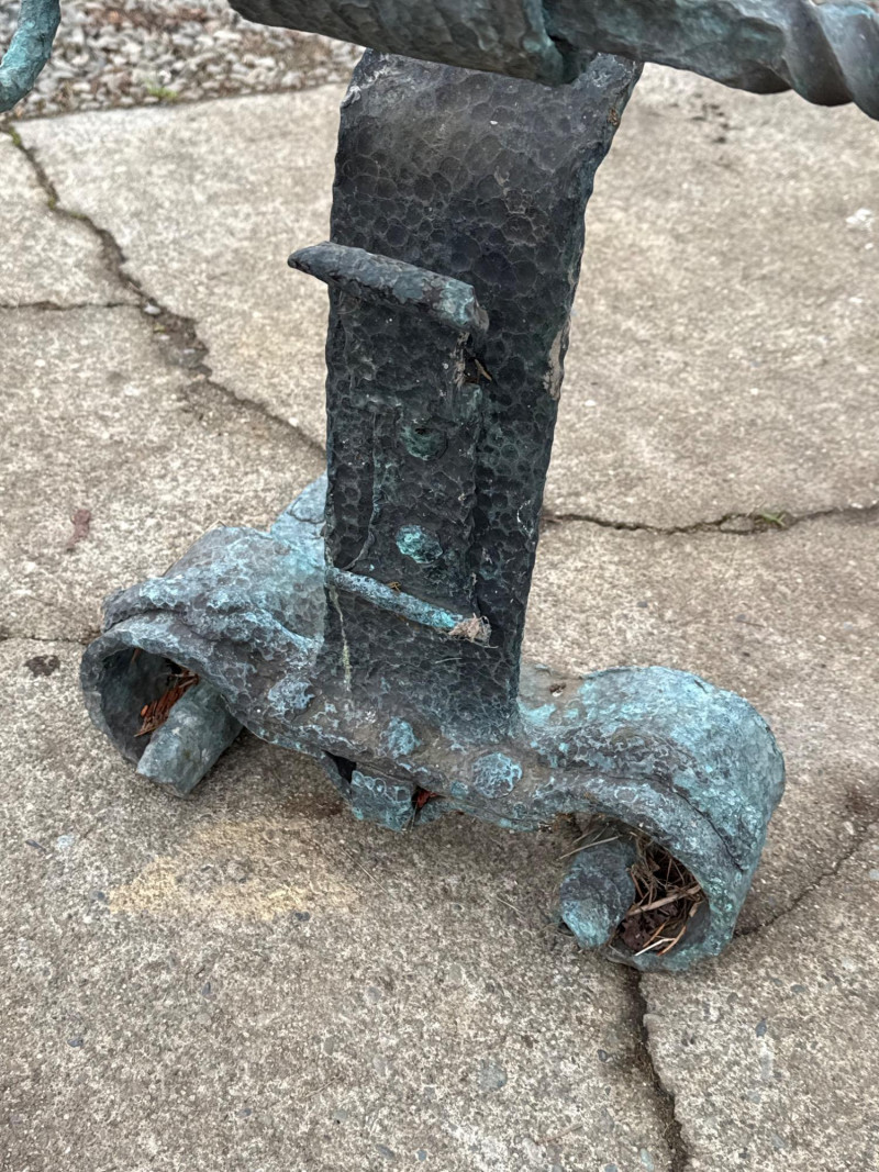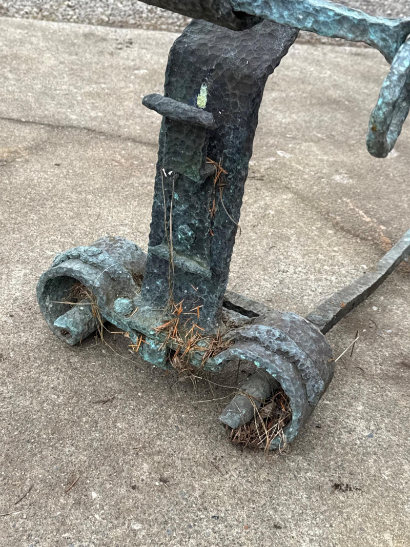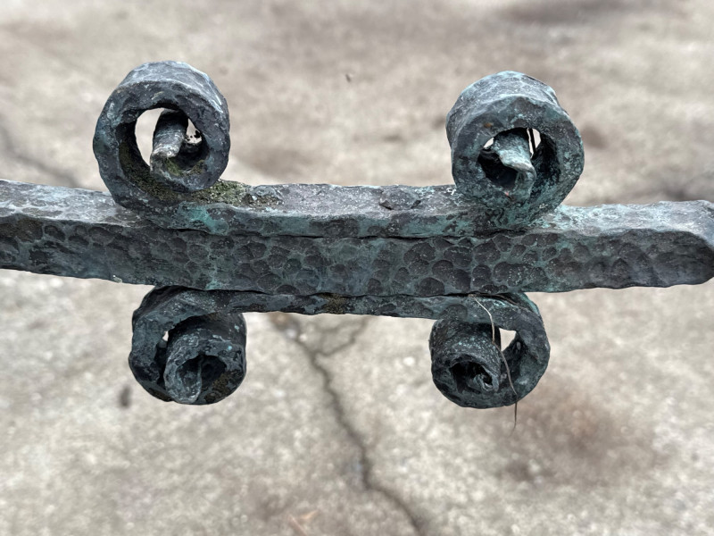This is a pair of antique wrought iron fireplace andirons, also known as firedogs. Andirons are metal supports used in pairs to hold logs in a fireplace, allowing air to circulate for a better burn. These appear to be hand-forged, possibly dating from the 18th or 19th century, in a style that might be described as Arts & Crafts, Colonial Revival, or Renaissance-style, with a twisted crossbar and decorative scrollwork. The greenish patina suggests a verdigris finish on the iron, consistent with an aged, rustic appearance. The design includes hooks on the front uprights, which in some cases were used to hold a spit for cooking over the fire. This set is very solid and very heavy.