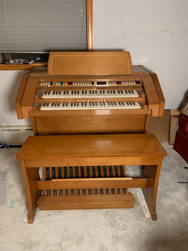 Bring home the warm, retro sound of this Gulbransen electronic organ. Crafted with solid wood and classic styling, it’s a standout piece for musicians, collectors, or anyone seeking a vintage aesthetic. Brand: Gulbransen Type: Electronic organ Features: Dual manual keyboard, built-in speakers, traditional wood cabinet Dimensions: 46" L × 48" W × 40" H Includes: Matching bench Condition: Powers on and is fully functional, with one key producing a drone note that will require servicing. Surface wear is present and documented in the photographs. A great addition to any music room or studio, this organ combines nostalgic charm with playable character.