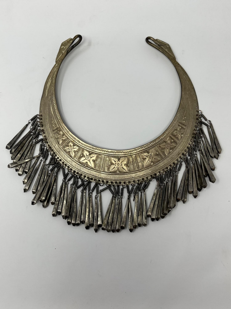 This vintage bib necklace showcases a bold tribal-inspired design with layered metal accents that evoke a bohemian, artisan-crafted aesthetic. Though unbranded and made from unknown metal, its aged patina and global styling give it a distinctive, timeworn charm. The bib section features a tiered arrangement of dangling elements in a silver-tone finish. While a few charms are missing and the connecting chain is not included, the overall silhouette remains visually striking and full of character. Ideal for jewelry makers, costume designers, or collectors seeking authentic vintage components. Whether restored, repurposed, or displayed as-is, this piece offers creative potential and a story-rich presence. Sold as-is. No chain or additional accessories included.