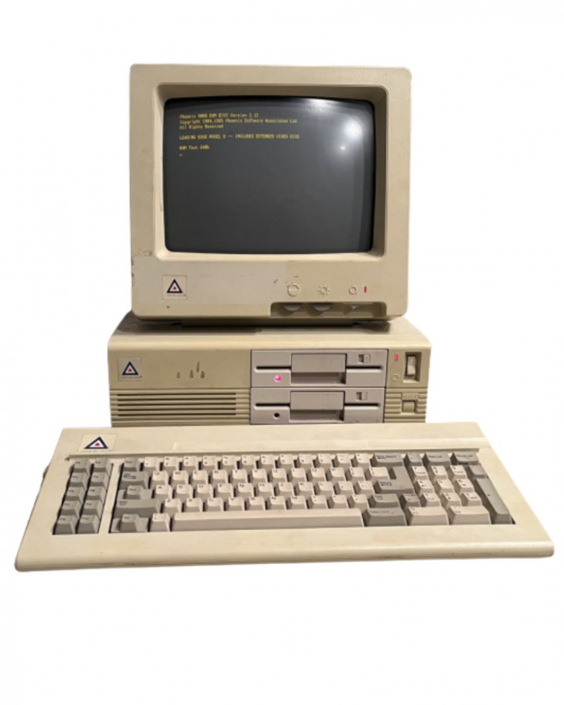 Vintage Leading Edge DC-2011 desktop personal computer, beige chassis with integrated full‑size keyboard and front 5.25" floppy drive. Sold as‑is; functionality untested. - Model: DC-2011 - Likely era: mid‑1980s - Probable CPU: Intel 8088 class (around 4.77 MHz) - Probable RAM: 256 KB–640 KB (may be expandable) - Storage: front 5.25" floppy drive; internal hard drive possible but unconfirmed - Video: CGA-compatible or equivalent onboard graphics likely - I/O and expansion: serial; parallel; keyboard port; ISA expansion slots likely present - Condition: vintage cosmetic wear, surface scuffs, possible yellowing; missing or unverified accessories; no power cord or software confirmed - Sale notes: ideal for restoration, parts, or display; recommend power-up and functional testing by buyer prior to use