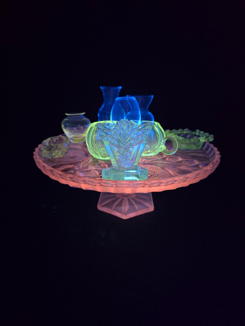 This striking 10-piece collection of mid-century glassware features vivid UV-reactive properties, with each piece glowing a different color under blacklight—including shades of pink, green, blue, and pale orange. A standout for collectors and decorators alike, the set includes a mix of functional and decorative pieces with classic mid-century styling. Collection Includes: 1 cake stand (4.5" high × 12" diameter) Several pitchers in varied shapes and sizes Assorted small glass items (2"–4" range) Era: Mid-century (circa 1940s–1960s)