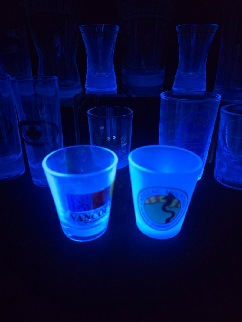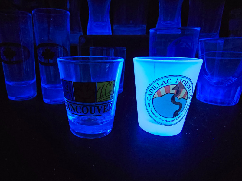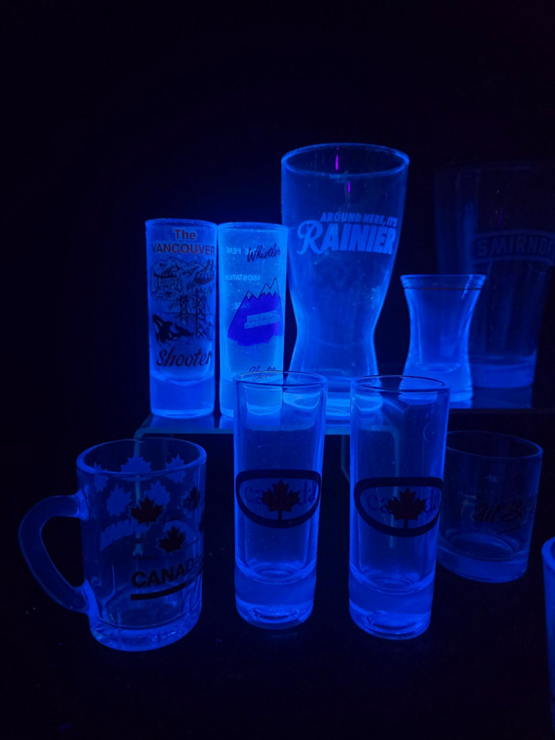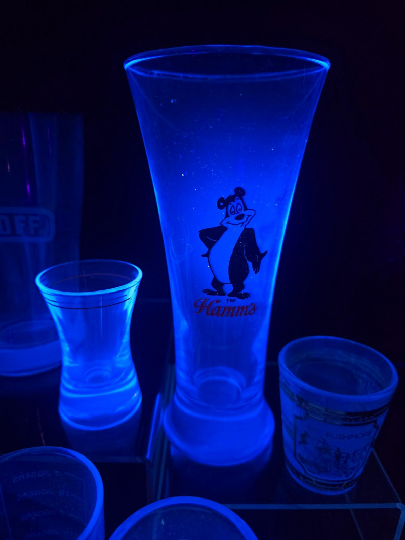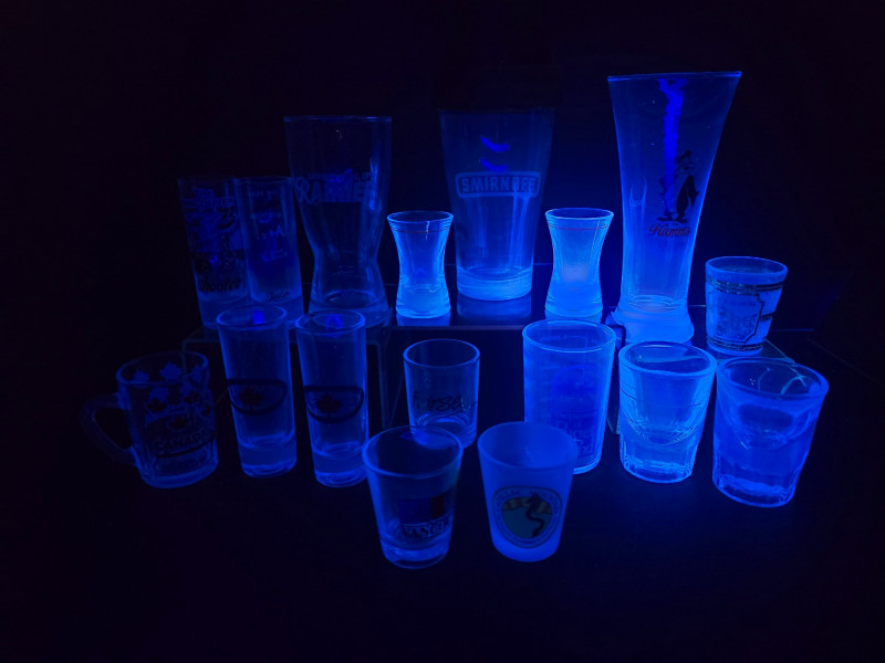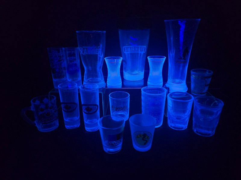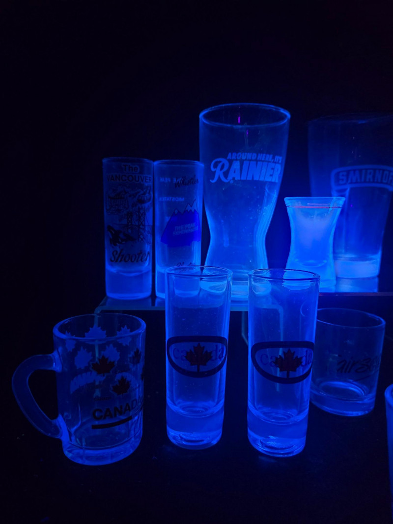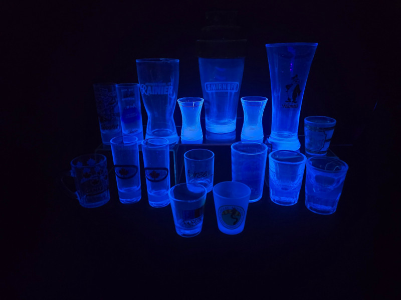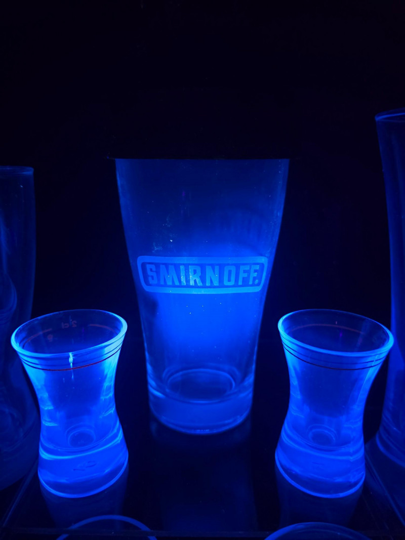 Light up your next gathering with this glowing collection of UV-reactive barware. Whether you're a collector of retro glass or a host looking to impress, this eclectic set delivers style, nostalgia, and serious glow appeal under blacklight. Included in this lot: 1 Smirnoff Cocktail Shaker – Classic silhouette with UV-reactive accents 2 Tumblers/Glasses – Perfect for mixed drinks, both glow vividly under UV light 14 Shot Glasses – Assorted sizes, branding, and designs; includes promotional logos, souvenir styles, and vintage bar motifs. Each reacts uniquely under blacklight for a dazzling display Highlights: Glasses range from sleek modern to retro kitsch Most pieces glow green or blue under UV light; some feature multi-tone effects Ideal for themed parties, bar setups, or collectors of UV-reactive glassware No chips or cracks; light wear consistent with age and use Condition: Pre-owned, excellent vintage condition. All pieces tested for UV reactivity. Clean and ready to display or use. Bring the glow to your bar cart, game room, or glass collection. Bid now and own a set that truly shines.