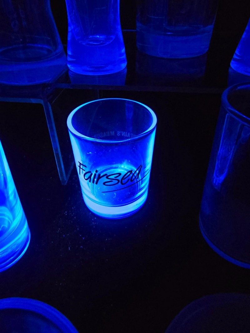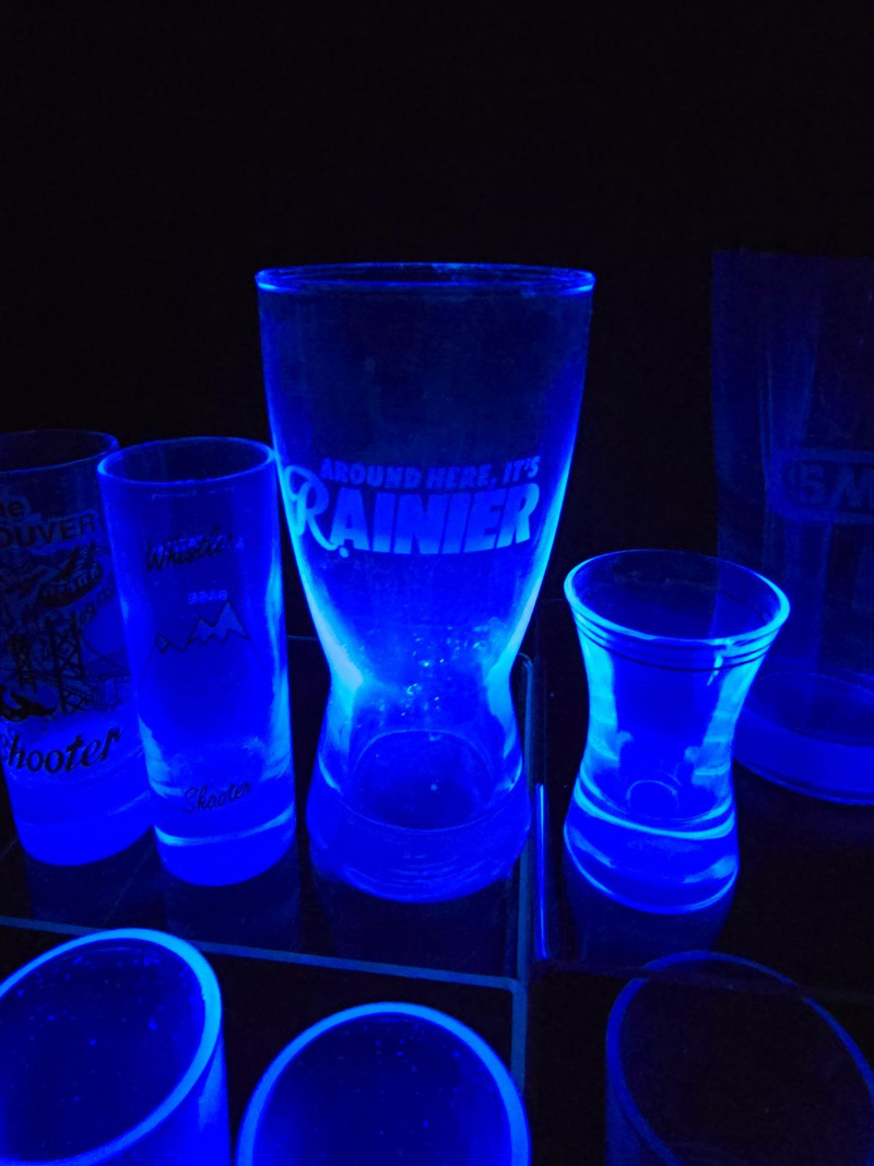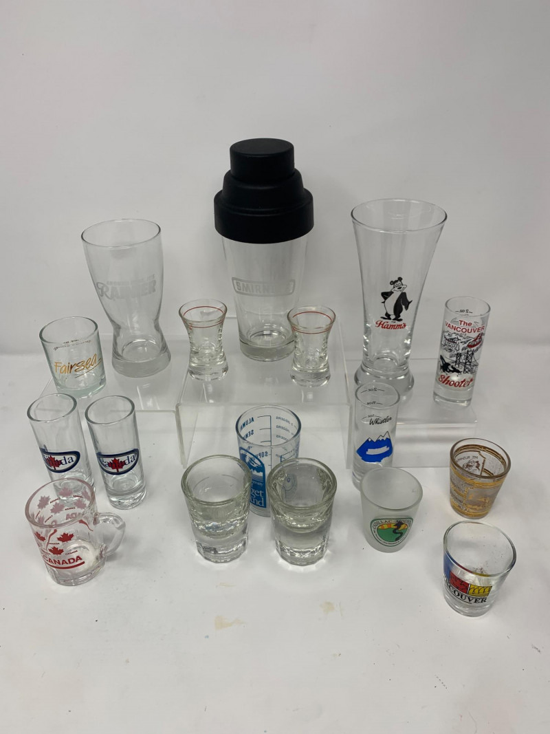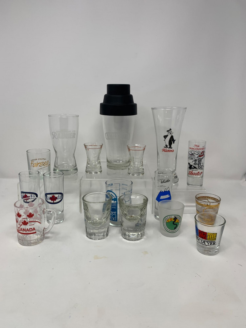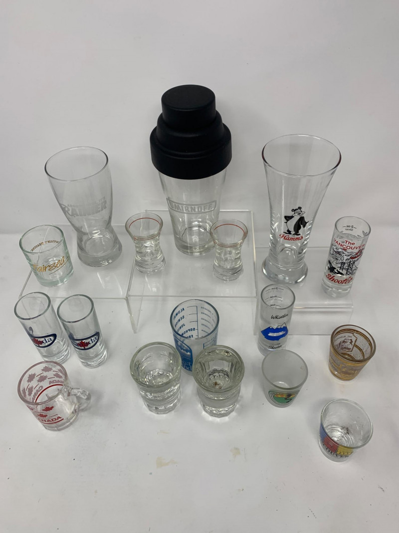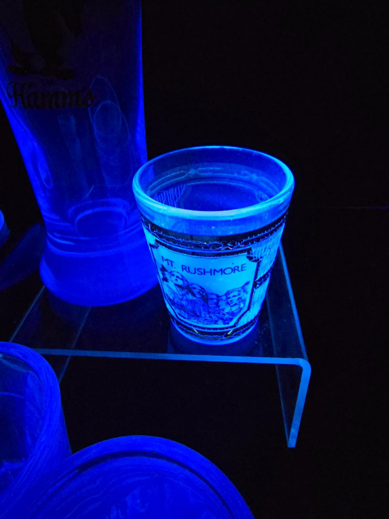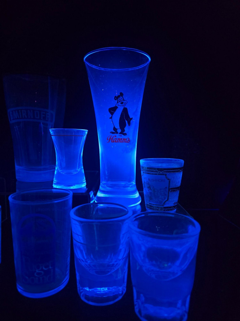 Light up your next gathering with this glowing collection of UV-reactive barware. Whether you're a collector of retro glass or a host looking to impress, this eclectic set delivers style, nostalgia, and serious glow appeal under blacklight. Included in this lot: 1 Smirnoff Cocktail Shaker – Classic silhouette with UV-reactive accents 2 Tumblers/Glasses – Perfect for mixed drinks, both glow vividly under UV light 14 Shot Glasses – Assorted sizes, branding, and designs; includes promotional logos, souvenir styles, and vintage bar motifs. Each reacts uniquely under blacklight for a dazzling display Highlights: Glasses range from sleek modern to retro kitsch Most pieces glow green or blue under UV light; some feature multi-tone effects Ideal for themed parties, bar setups, or collectors of UV-reactive glassware No chips or cracks; light wear consistent with age and use Condition: Pre-owned, excellent vintage condition. All pieces tested for UV reactivity. Clean and ready to display or use. Bring the glow to your bar cart, game room, or glass collection. Bid now and own a set that truly shines.