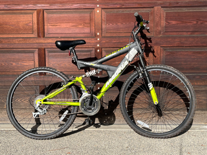 This MAGNA “Cliffhanger” mountain bike offers a rugged and reliable ride, built for both trail adventures and everyday use. Its bright green and black dual-suspension frame absorbs bumps from uneven terrain, while the 21-speed indexed gear system gives you the flexibility to climb hills or cruise flat paths with ease. The frame features bold MAGNA branding and stylized graphics, with a matching padded saddle for comfort. The bike is equipped with linear-pull brakes (V-brakes) front and rear, providing responsive stopping power. The tires are 26 x 1.95 with knobby tread, ideal for off-road grip and stability. A rear coil spring shock and front suspension fork work together to smooth out your ride, and the kickstand adds convenience for parking. Cosmetically, the bike shows signs of use: light scratches on the frame, some surface rust on the chain, and moderate wear on the tires. Mechanically, it’s in good working order—shifting, braking, and suspension have all been tested. This is a solid choice for someone looking for a dependable mountain bike with versatile gearing and a comfortable ride. Specifications Brand: Magna Model: Cliffhanger Frame: Steel with aluminum components Suspension: Dual (front fork + rear coil spring) Gearing: 21-speed indexed shifting Brakes: Linear pull (V-brake) Tires: 26 x 1.95 knobby tread Saddle: Padded black seat with Magna logo Color: Bright green with black and white accents Extras: Kickstand, reflectors Additional Details Model No: 8207-49TJ Date of Manufacture: 2014.02.28 Barcode: 016751180612 Manufacturer: Kent International Terms