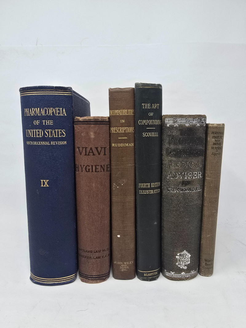 A curated selection of six early 20th-century medical and pharmaceutical texts, spanning pharmacopoeia, prescription safety, hygiene, compounding, and home nursing. These volumes offer historical insight into American medical education and practice, and are ideal for collectors, educators, or display. Titles & Publishing Details: Pharmacopœia of the United States of America – Ninth Decennial Revision