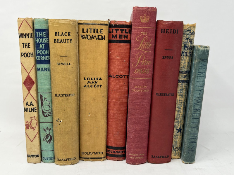 A well-preserved collection of nine vintage children's books spanning beloved classics, illustrated editions, and mid-century reprints. Each volume reflects its original publisher’s character and era, making this lot ideal for collectors, educators, or display. Titles Included: Winnie the Pooh by A.A. Milne – Dutton edition The House at Pooh Corner by A.A. Milne – Dutton edition Black Beauty by Anna Sewell – Illustrated, Saalfield Publishing Little Women by Louisa May Alcott – Goldsmith edition Little Men by Louisa May Alcott – Goldsmith edition The Little Princesses by Marion Crawford – Museum Press Ltd., London Heidi by Johanna Spyri – Illustrated, Saalfield Publishing The Adventures of the Wood Mouse by Thornton W. Burgess The Adventures of Reddy Fox by Thornton W. Burgess Provenance & Condition: Publishers include Dutton, Goldsmith, Saalfield, and Museum Press—each known for mid-century children’s literature and collectible reprints. Books show vintage wear: softened corners, spine fading, and foxing typical of age. Bindings remain mostly intact; pages complete and legible. Illustrated editions retain original artwork. Sold as-is for authenticity. This lot is offered as a complete set. Please review photos for condition details.
