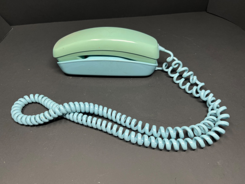 This vintage Western Electric Bell System push-button phone features a distinctive mint green-blue color and classic mid-century styling. A charming example of early touch-tone technology, it’s ideal for collectors, decorators, or anyone drawn to retro design. Features: Authentic Western Electric Bell System push-button model Eye-catching mint green/blue plastic housing Original handset and button layout Bell ringer mechanism present (untested) Western Electric and Bell System markings Condition: Visible surface wear consistent with age and use No visible cracks or structural damage Untested and sold as-is; no cords or modular connectors included Handset and body show vintage patina Notes: