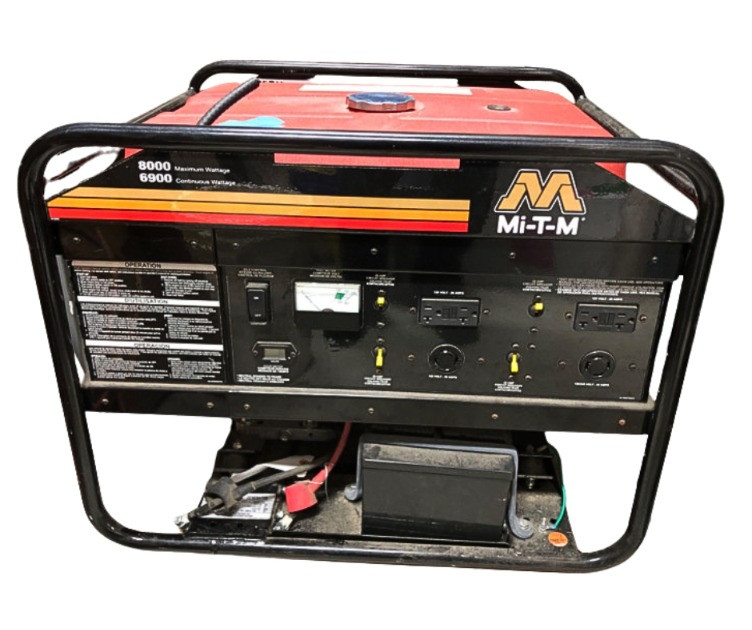 Heavy-duty Mi-T-M generator, assembled in the USA. Model GEN-8000-0MSE, Serial No. 40084721. Designed for reliable performance with a 3600 RPM engine, delivering a maximum output of 8000 watts and continuous output of 6900 watts. Dual voltage capability (120/240V) with 57.5/28.8 AMP ratings at 60 Hz. Industrial‑grade engineered for reliable jobsite power. Built with copper windings for clean power, GFCI‑protected outlets, and a heavy‑duty steel frame. Compact 29" × 24" × 22" design makes it suitable for contractors, shops, or backup energy needs. The unit was puchased by owner and has never been used.