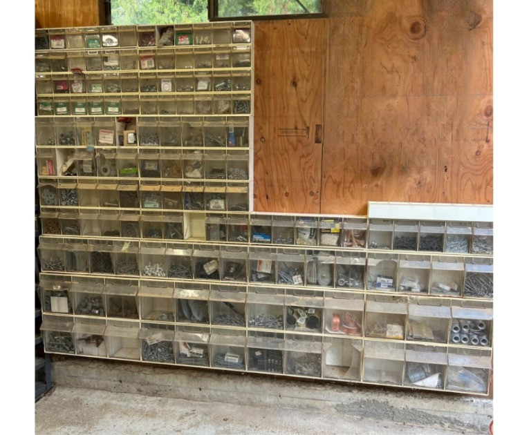 Assorted rack and plastic organizers full of miscellaneous screws, nails, washers, bolts, couplers and more. Comprehensive hardware selection suitable for construction, repair, and shop projects. Organized for easy access and versatile use across applications. Includes all in picture along with the organizer. Buyer removes from wall.