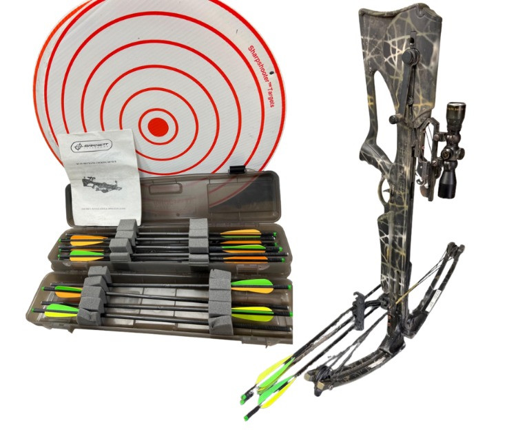 High‑performance Barnett crossbow complete with arrows and mounted scope for precision targeting. Crossbow: Barnett model, designed for accuracy and durability. Scope: Mounted scope enhances aim and long‑range precision. Arrows: Includes a set of compatible arrows for immediate use. Utility: Ideal for sporting, target practice, or collectors of quality archery equipment.