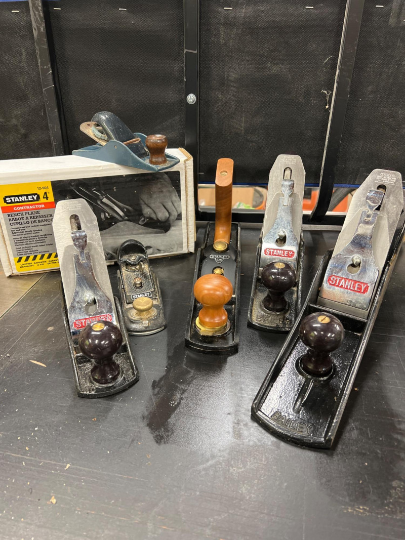 A trio of classic Stanley bench planes, including Nos. 4, 5, and 7, complemented by two smaller companion planers. Additionally, a featured Stanley Sweetheart (SW) branding with redwood handles, a hallmark of quality craftsmanship from the early 20th century. Collectors and woodworkers alike value these planes for their durability, balance, and historical significance. Need Shipping?: Contact LoopCycle