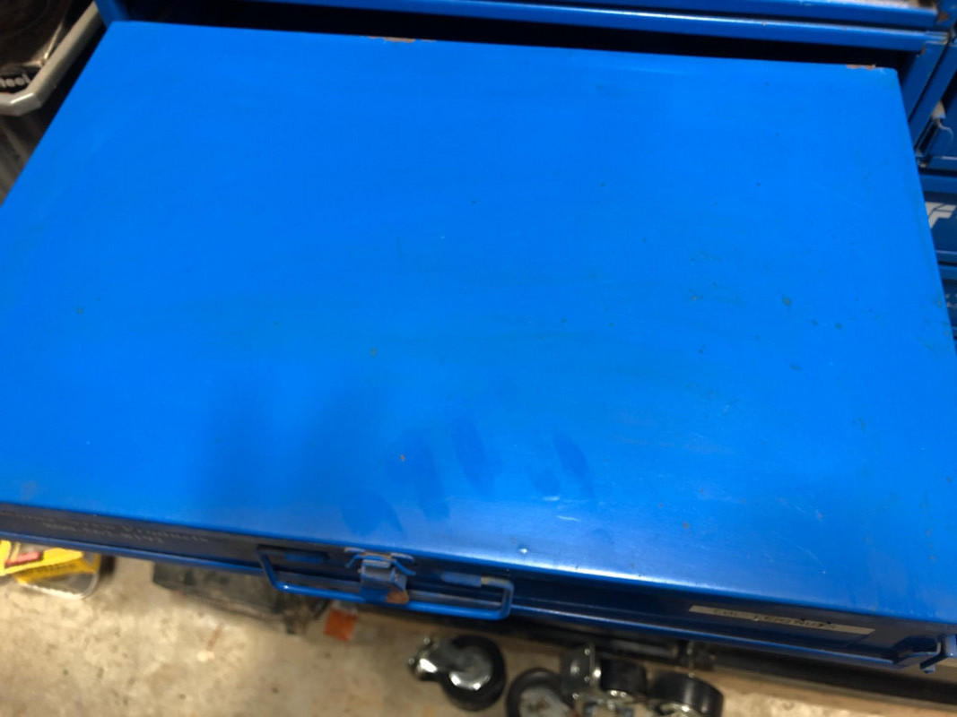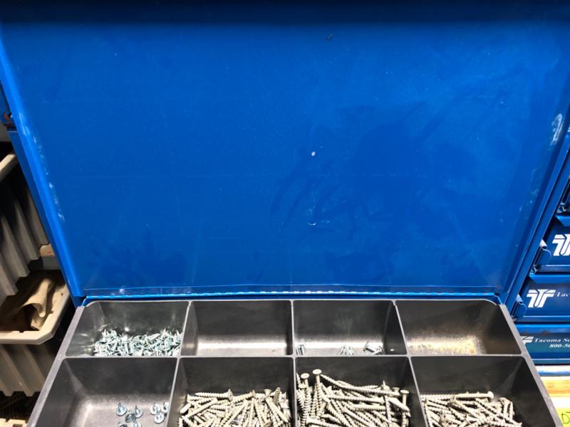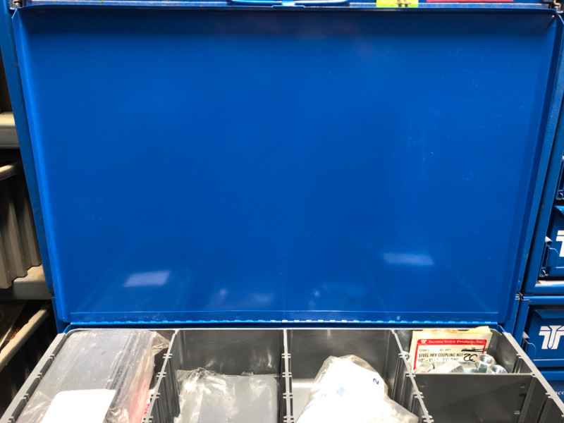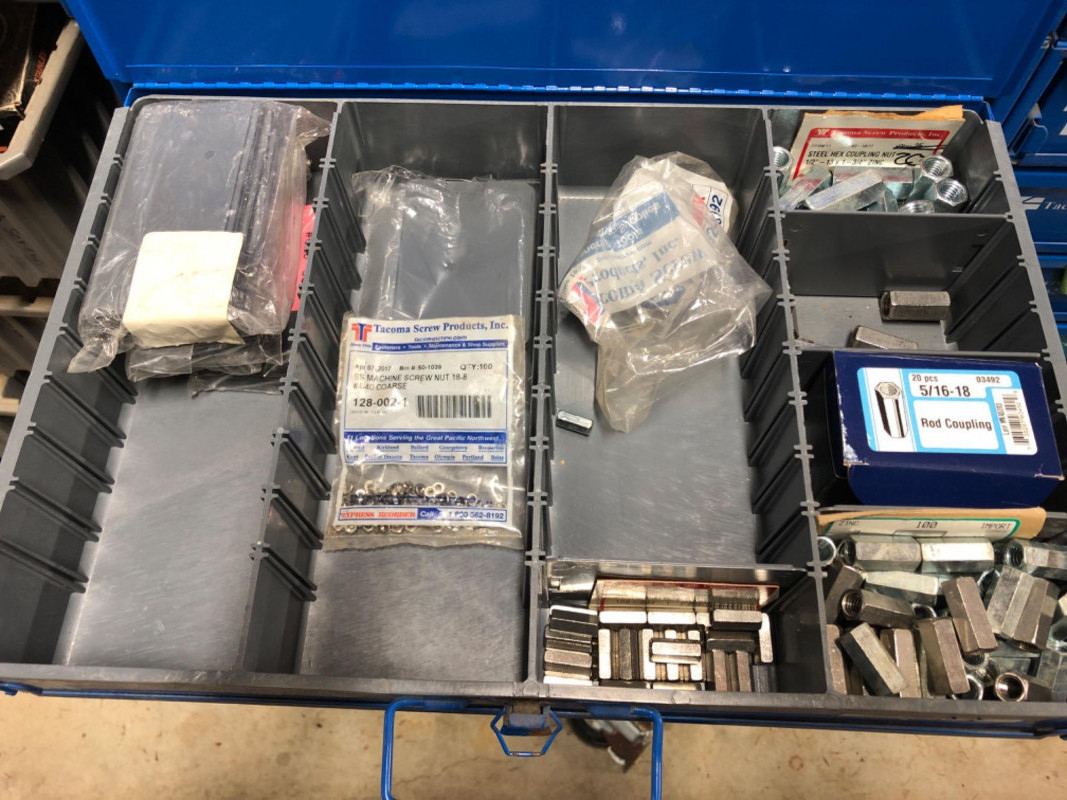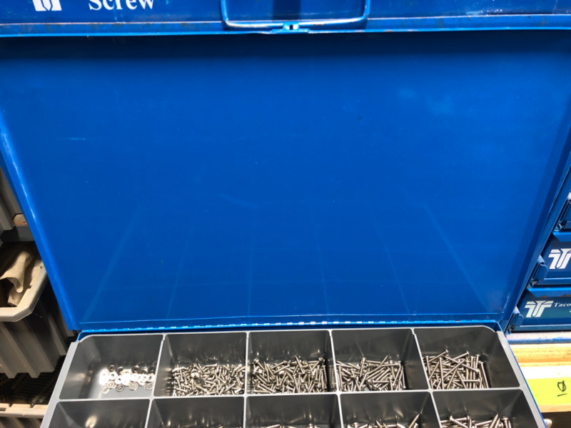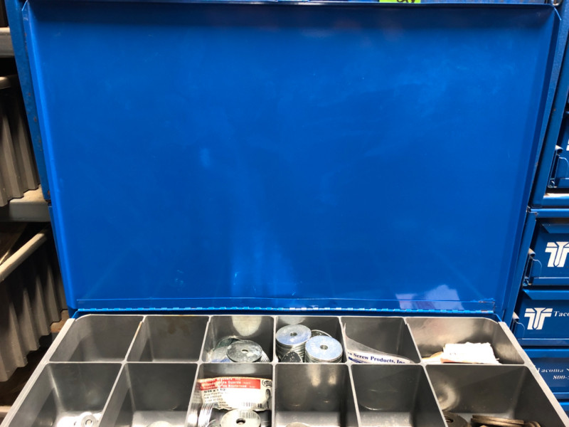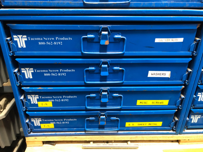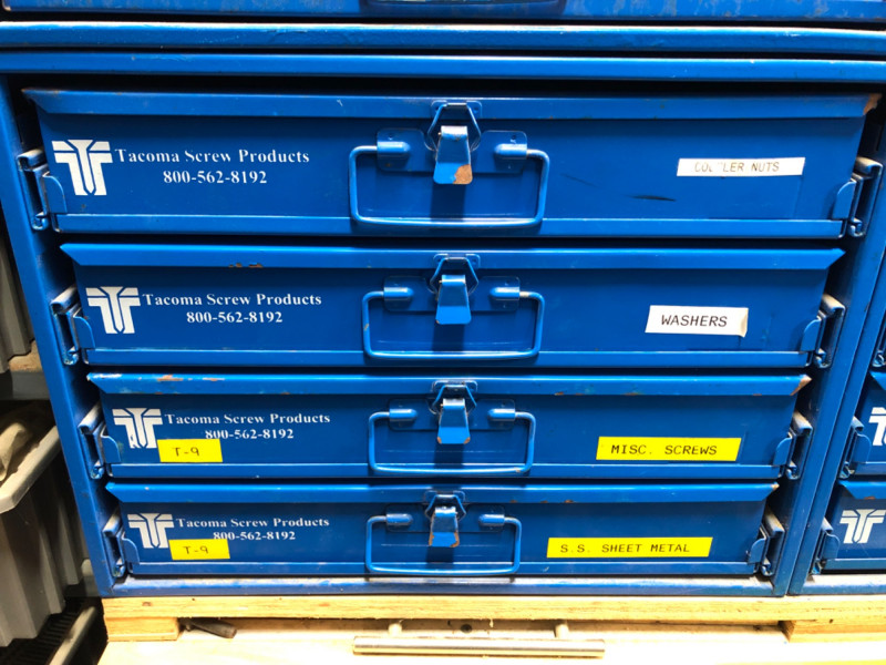 Tacoma Screw organizer cabinet #5 with four drawers filled with screws, washers, and nuts. Heavy‑duty cabinet construction built for shop or contractor use. Provides organized storage and easy access to essential fasteners.