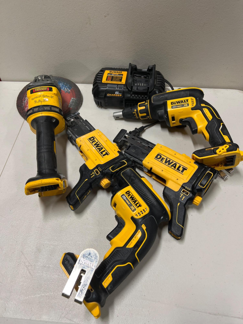 Assorted set of DeWalt cordless power tools designed for portability and jobsite efficiency. This lot includes: Two DCF620 Drywall Screw Guns – precision fastening for drywall installation Two DCF6202 Collated Attachments – compatible with screw guns for faster production work DCG414 Grinder (Brushless Motor, 60V Max) – heavy‑duty cutting and grinding performance DCB1106 6V Battery Charger – supports multiple DeWalt battery platforms All tools are contractor‑grade, built for durability and reliability in demanding shop or construction environments. Please note: batteries are not included.