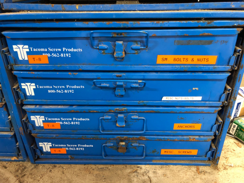 Tacoma Screw 4‑drawer metal cabinet, designed for organizing screws, fasteners, and shop hardware. Durable construction with compartmentalized drawers makes it easy to sort and store supplies. Ideal for contractors and shop organization.