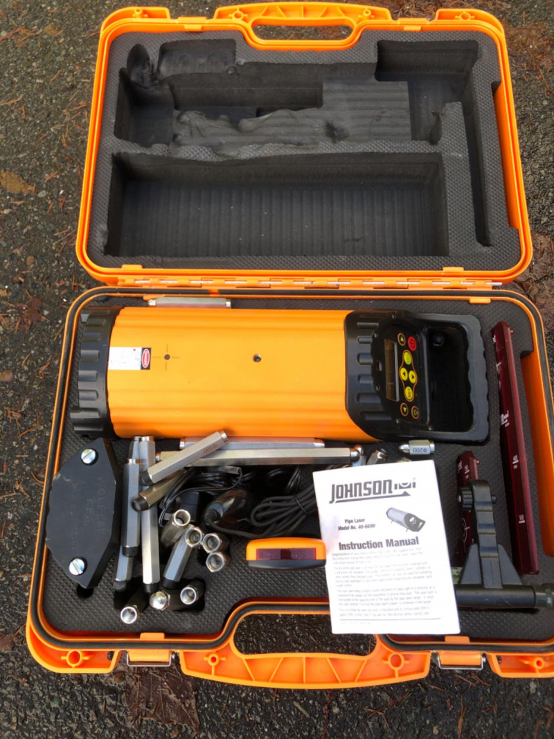 Johnson Model 40‑6690 pipe laser. Professional contractor tool for precision alignment in underground pipe installation. Unit powers on and is functional. Need Shipping?: Contact LoopCycle