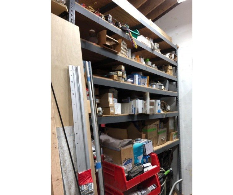 Contractor‑grade industrial shelving unit with 6 shelves. Provides ample storage for tools, hardware, and supplies. Does not include any items on shelves. Organization unit only. Special Note: Unit appears to be assembled with interlocking rails and supports. Metal rails and removable wood shelves. Buyer disassembles unit or brings vehicle that can transport unit as is (see dimensions). Located at parking lot level and at back of shop structure. Preference is for buyer to arrange for pickup late on last day of pickups.