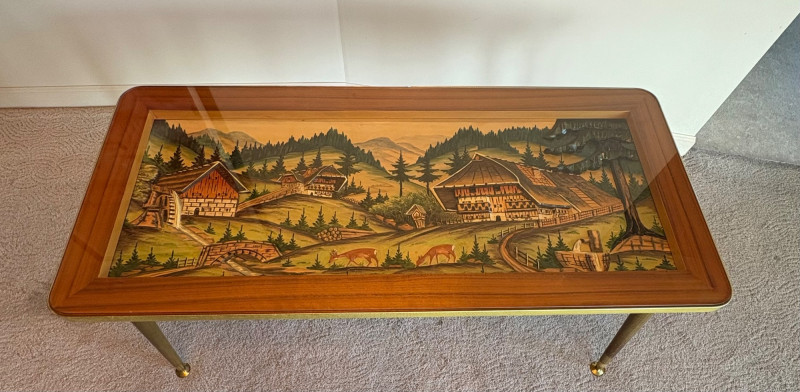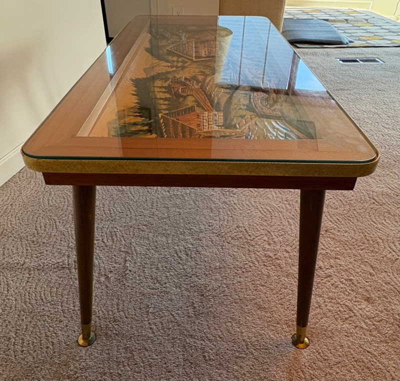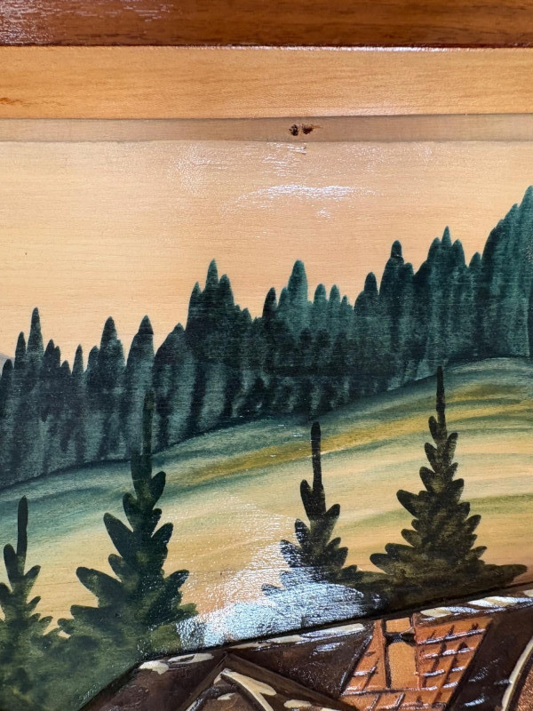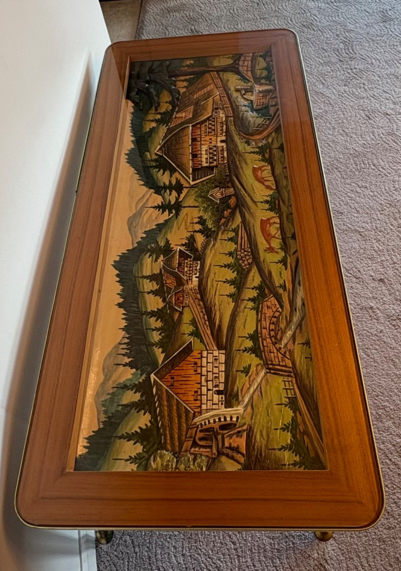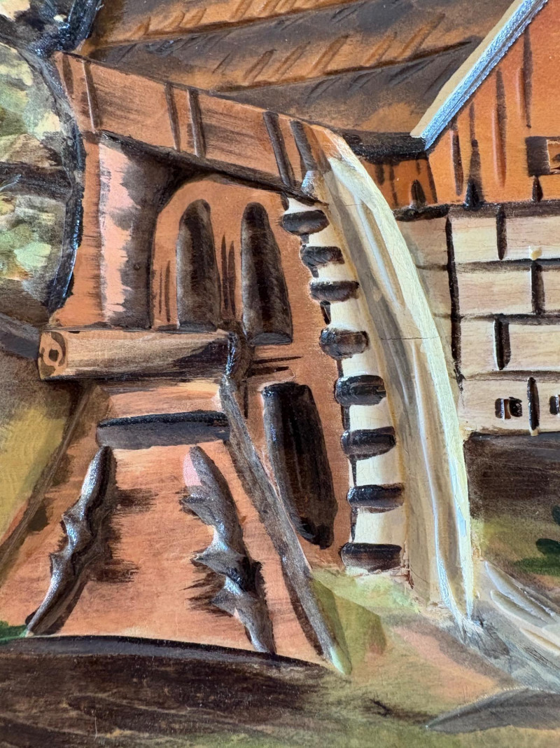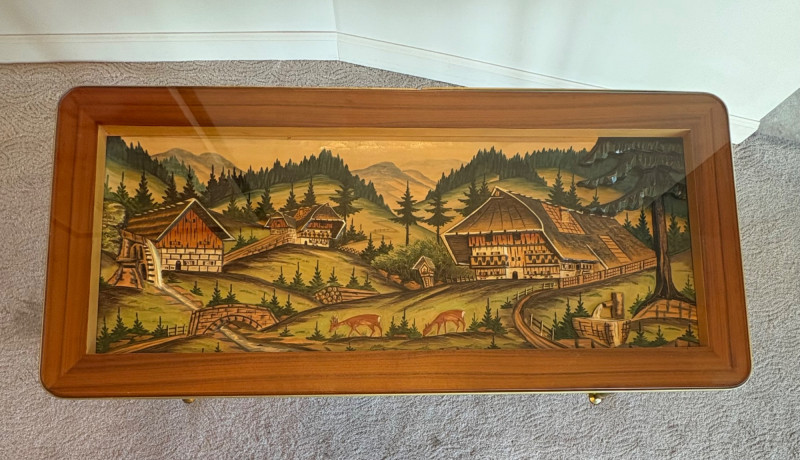 shows a bucolic mountain scene with mill, home, mountains, creek, and deer. Carving is protected by glass tabletop – colors are vivid and the