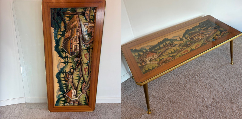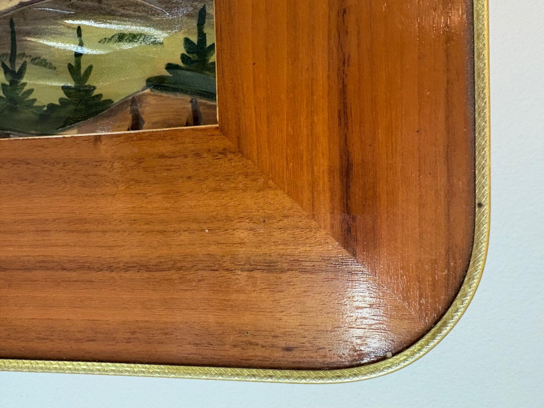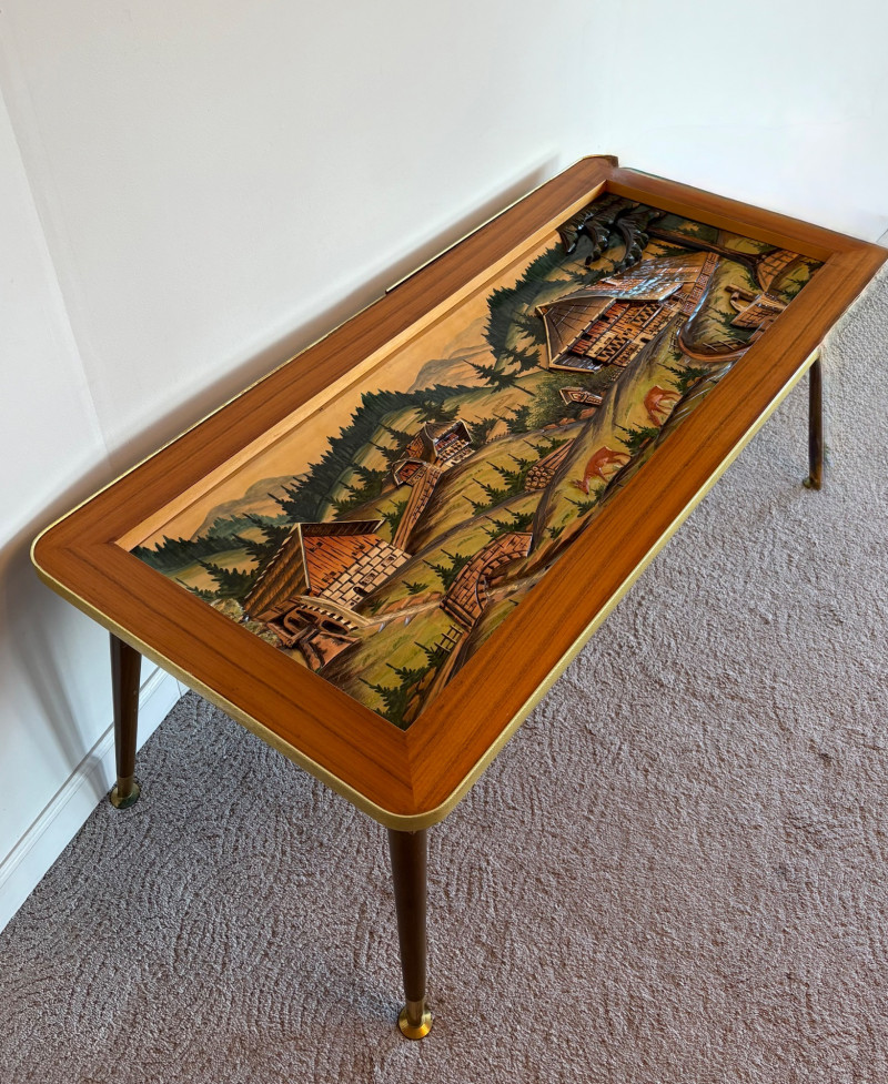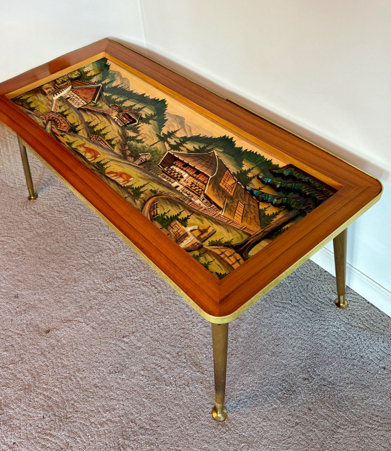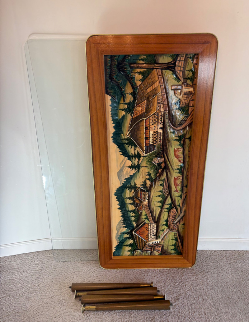shows a bucolic mountain scene with mill, home, mountains, creek, and deer. Carving is protected by glass tabletop – colors are vivid and the