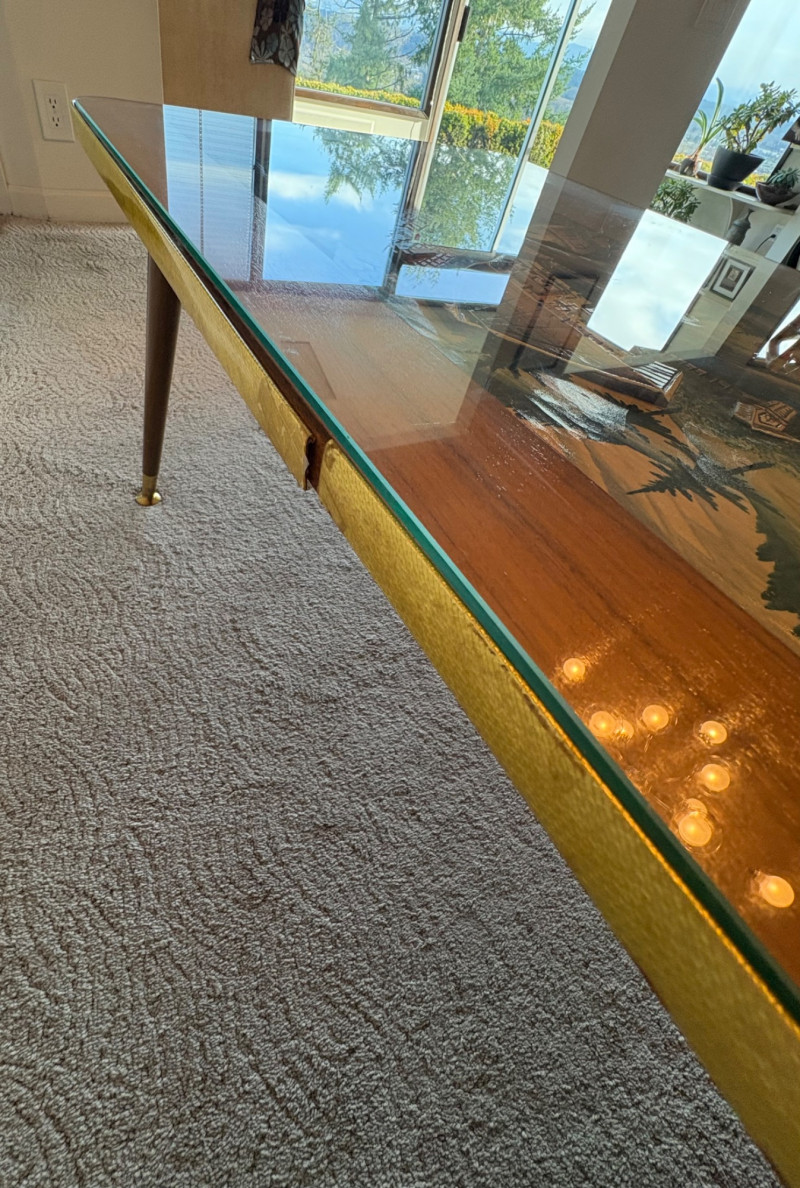 coffee table. Trimmed with gold banding strip, the table