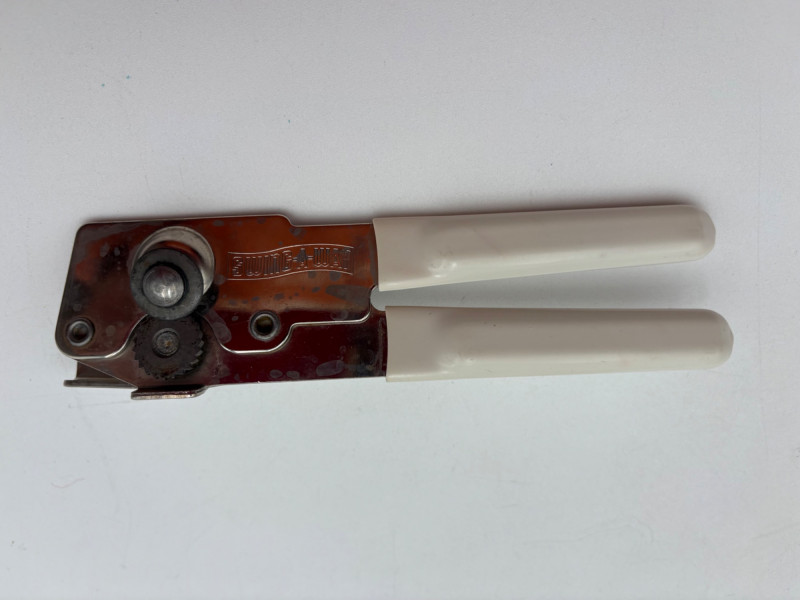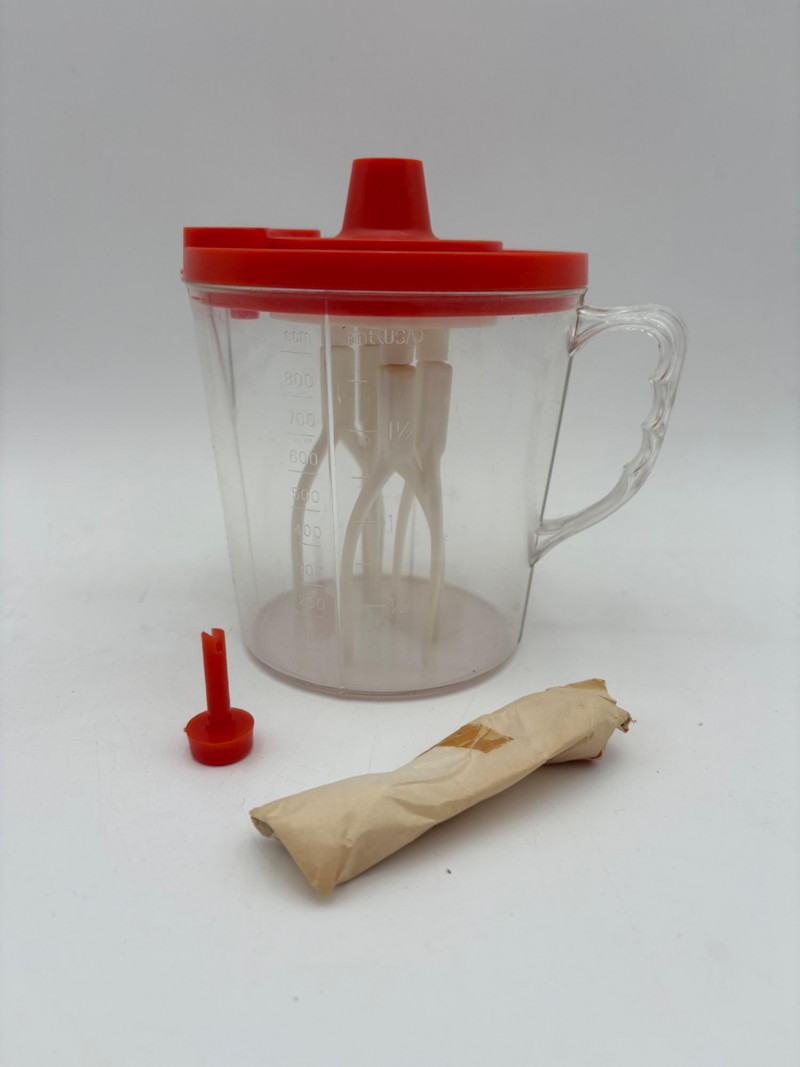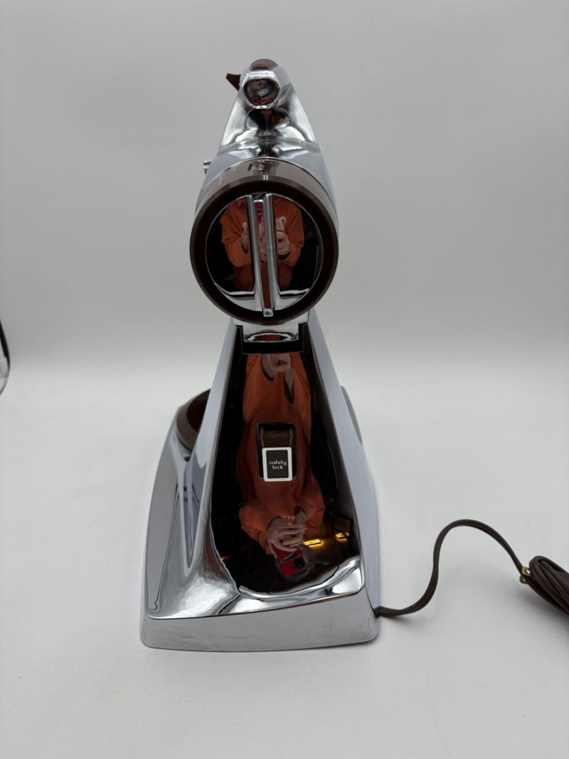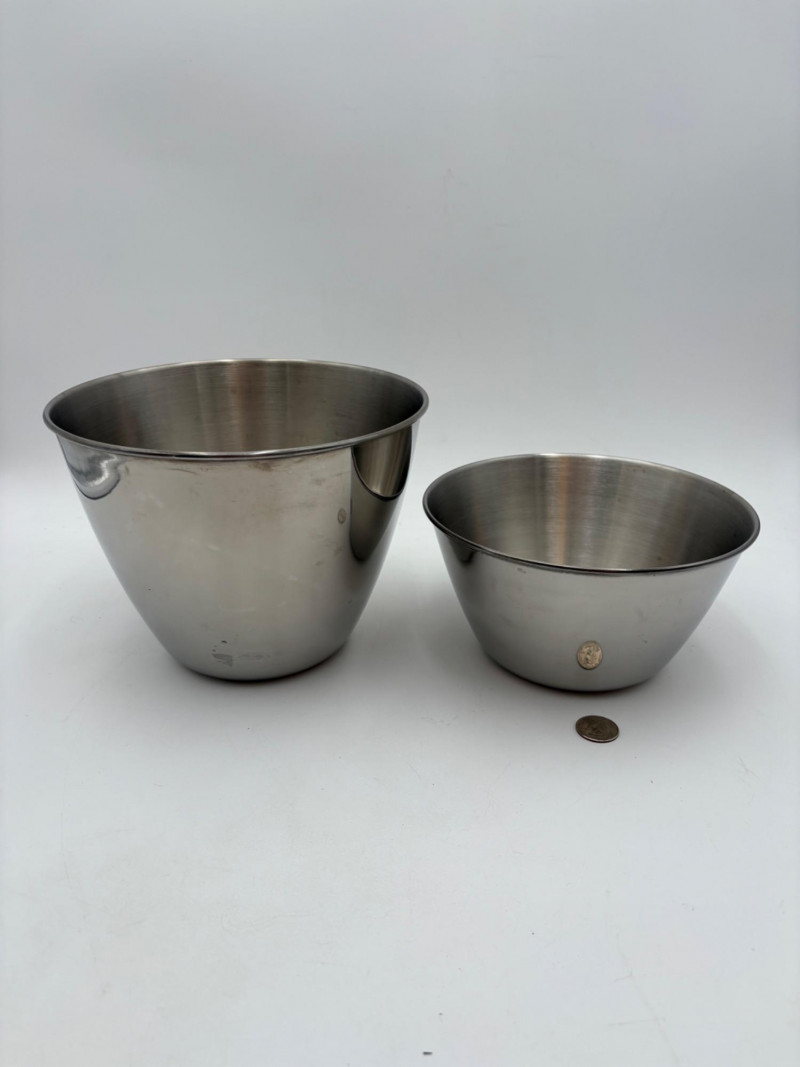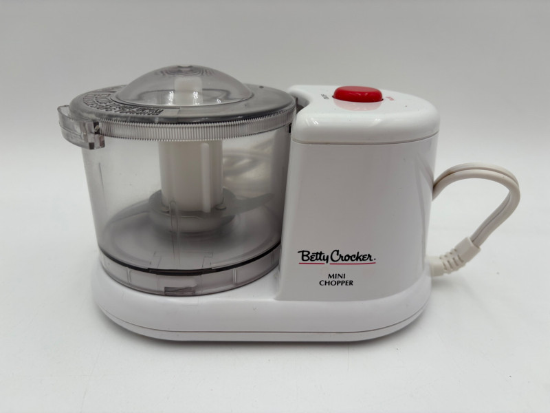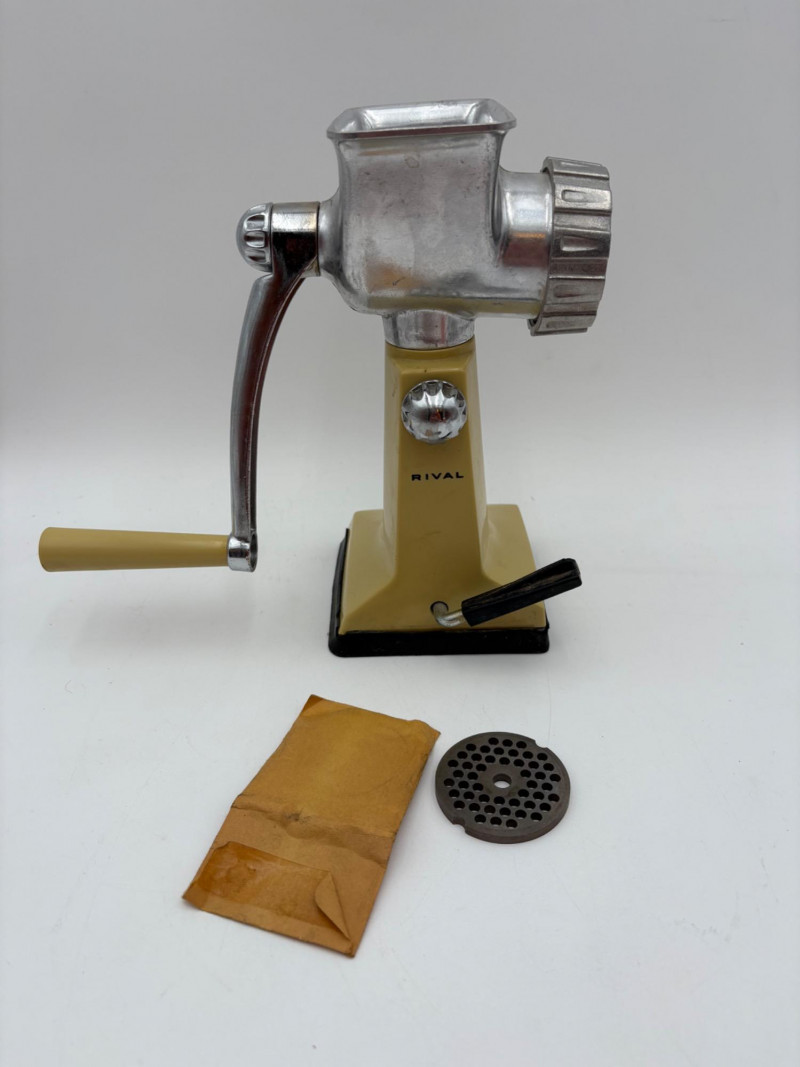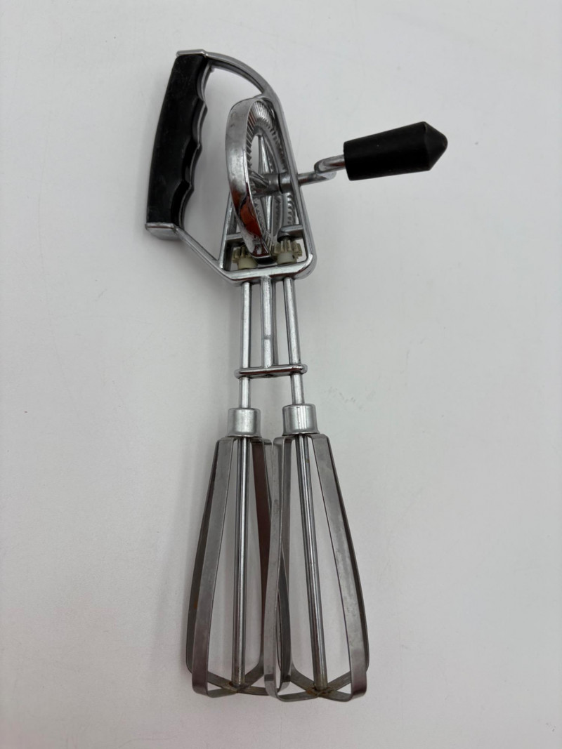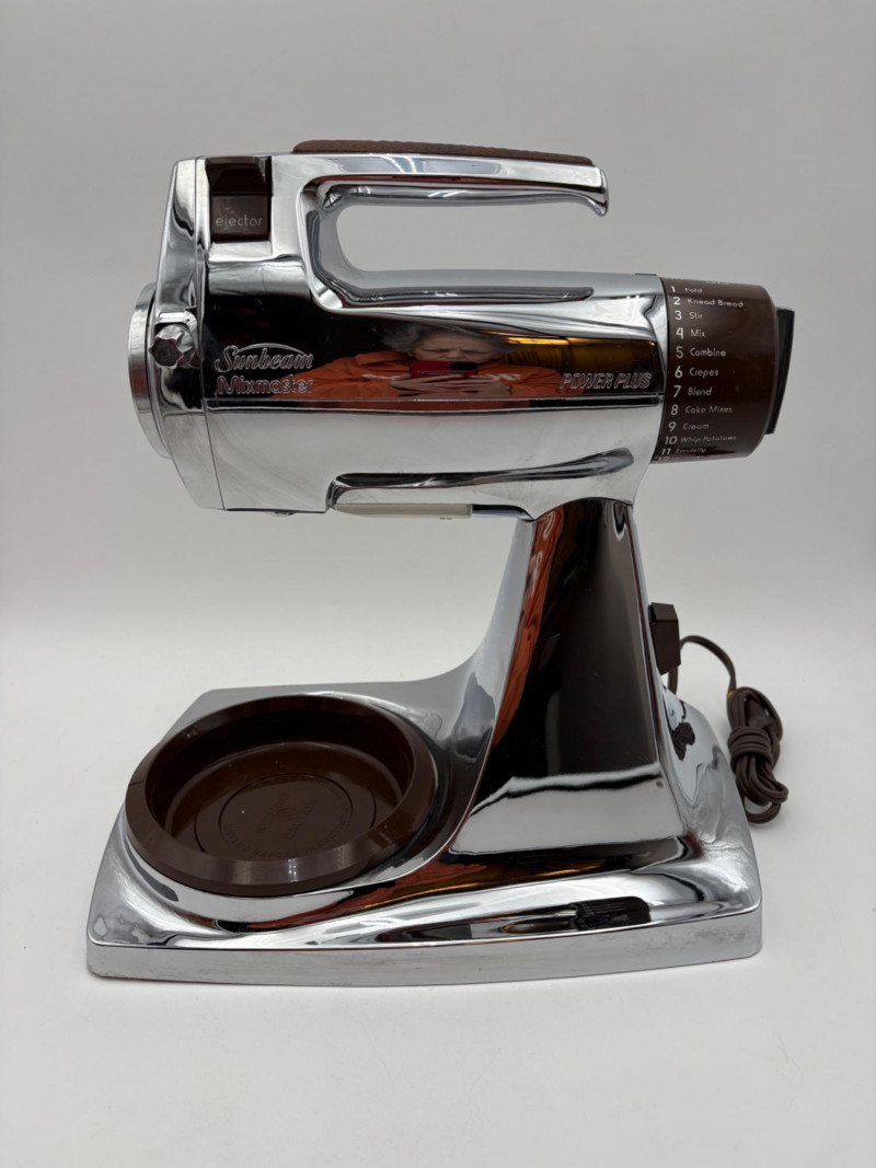 Wonderful mix of items for your vintage kitchen! - Sunbeam Mixmaster Power Plus stand mixer. Terrific MCM lines - also much lighter than the KitchenAid we own! Comes with large & small metal mixing bowls, pair of beaters, and pair of dough hooks. Powers on & changes speeds with dial at back of head. Measures 15" H x 14" W x 9" D. 2-prong cord and underhead light is working. Please note that the safety lock button on the back of the support has broken - see last photo in section - but the lock still works and button could probably be glued back on. Can operate with/without the button. Also needs new foot pad on base - see underneath photo. - Wagner Ware Magnolite lidded metal roasting pan - model # 4265 – P. Pan measures 8" H x 16" W x 11" D. Comes with fitted trivet inset. - Minute Minder timer from Lux in white with red lettering. - Stainless steel storage bowl trio set. 5/8 quart bowl, 1 quart bowl and 1 1/2 quart bowl. Lids present for larger and smaller bowls. - Betty Crocker compact food processor/mini chopper. Powers on & whirls. 1990s. - Kitchen King super quick manual mixer for whipping juices and mayonnaise. All parts appear to be present. 1976. - Ergonomic vintage metal eggbeater. Measures 10.25" L. - Classic Swing-Away metal can opener with white vinyl-covered handles. - Cast metal Coca-Cola wall mount bottle opener. - Rival hand crank grinder. Appears to work but needs to have the clamping mechanism on the bottom tightened. - Tupperware portion cups - approximately 2" H with lids and Tupperware spice grinder/spreader - approximately 8.5" H. - Small wall mount kitchen matchbox holder in pressed tin - measures 6". - Set of 4 copper mini-molds with hanging rack. - Ceramic spoon rest in the shape of an owl - approximately 6.5" H. Sunbeam