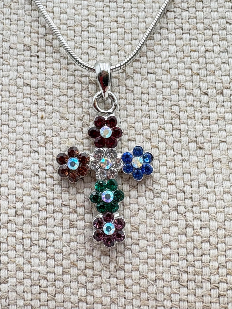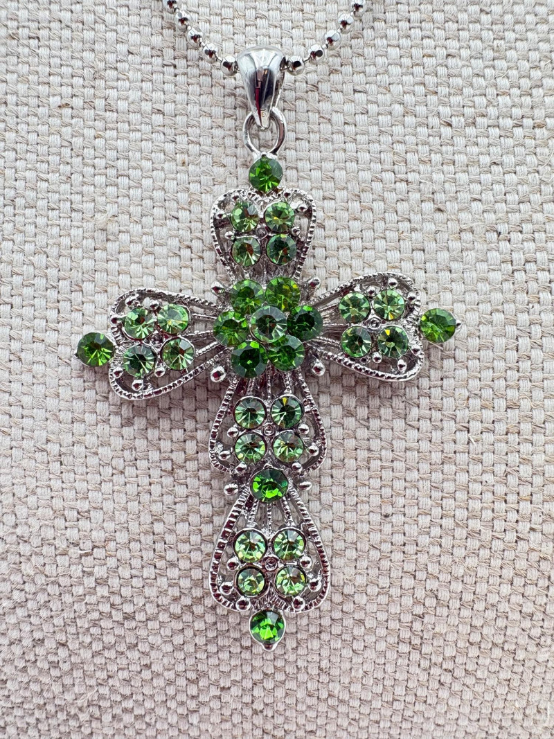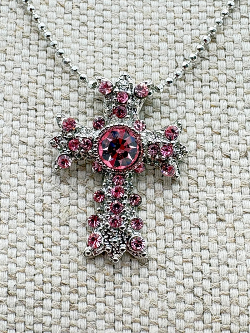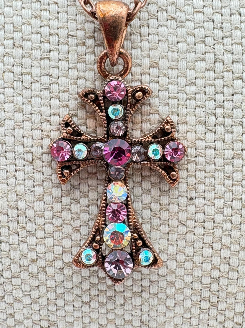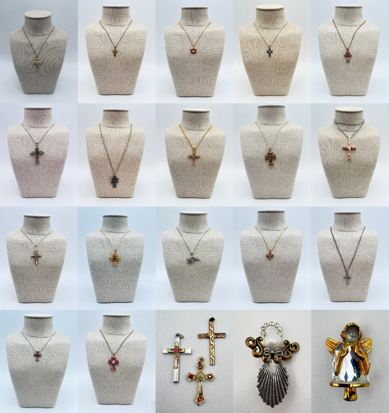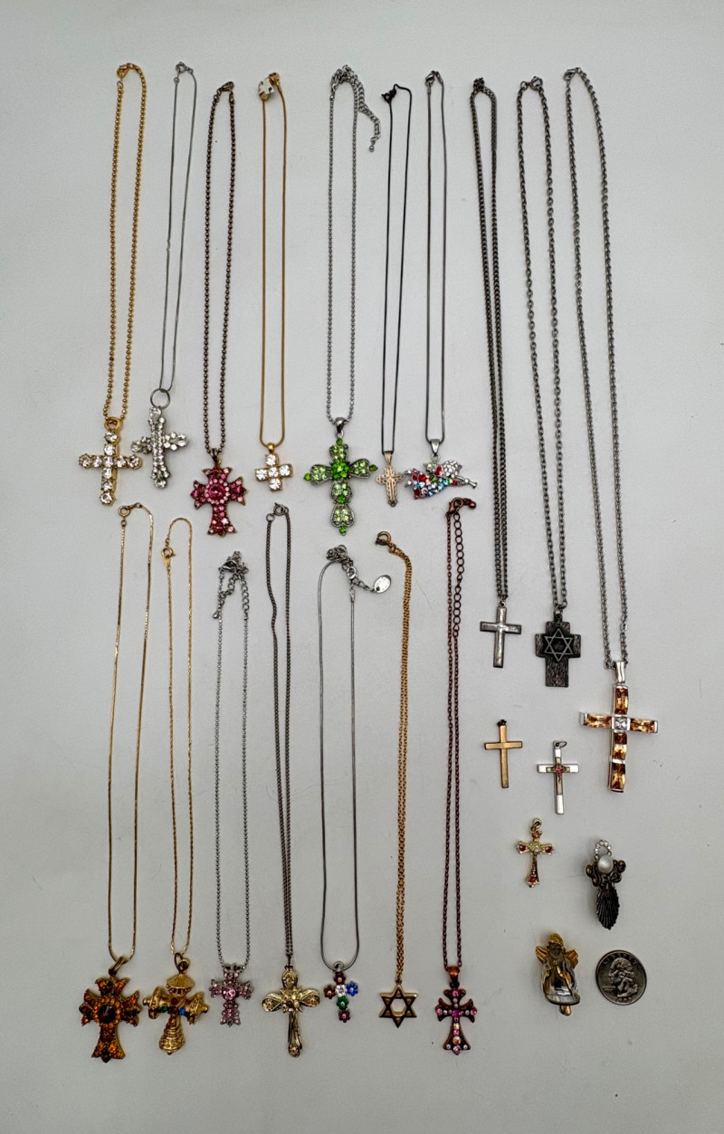 Great group of religious necklaces - 17 assorted necklaces, 3 necklace pendants with not chain, and 2 pins. All with one thing in common: SPARKLE or SHINE!! Different lengths, styles and colors, but all sure to catch one's eye. Good quality costume jewelry with a number vintage pieces. Please see photos for details.