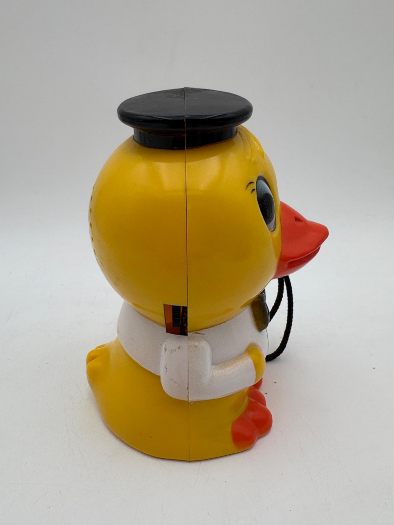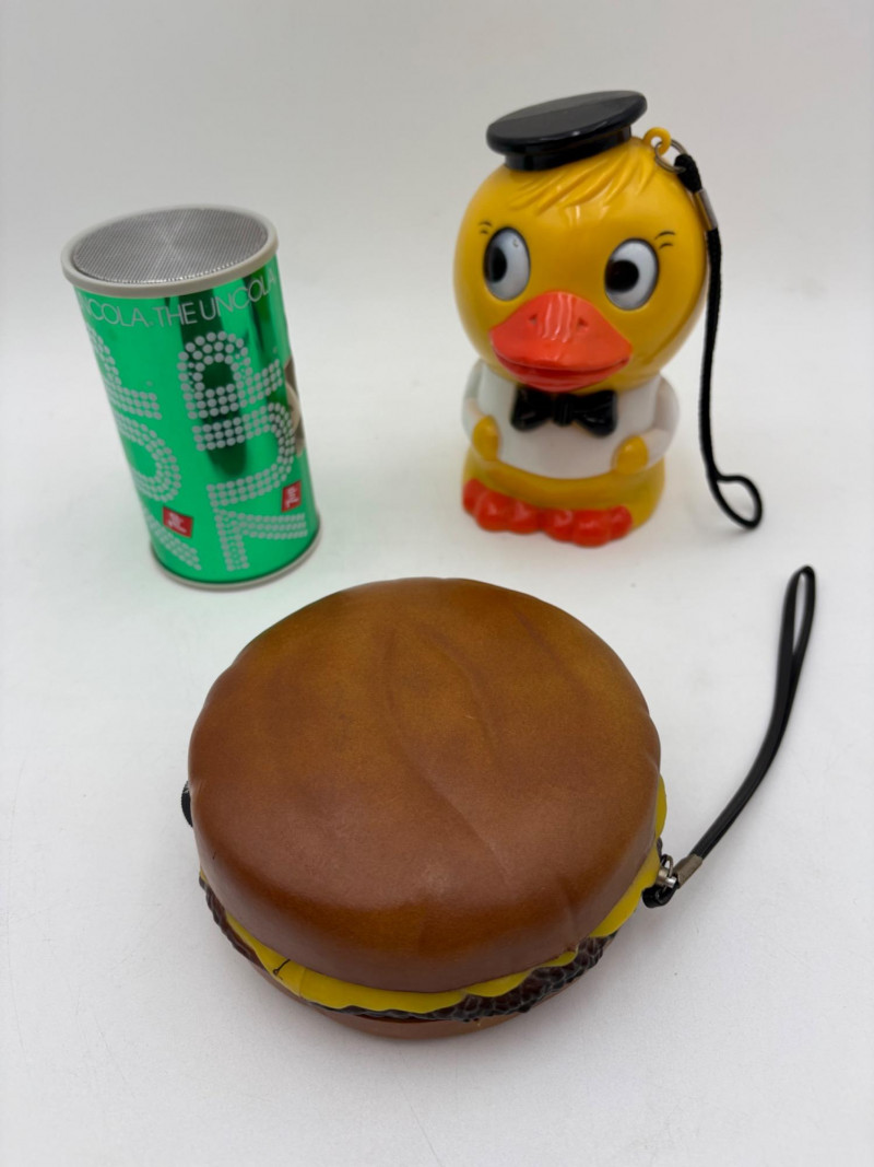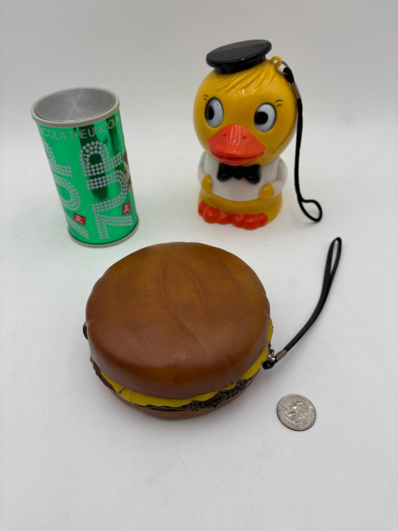 This trio of portable radios all work just fine (although there isn't nearly as much out there on the radio waves as there used to be!). We think they would be great emergency radios and love how they remind us of being little kids when having a portable radio was amazingly cool - especially in an interesting shape. These 3 are definitely "cool" and all were made in Hong Kong when that was the toy manufacturing center of the world. Vintage Tune-A-Duck radio from the 1970s runs on 3 AA batteries and has a wrist strap. He stands approx. 6" H. Vintage 7-up solid state transistor radio measures just under 5" tall and runs on a single 9V battery. 1970s Vintage Burger King Whopper promotional hamburger radio measures approx. 5" across and runs on a single 9V battery. 1970s. 1970s Solid State 7UP Transistor AM Radio | the Uncola Can Radio - Etsy offered elsewhere Duck Shape