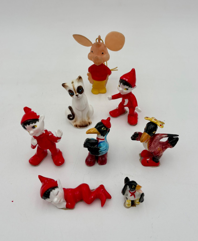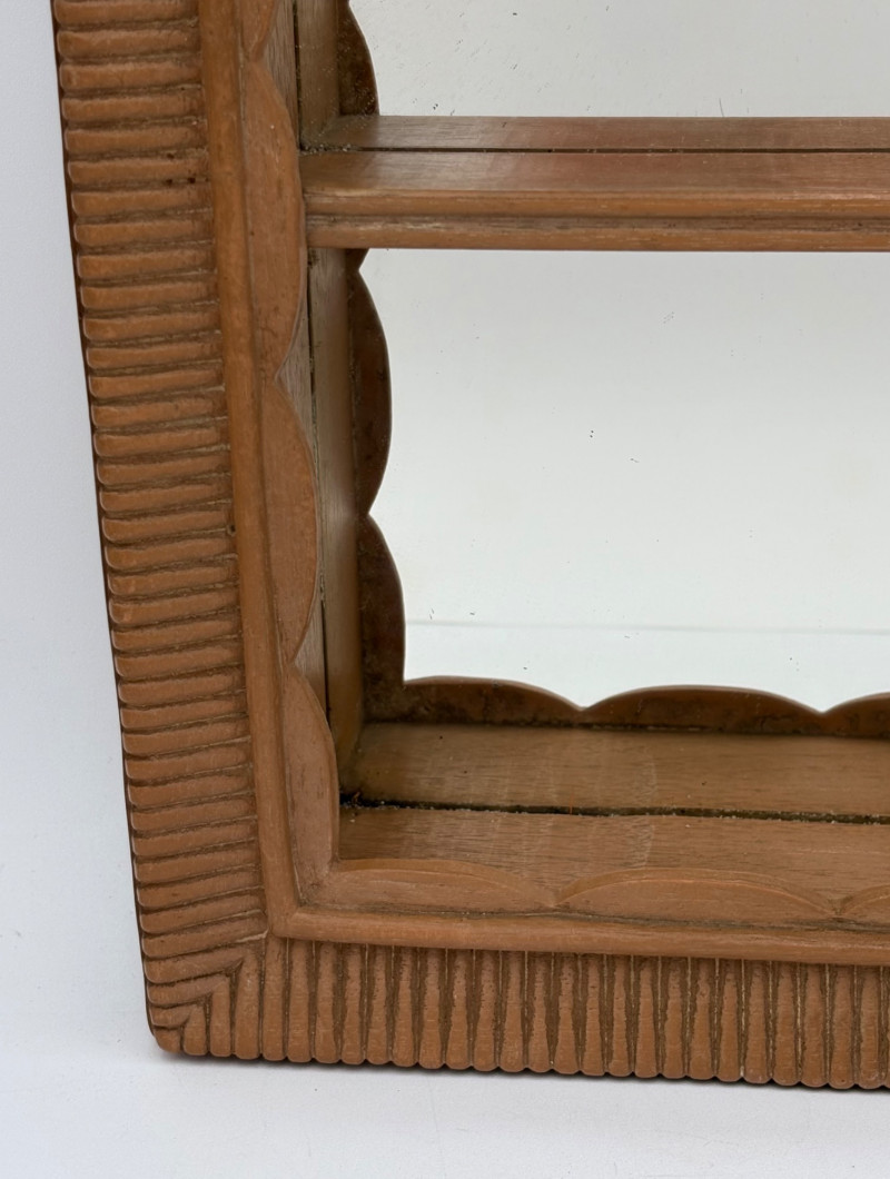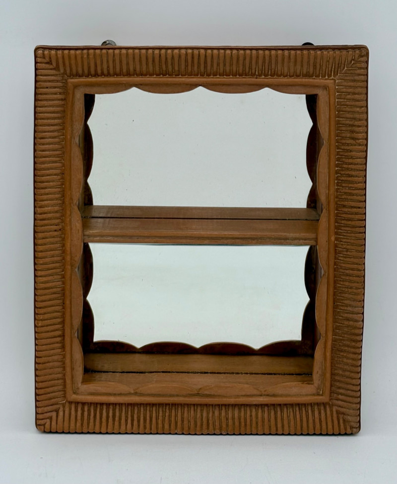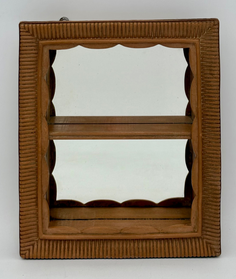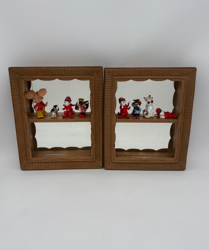 Pair of mirrored MCM wall shelves from SyrocoWood Company of Syracuse. Scalloped interior trim edge with fluted frame. Measure 12” H x 10.5” W x 2.5” D. We added a few vintage starter pieces for you - 3 elves, what appear to be Heckle & Jeckle, a sweet kitty, and 1950s Italian mouse star Topo Gigio! They are in ok shape with no breaks, but some have substantial paint loss - see photos. Syroco