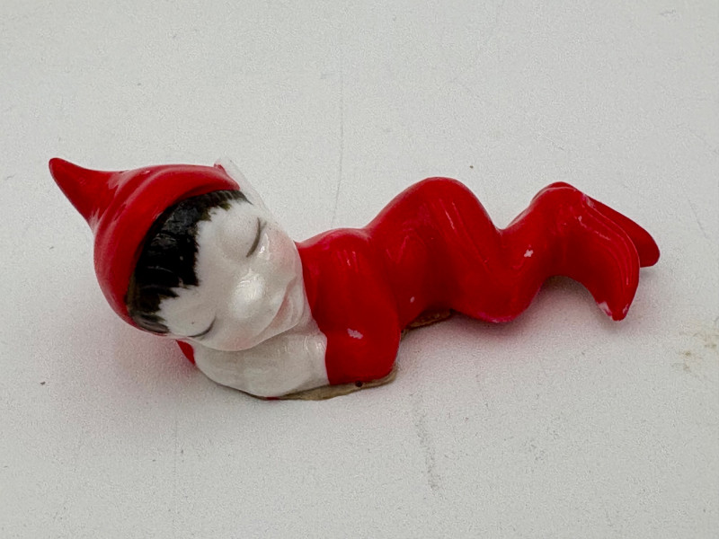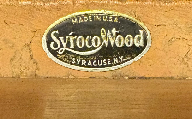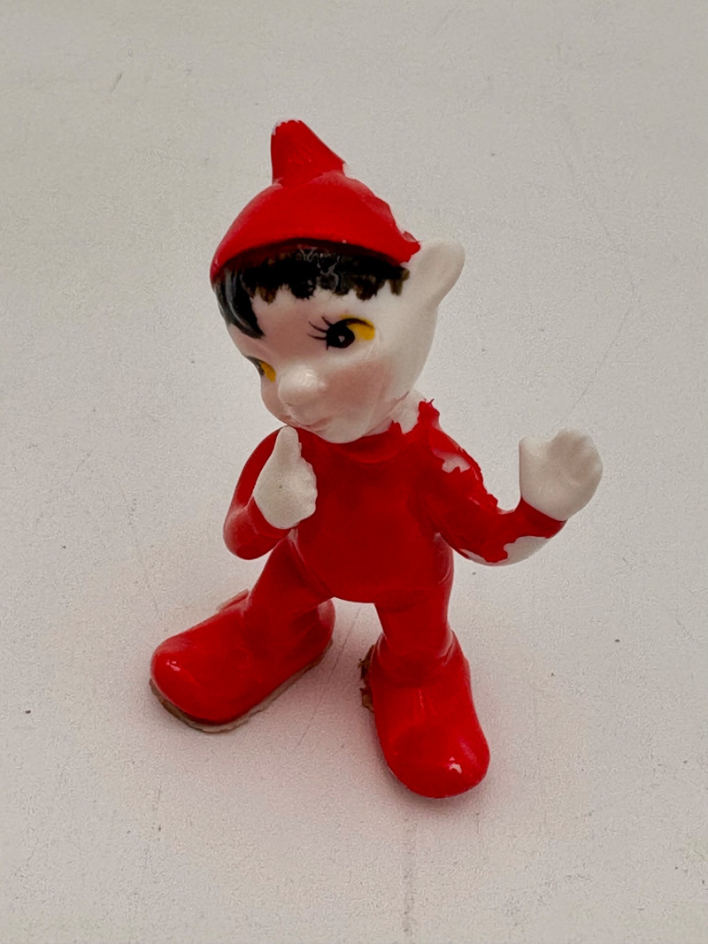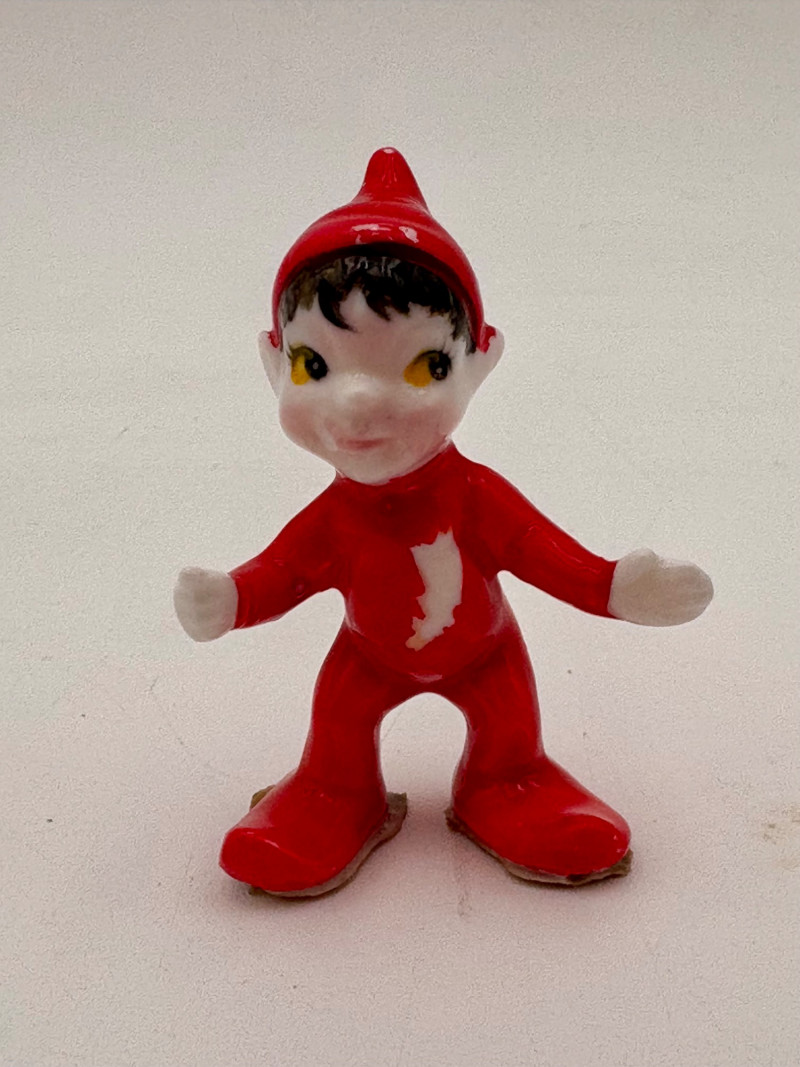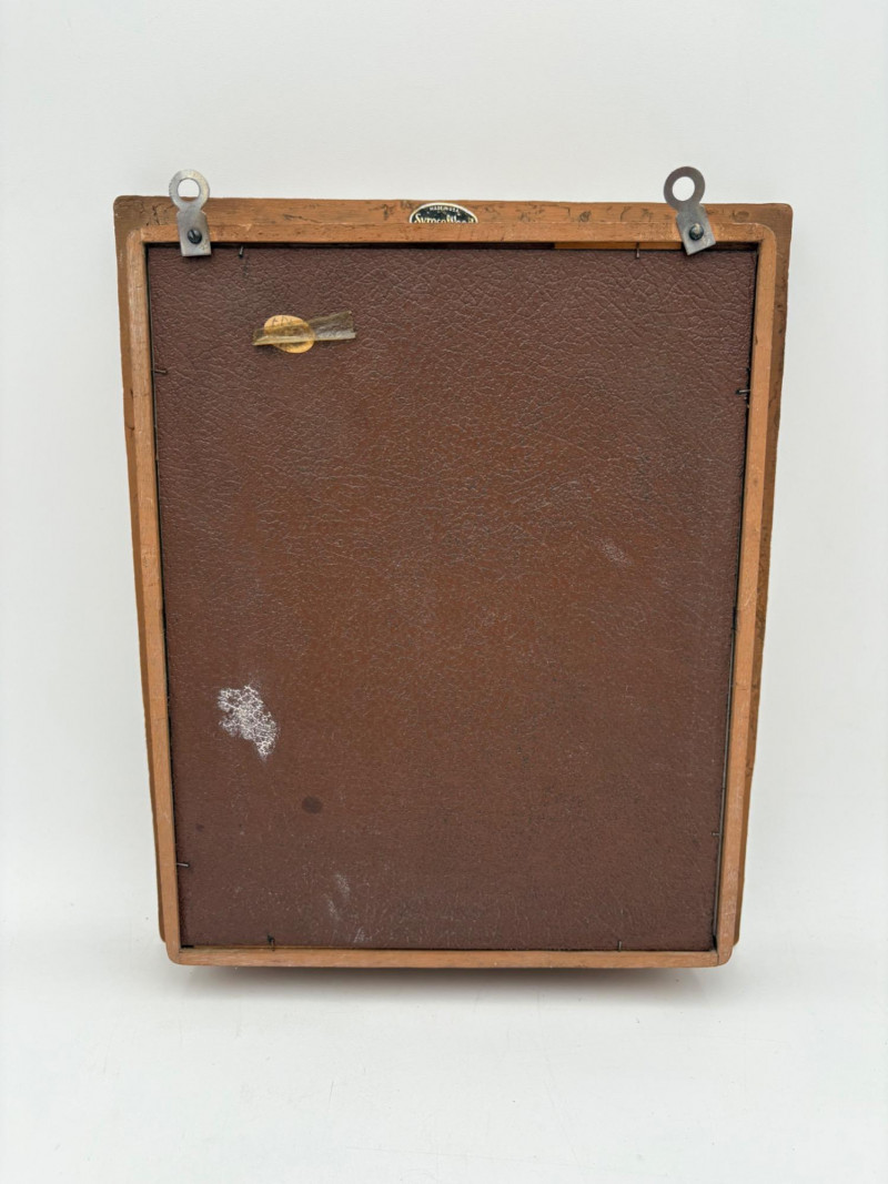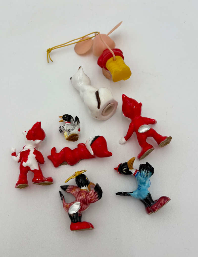 Pair of mirrored MCM wall shelves from SyrocoWood Company of Syracuse. Scalloped interior trim edge with fluted frame. Measure 12” H x 10.5” W x 2.5” D. We added a few vintage starter pieces for you - 3 elves, what appear to be Heckle & Jeckle, a sweet kitty, and 1950s Italian mouse star Topo Gigio! They are in ok shape with no breaks, but some have substantial paint loss - see photos. Syroco