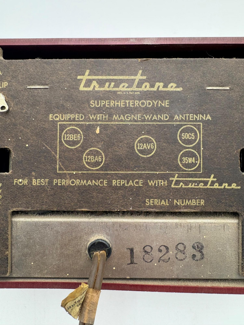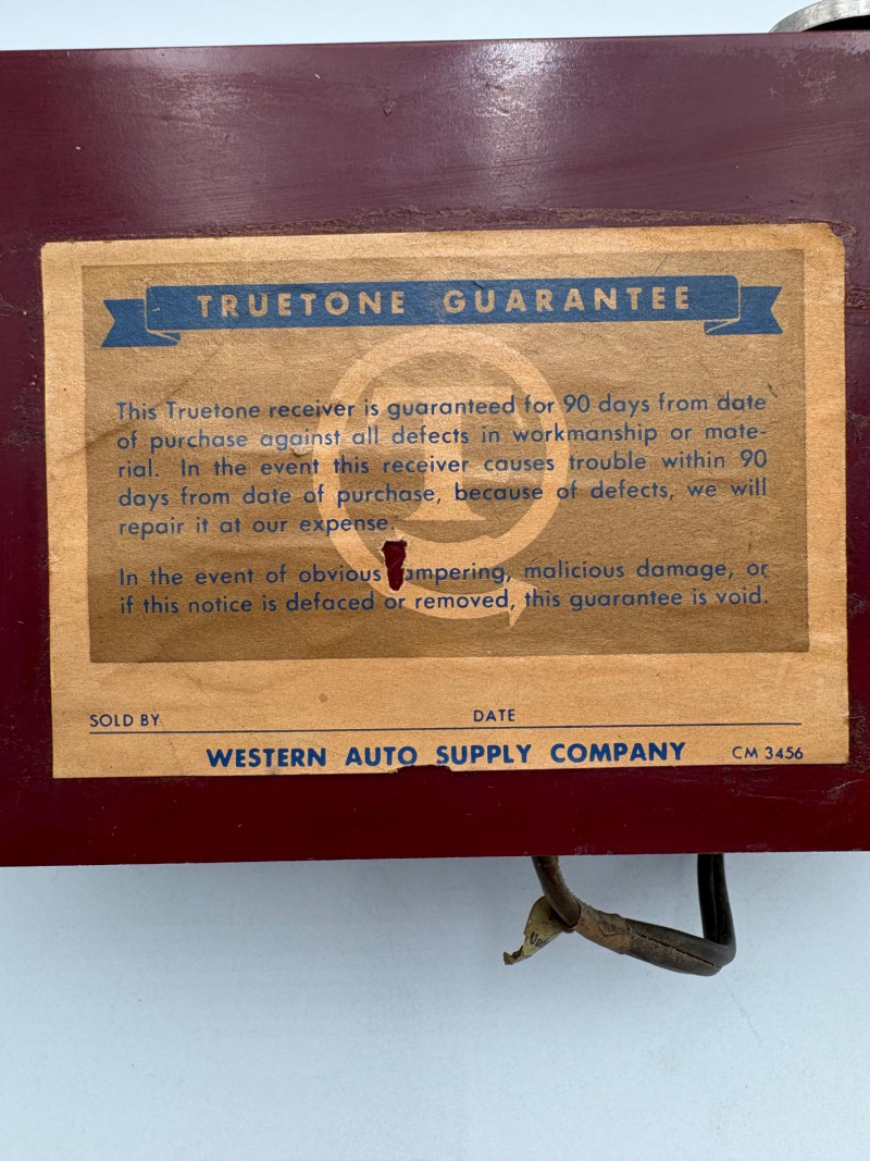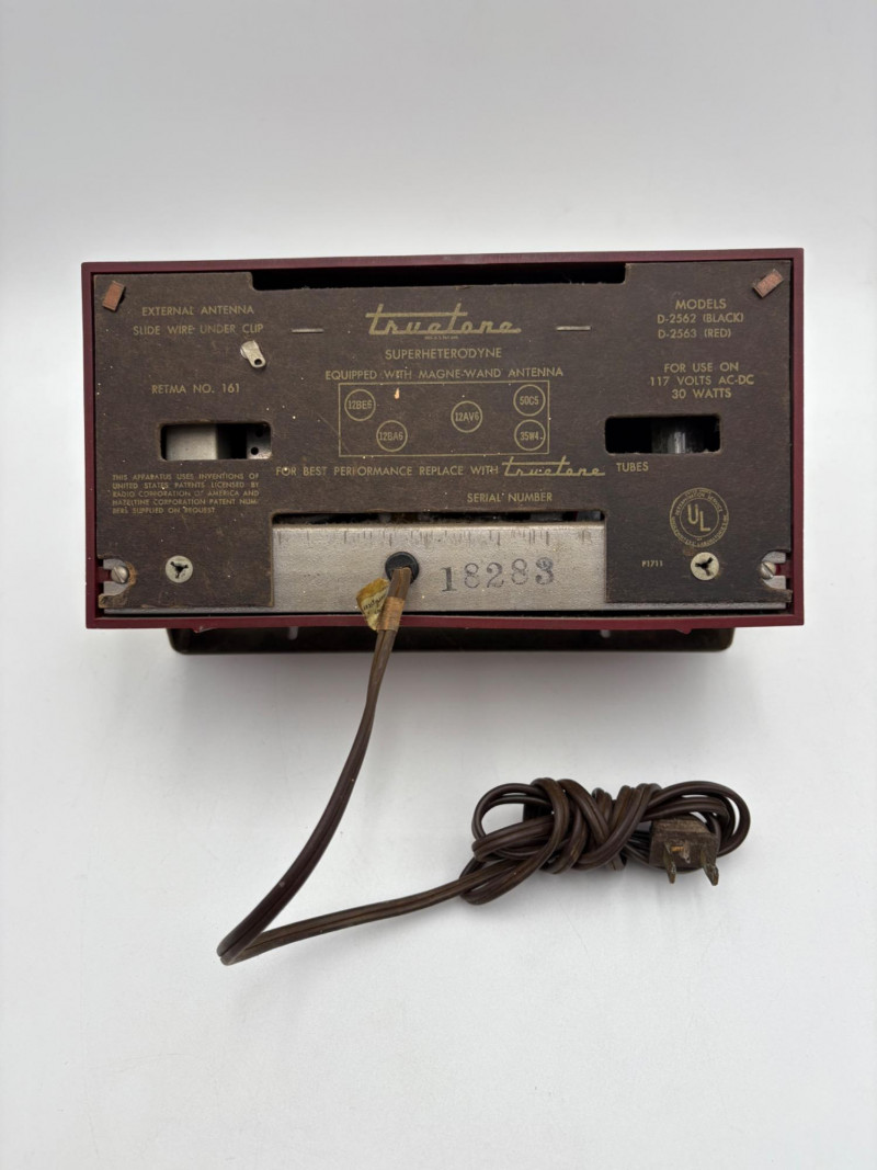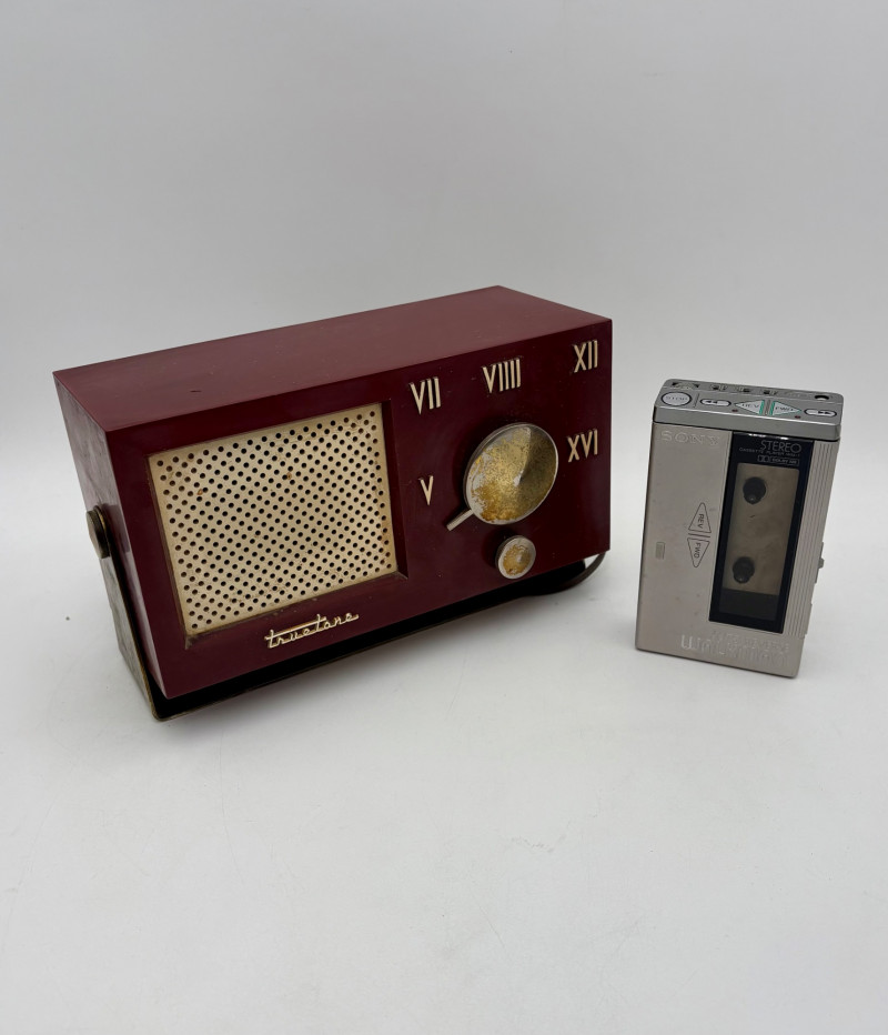 OK, right up front we are going to say that we don't know if these items work; if you decide to bid on them you take the chance that they don't (we normally like to make sure electronics work but could not text these as noted below). The TrueTone D-2563 red superheterodyne radio receiver from Western Auto dates from the mid-1950s. It also appears to be in great condition - however, when we plugged it in, we got no static or reaction of any kind. Since this is a tube radio, perhaps that's the issue (it has 5 tubes). Perfect for you electronics geeks out there to go to work on. The case appears to be a Bakelite (early plastic) and the trim is brass. Measures approx. 6" H x 9.5" W x 4" D. The Sony Walkman WM-7 appears to be in good condition; cassette tapes pop in & out & it comes with the original zip case. Unfortunately, we could not find an adapter to charge this and there doesn't appear to be a battery compartment like the Walkmans we remember. This particular model was the first to have that fabulous invention - autoreverse! No removing the cassette & turning it over! If this works, it's worth a bit of cash - apparently folks are rediscovering cassette tapes just like they are vinyl....