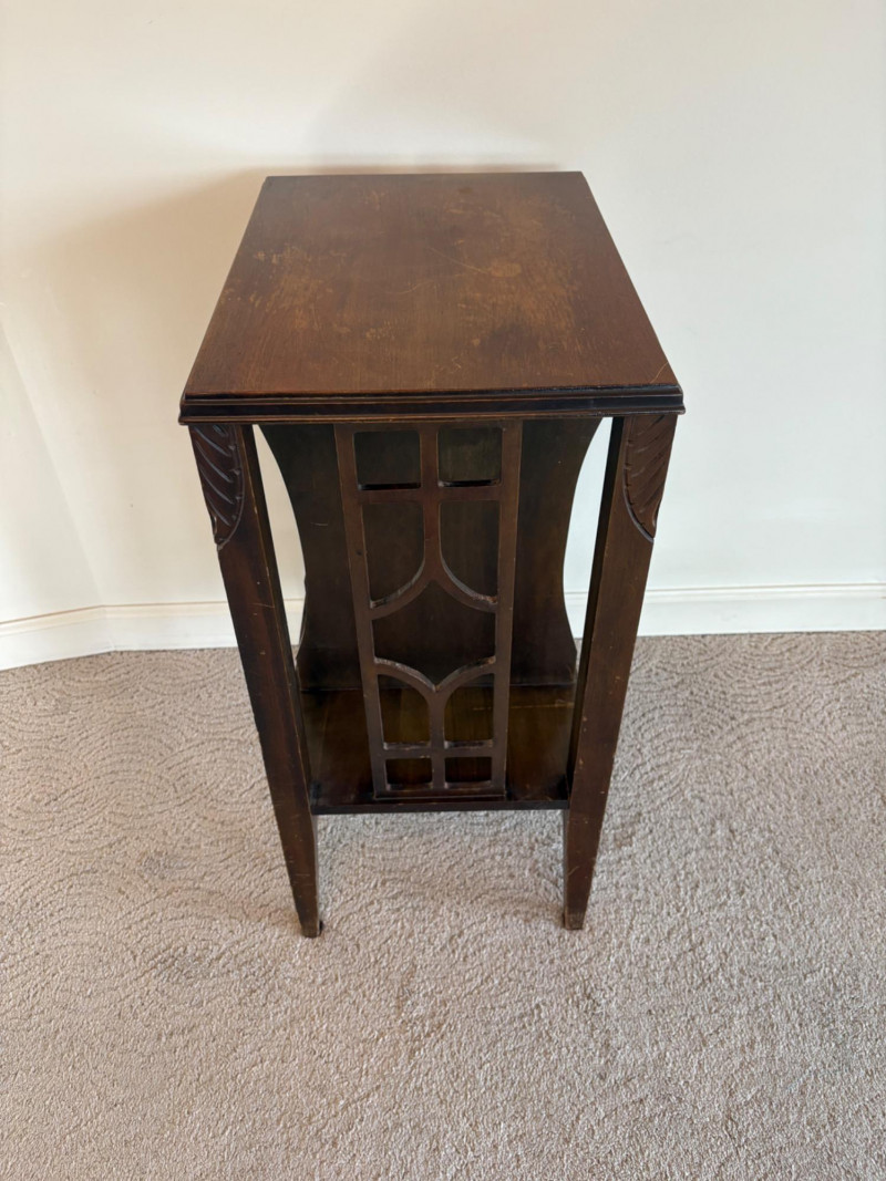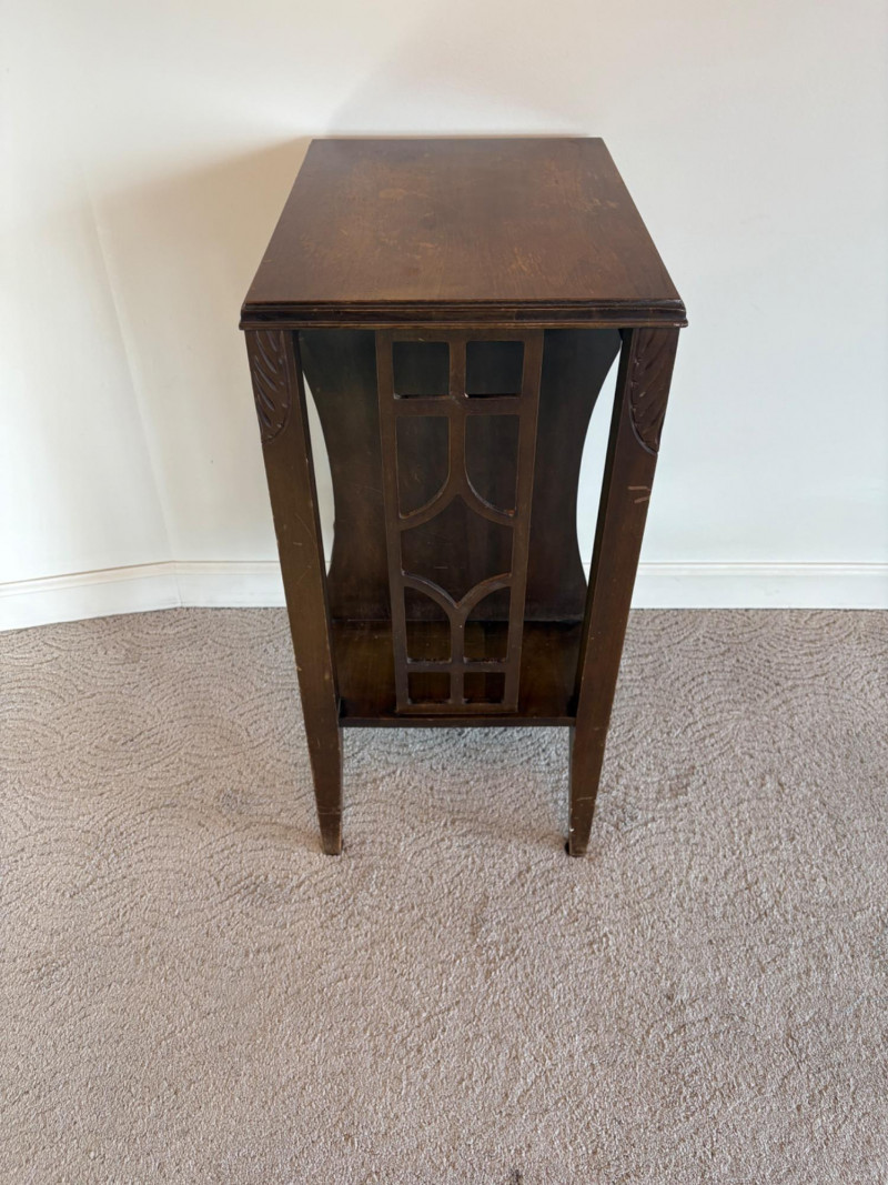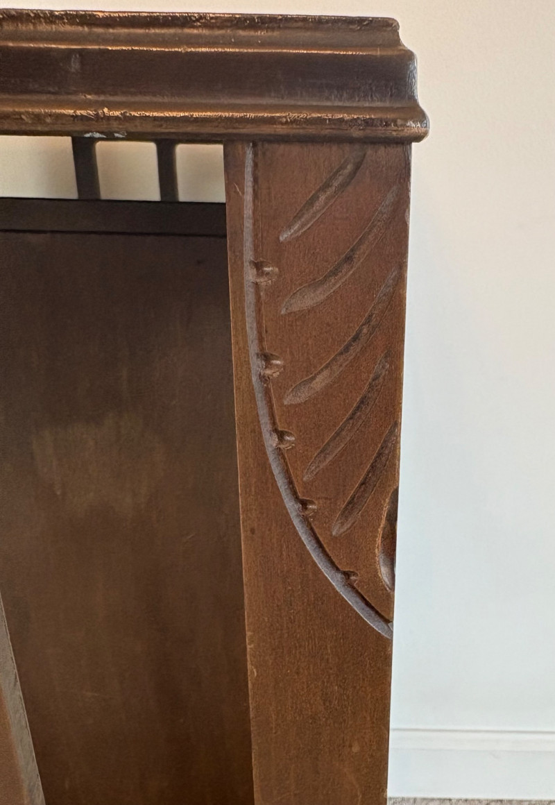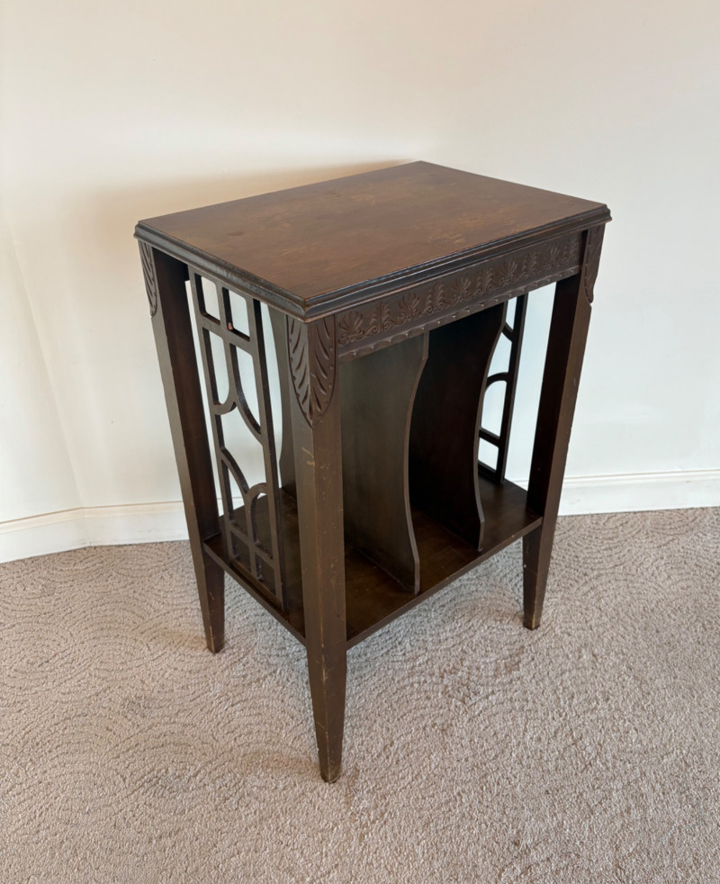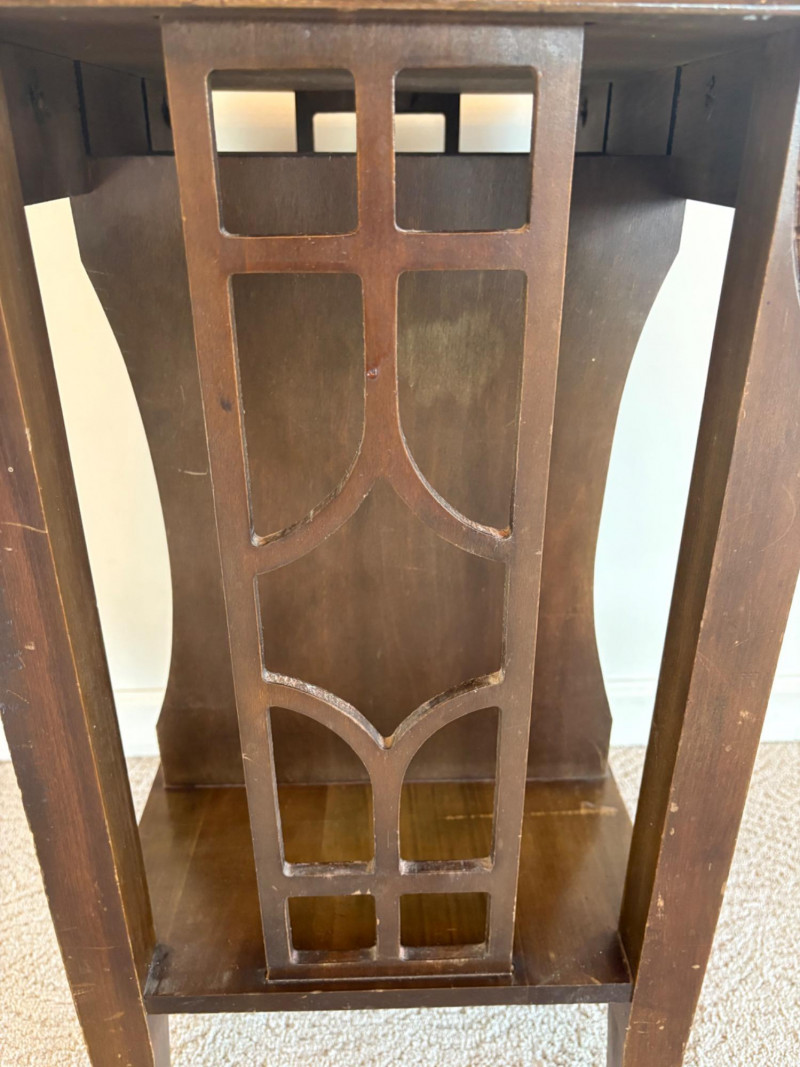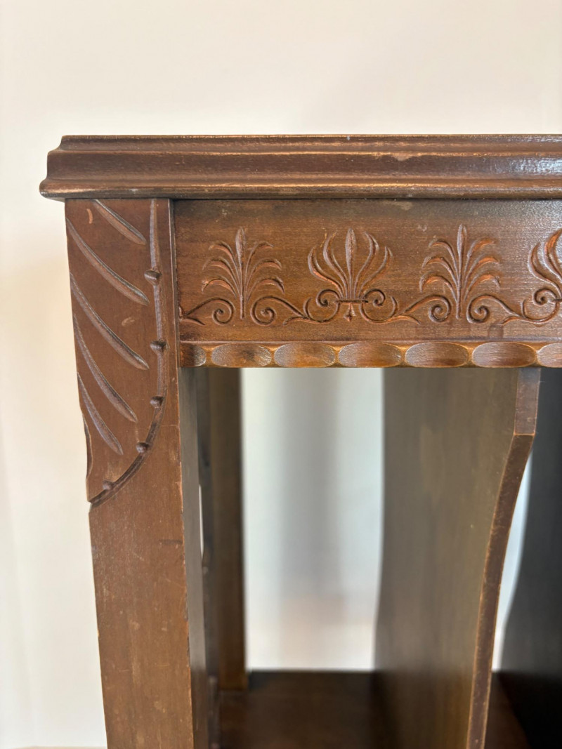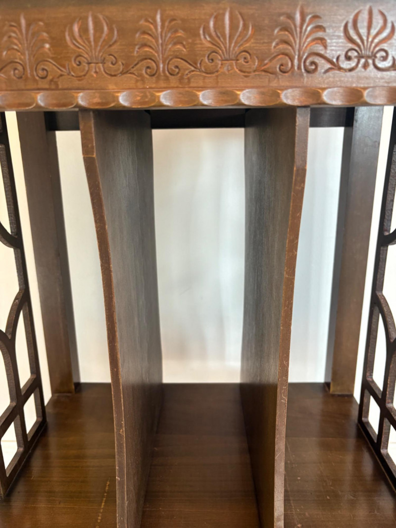 This is a sweet compact sidetable that has lovely details like cut-outs and carving. Added bonus is that it is finished on all sides, so you can have it in the middle of a room without a "bad" unfinished side showing. Made of solid wood, it is still sturdy and would love to have some TLC in the way of refinishing/painting to be a star of the living room. No maker mark. Measures 27" H x 18" W x 13" D.