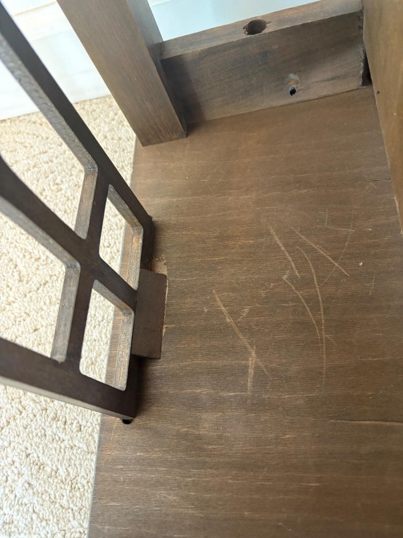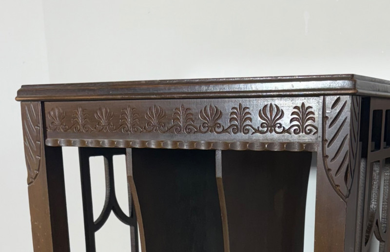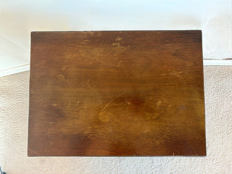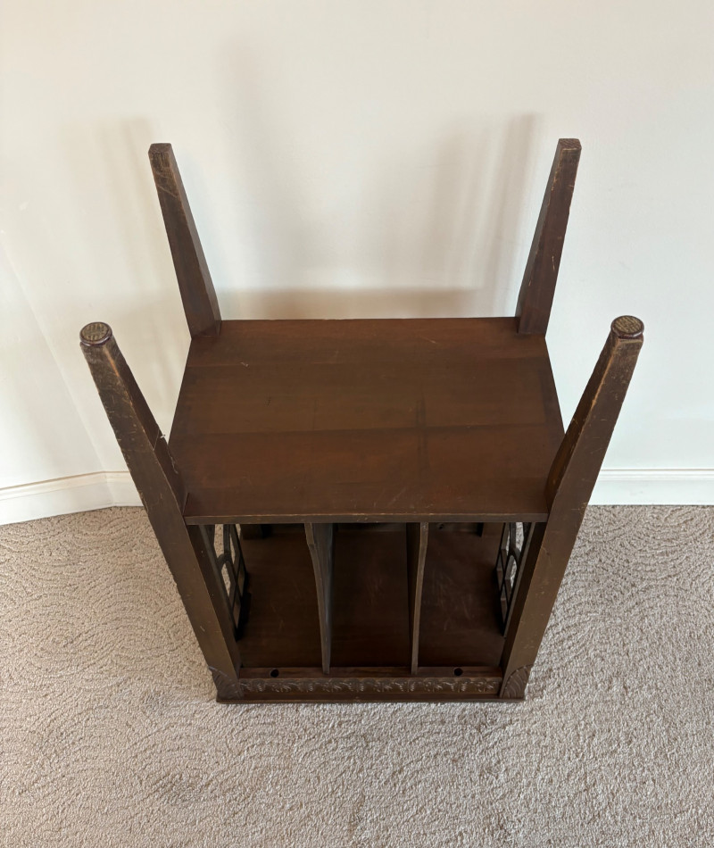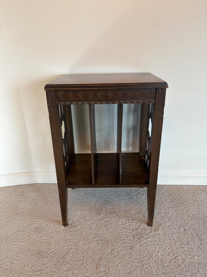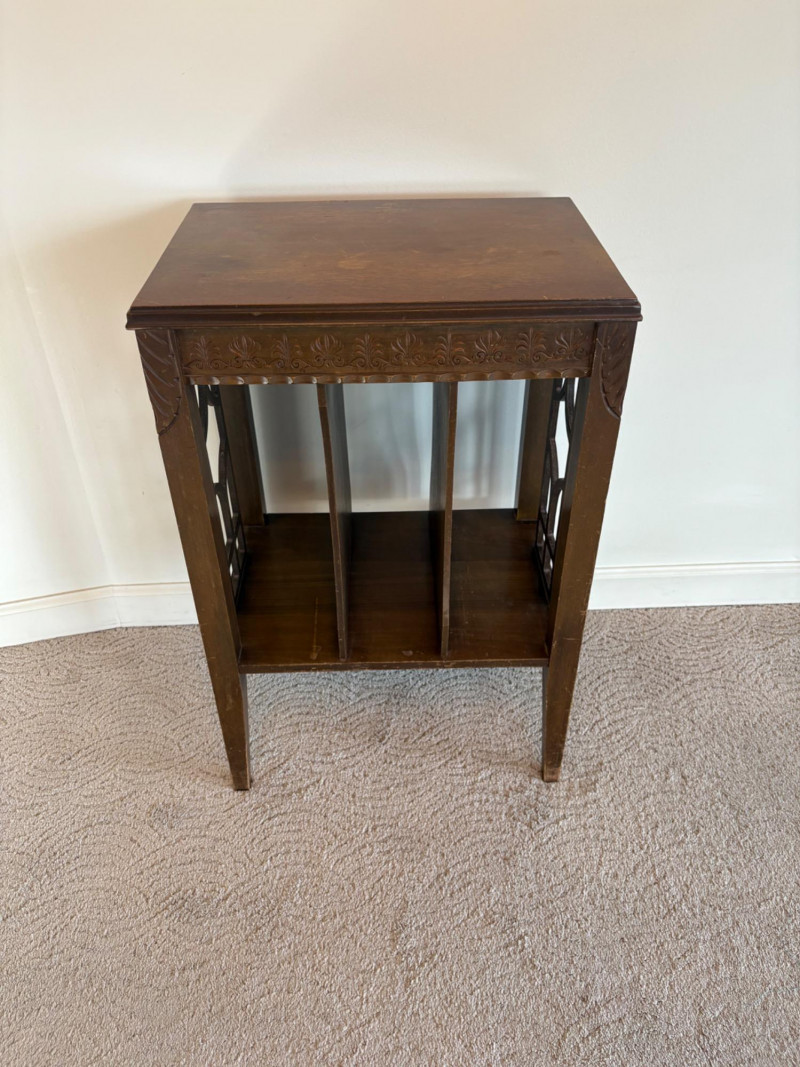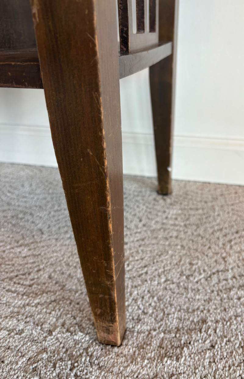 This is a sweet compact sidetable that has lovely details like cut-outs and carving. Added bonus is that it is finished on all sides, so you can have it in the middle of a room without a "bad" unfinished side showing. Made of solid wood, it is still sturdy and would love to have some TLC in the way of refinishing/painting to be a star of the living room. No maker mark. Measures 27" H x 18" W x 13" D.