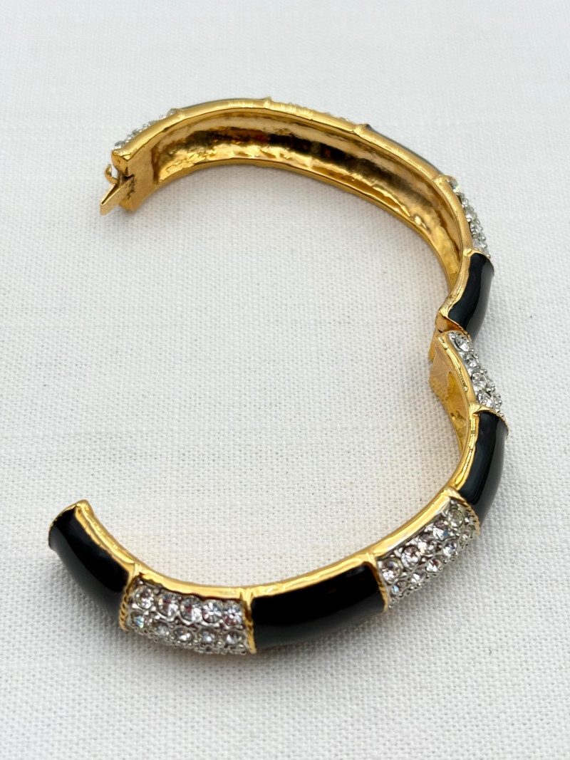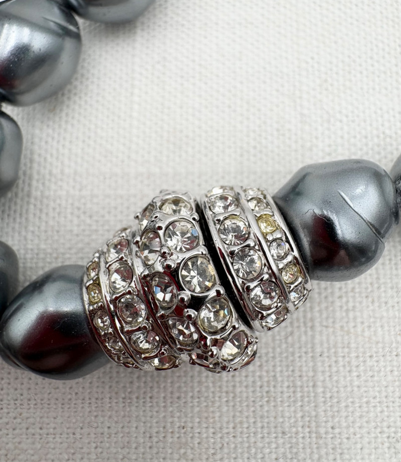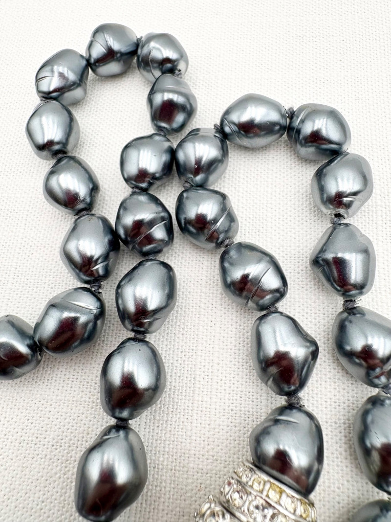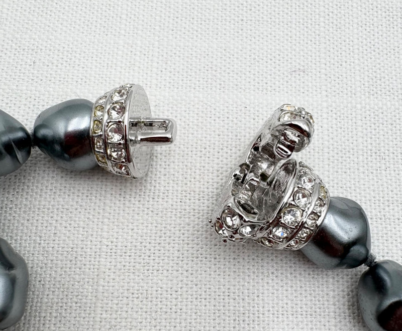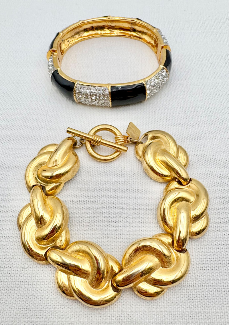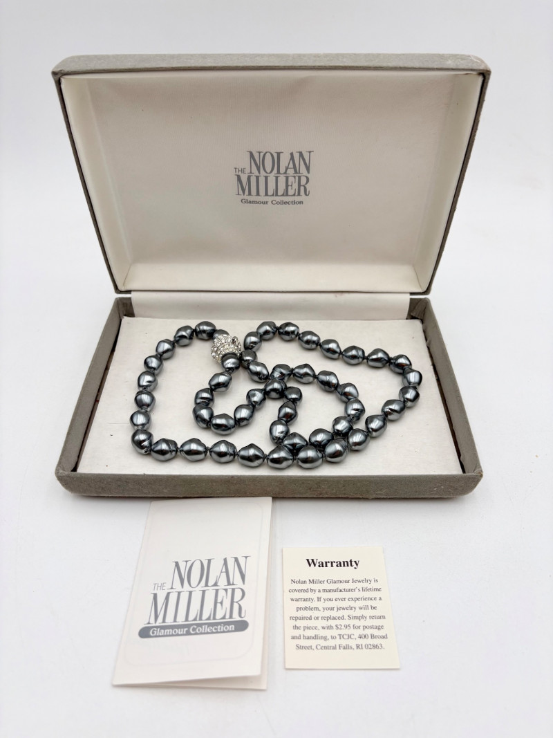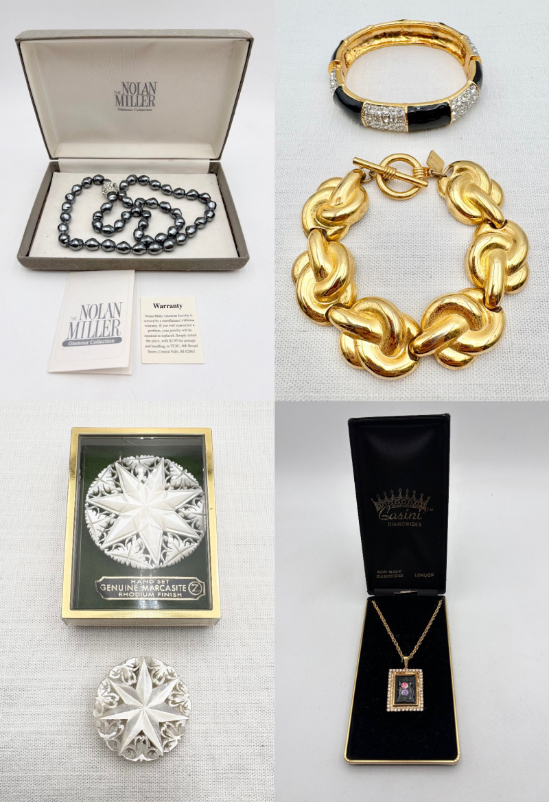 This grouping of jewelry doesn't have a lot in common except for classic understated design. Set of baroque pearls from Nolan Miller in grey with sparkly clasp. Measures 29" L end to end. Comes with original grey box and information, but box is only in ok condition. Sparkly black & gold-tone bracelet with rhinestones has hinged side and slide-in clasp. Measures just over 2" across horizontally. Made in hefty cast metal, but no maker mark. Anne Klein gold-tone bracelet in pseudo-braid with toggle. Measures approx. 7.5" from toggle to loop. Black enamel floral necklace from Casini of London. Square pendant has flowers that appear to be hand-painted with French enamel. The surround on pendant is composed of man-made diamonds. Chain measures 24" from clasp to loop. Pair of marcasite pins - the larger can also be used as a necklace if hung on a chain. Neither has a maker mark, but the smaller says "Made in Bethlehem" on the reverse. Larger measures 2" wide while the smaller measures 1.5" W.