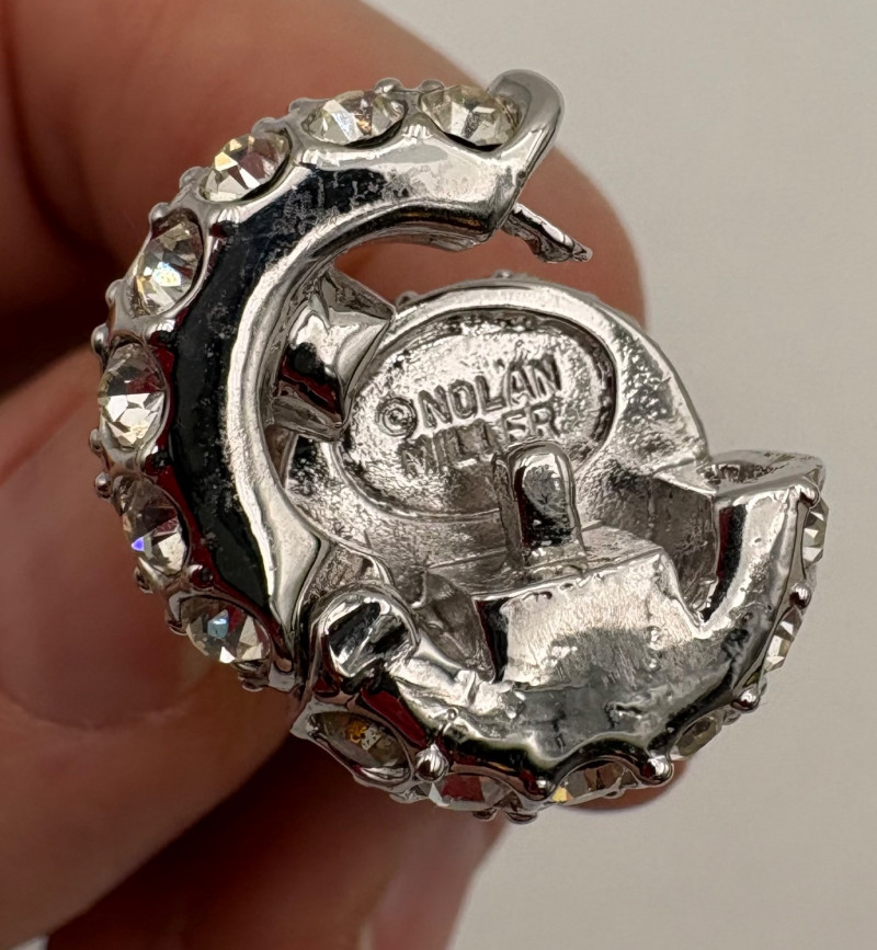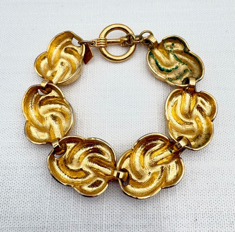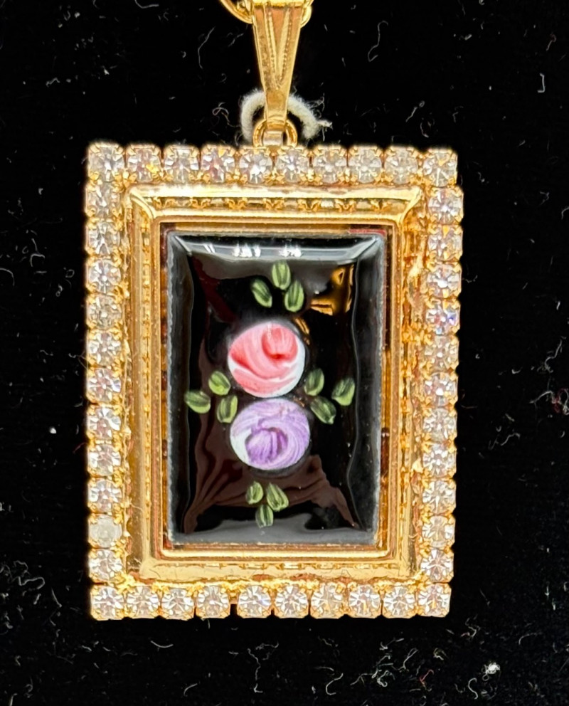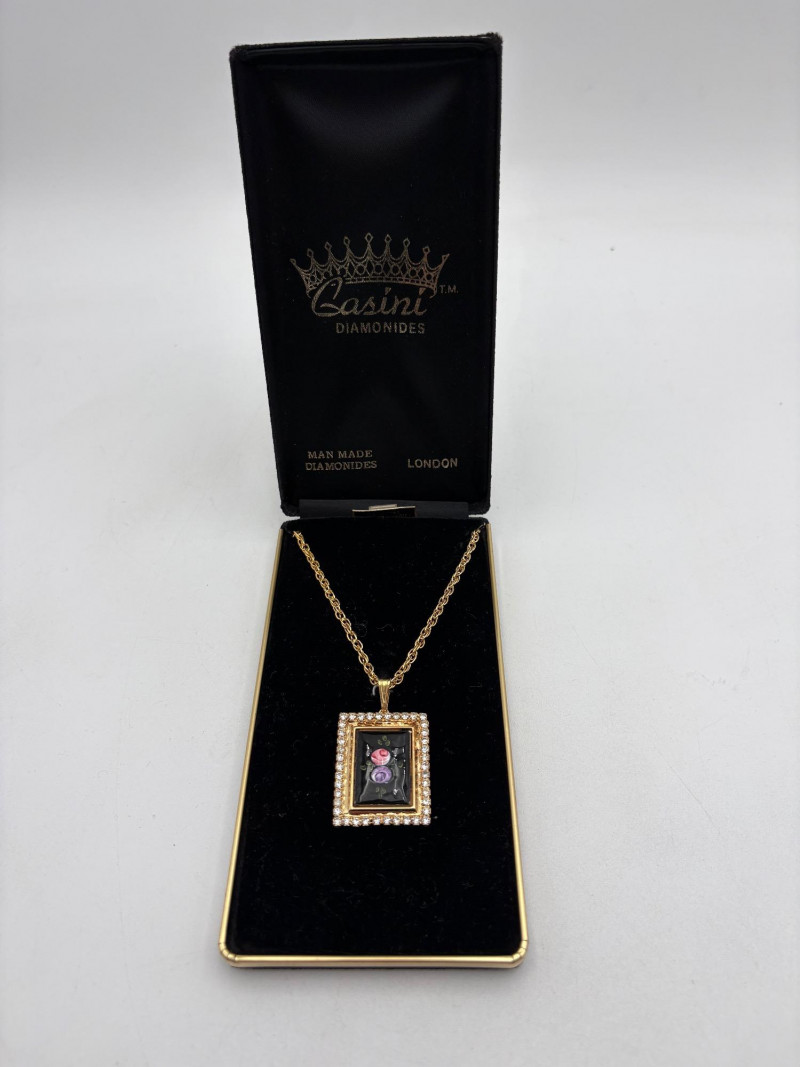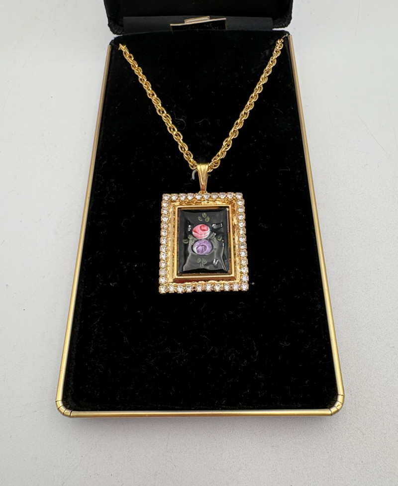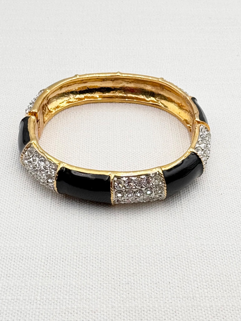 This grouping of jewelry doesn't have a lot in common except for classic understated design. Set of baroque pearls from Nolan Miller in grey with sparkly clasp. Measures 29" L end to end. Comes with original grey box and information, but box is only in ok condition. Sparkly black & gold-tone bracelet with rhinestones has hinged side and slide-in clasp. Measures just over 2" across horizontally. Made in hefty cast metal, but no maker mark. Anne Klein gold-tone bracelet in pseudo-braid with toggle. Measures approx. 7.5" from toggle to loop. Black enamel floral necklace from Casini of London. Square pendant has flowers that appear to be hand-painted with French enamel. The surround on pendant is composed of man-made diamonds. Chain measures 24" from clasp to loop. Pair of marcasite pins - the larger can also be used as a necklace if hung on a chain. Neither has a maker mark, but the smaller says "Made in Bethlehem" on the reverse. Larger measures 2" wide while the smaller measures 1.5" W.